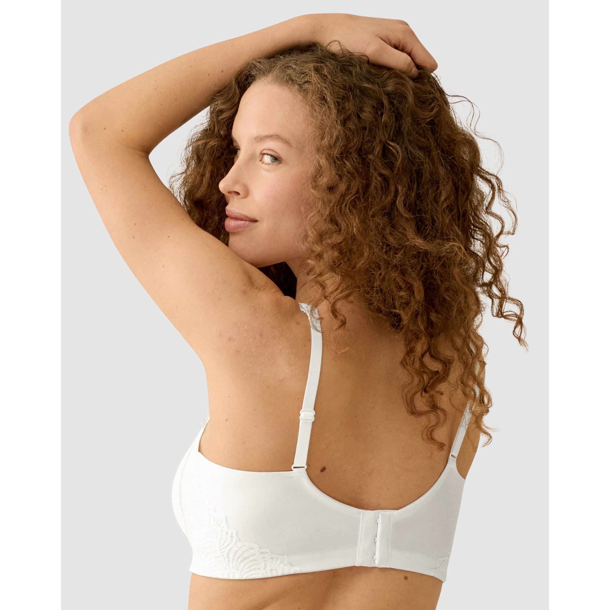 A perfect fusion of style and functionality that does it all: this smoothing bra has lightly-moulded, wirefree cups with a high centre panel for secure support, tall side wings specially designed to create a sleek underarm silhouette, and padded shoulder straps for superior comfort. What's more, it's decorated with GRS-certified lace (with a touch of shimmer) for an everyday look you'll love to wear.