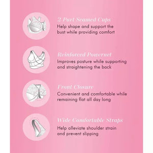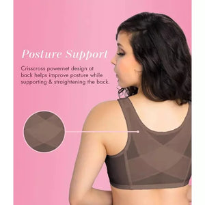 This plus size posture bra is the perfect way to enjoy better bust support and a straighter back. It's a front closure bra with hook-and-eyes between the cups, which are wirefree and made from a sturdy, supportive fabric on the lower half and a breathable sheer lace on the upper section. This posture-improving bra has an extra-tall back with criss-cross elastic, which has the added benefit of creating a smooth line under your clothing, and is finished with padded straps for added comfort.