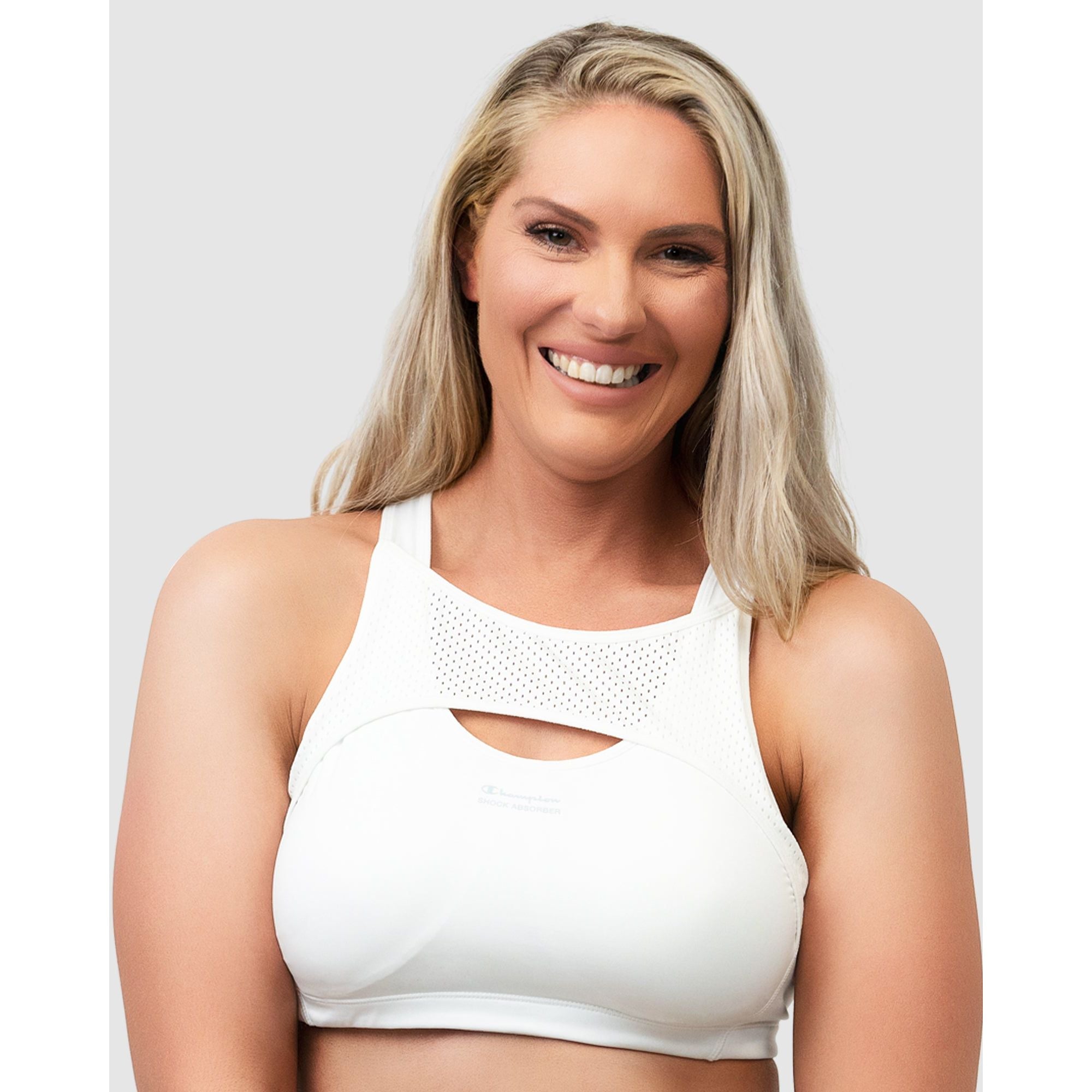 High impact support meets a stylish look in this Champion X Shock Absorber sports bra, which significantly reduces bounce by up to 65.2%. A double-layered but still very breathable sports bra, it has moulded, padded cups plus a mesh panel across the upper bust to further boost support.