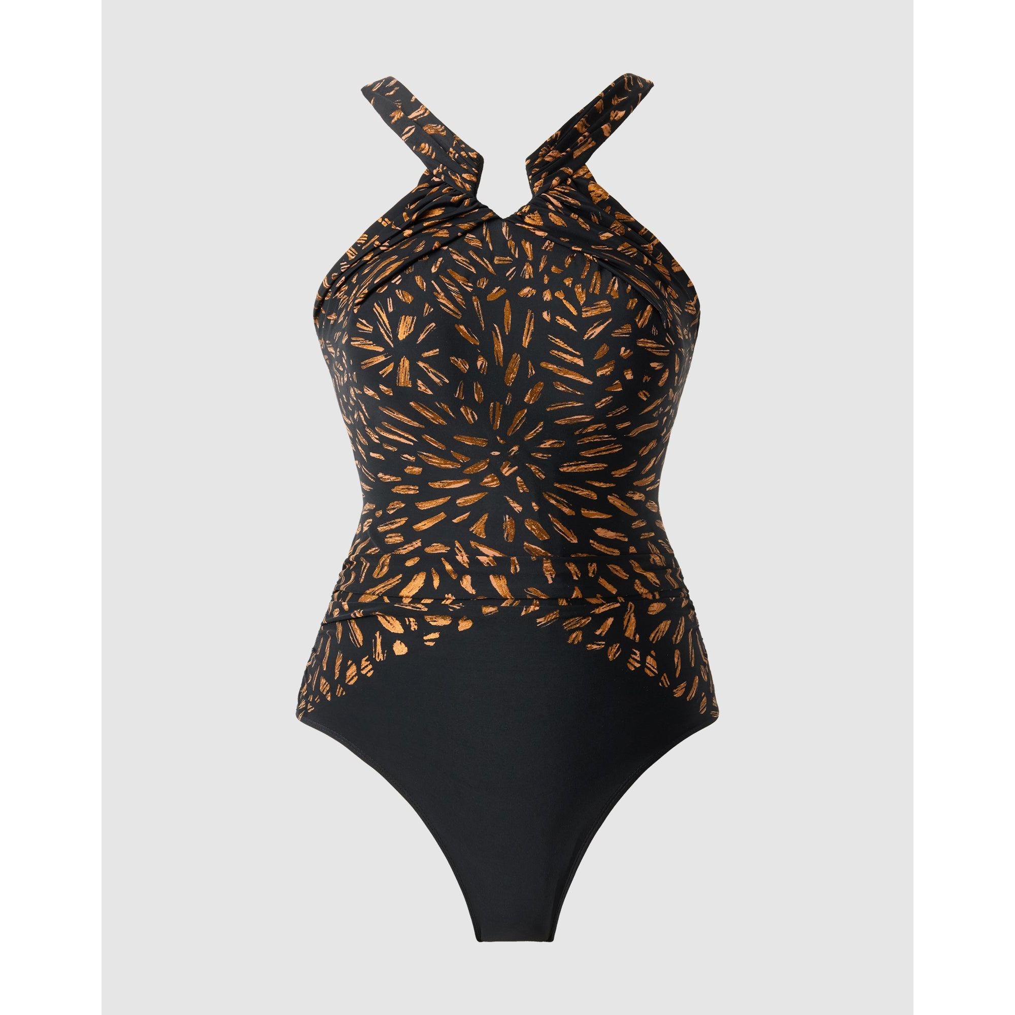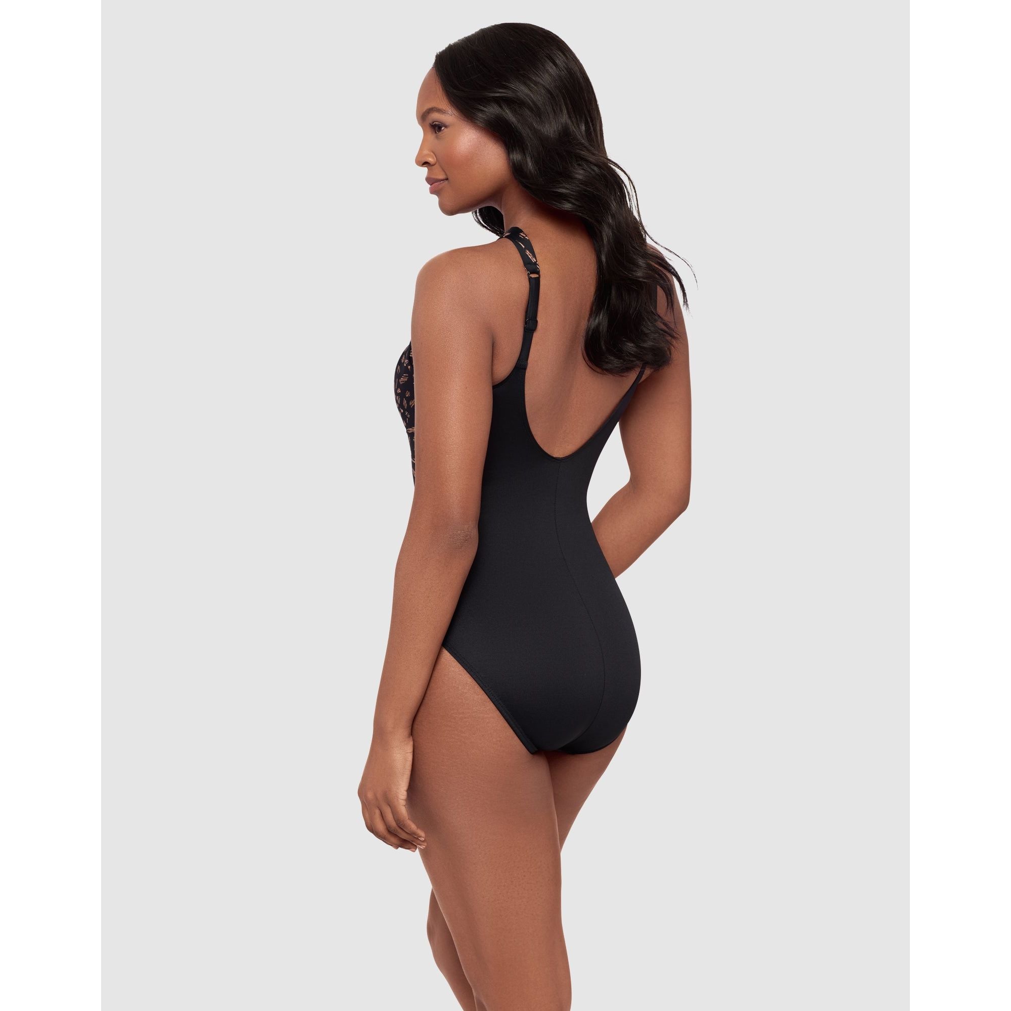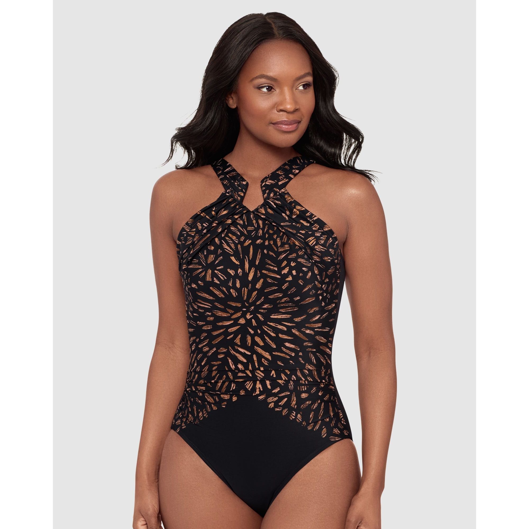 Flatter your tummy and waist in this elegant one-piece swimsuit. Designed by one of the world's leading shapewear brands, it's made from slimming and smoothing Miratex fabric®. The eye-catching high neck design resembles a halter, but has standard straps at the back so that no weight is getting put on your neck. Tummy-flattering ruching completes the look, for a bathing suit you'll feel truly beautiful in.