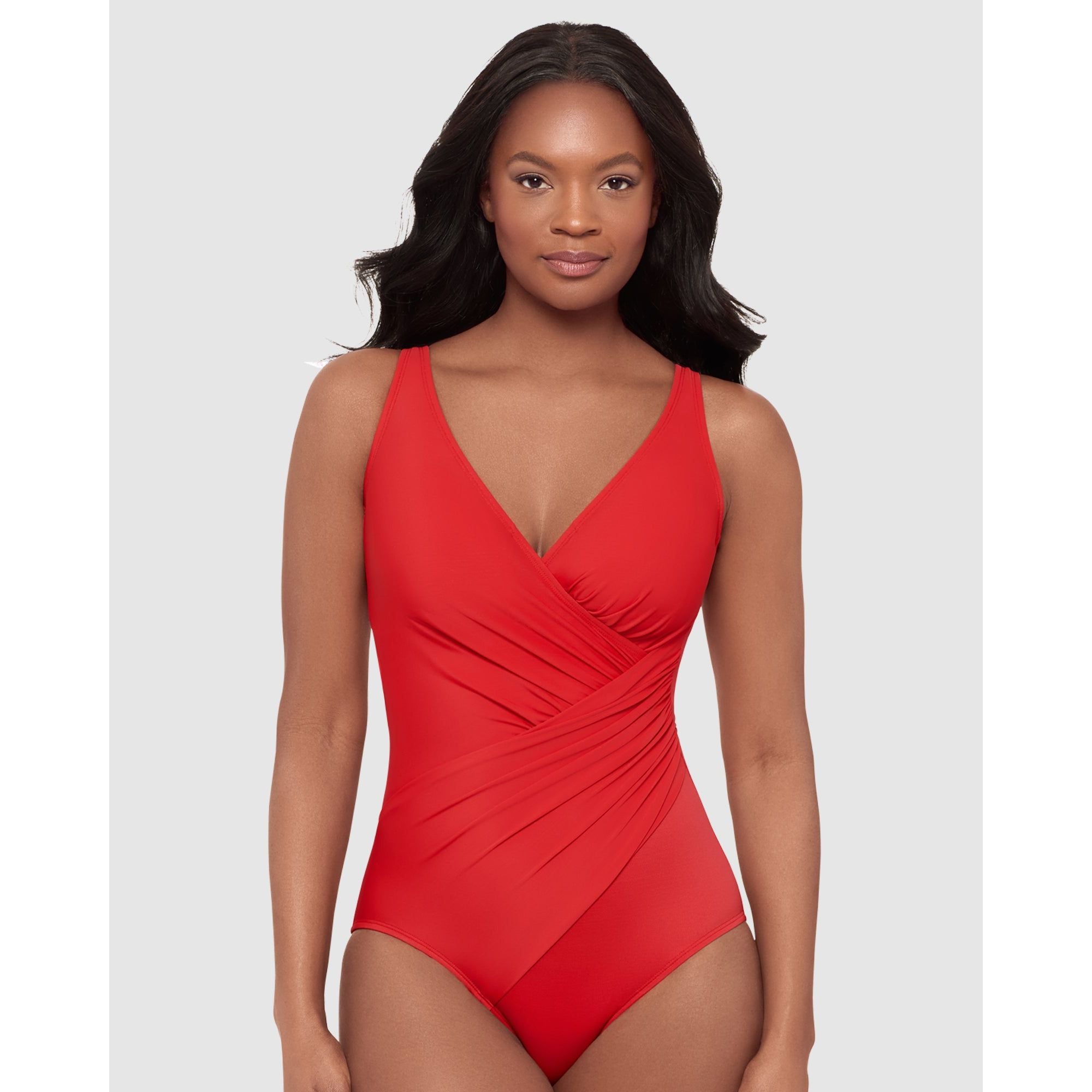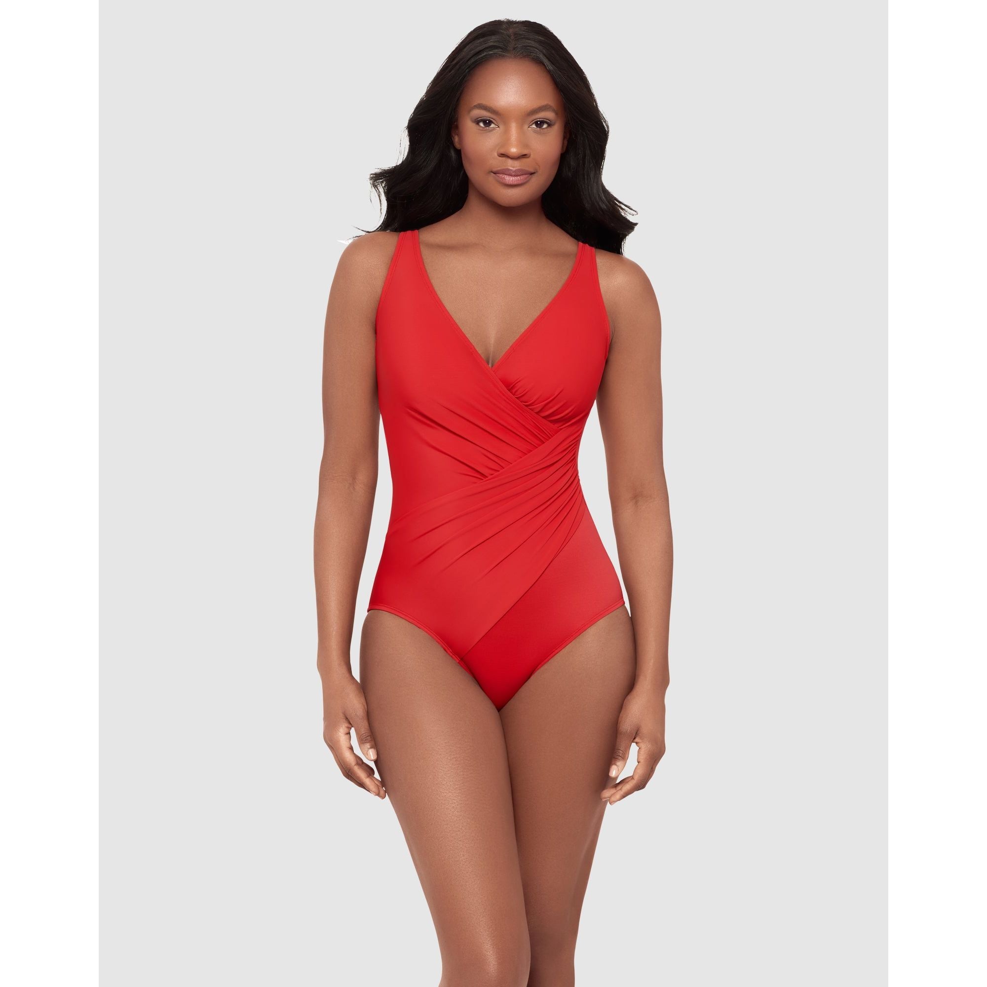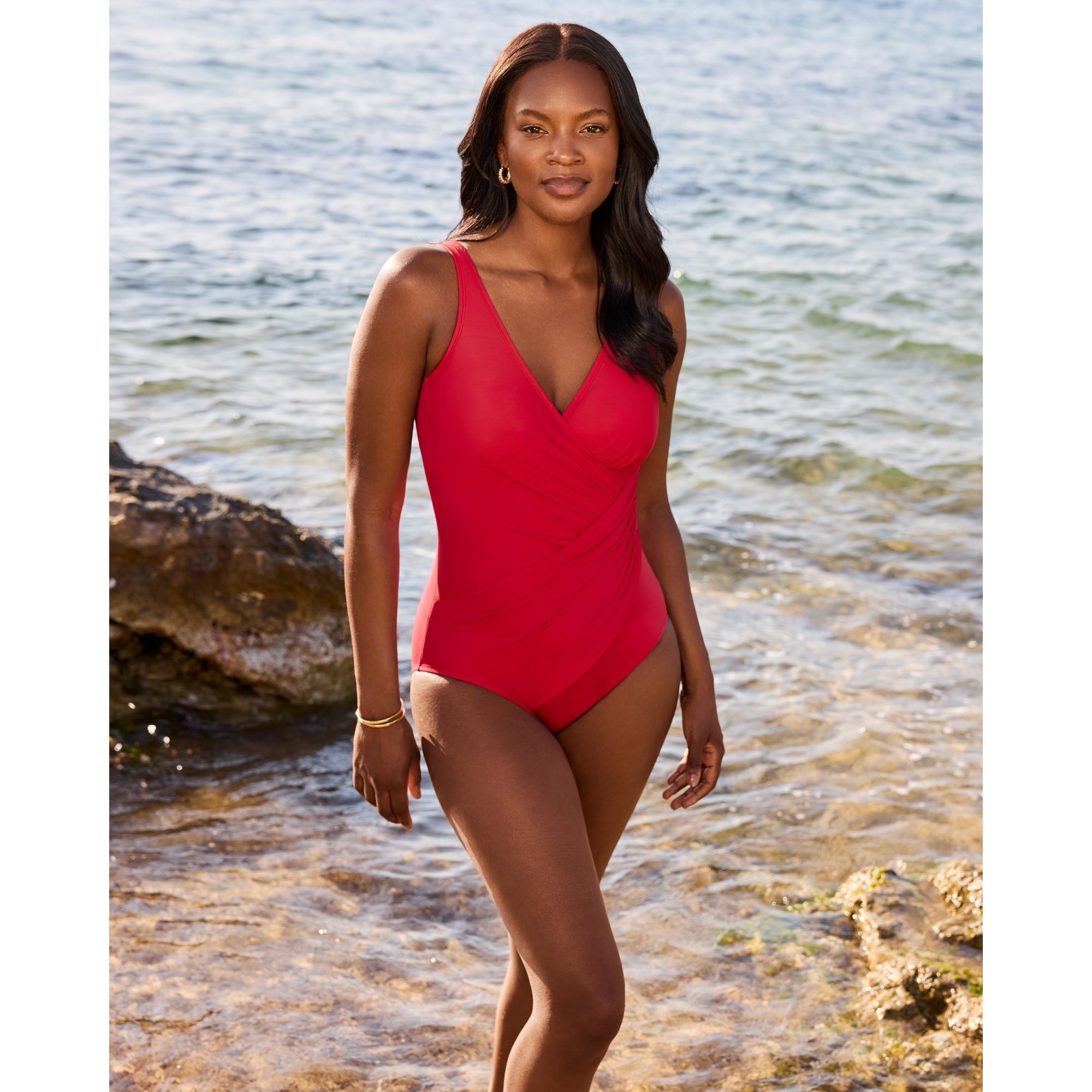 This classic, one-piece swimsuit with a crossover neckline is the perfect way to create a more hourglass-y silhouette. The wrapover front leads to subtle gathering at the side to emphasise your waistline, and this shaping swimsuit provides all-over smoothing and slimming thanks to Miraclesuit's lightweight-yet-powerful Miratex control fabric.