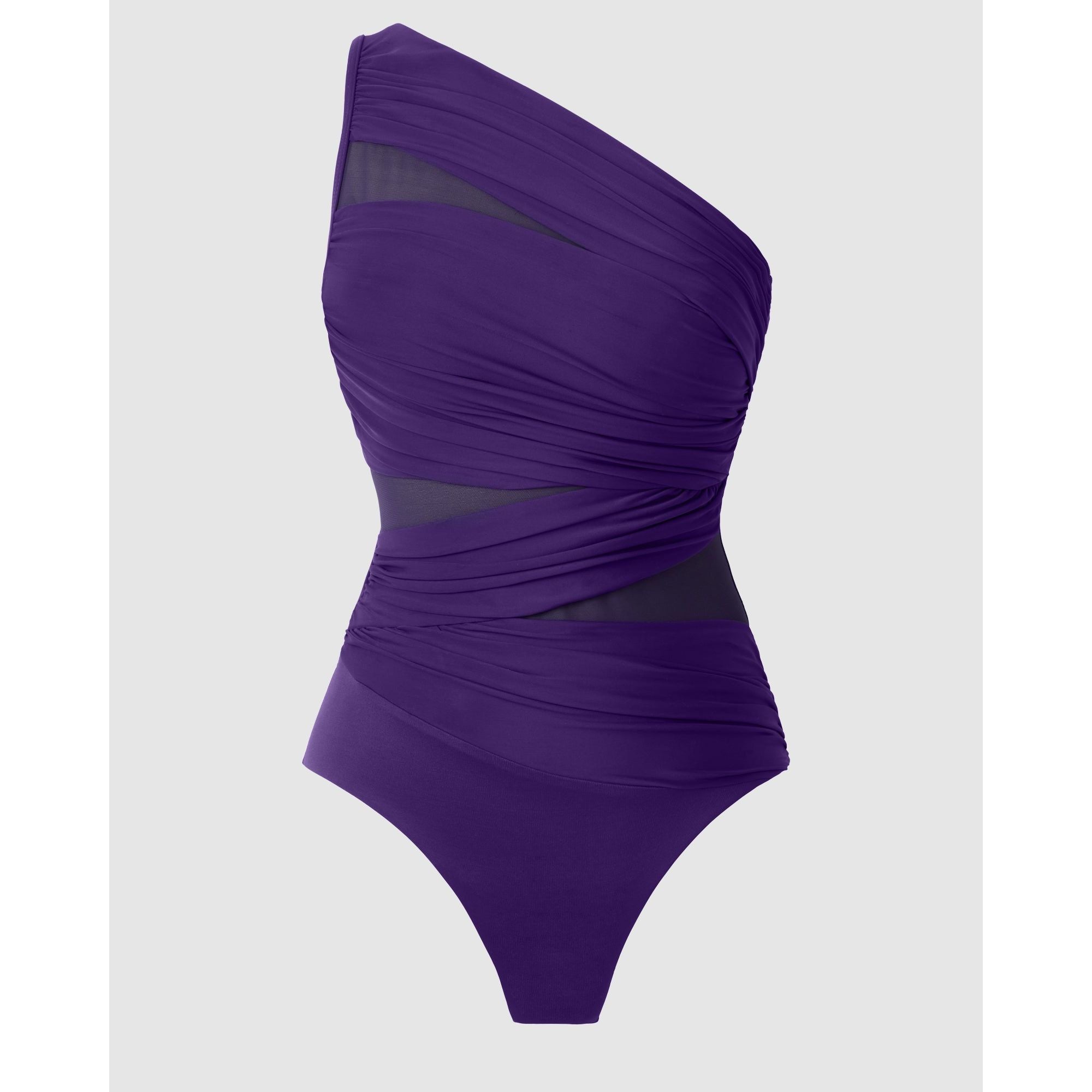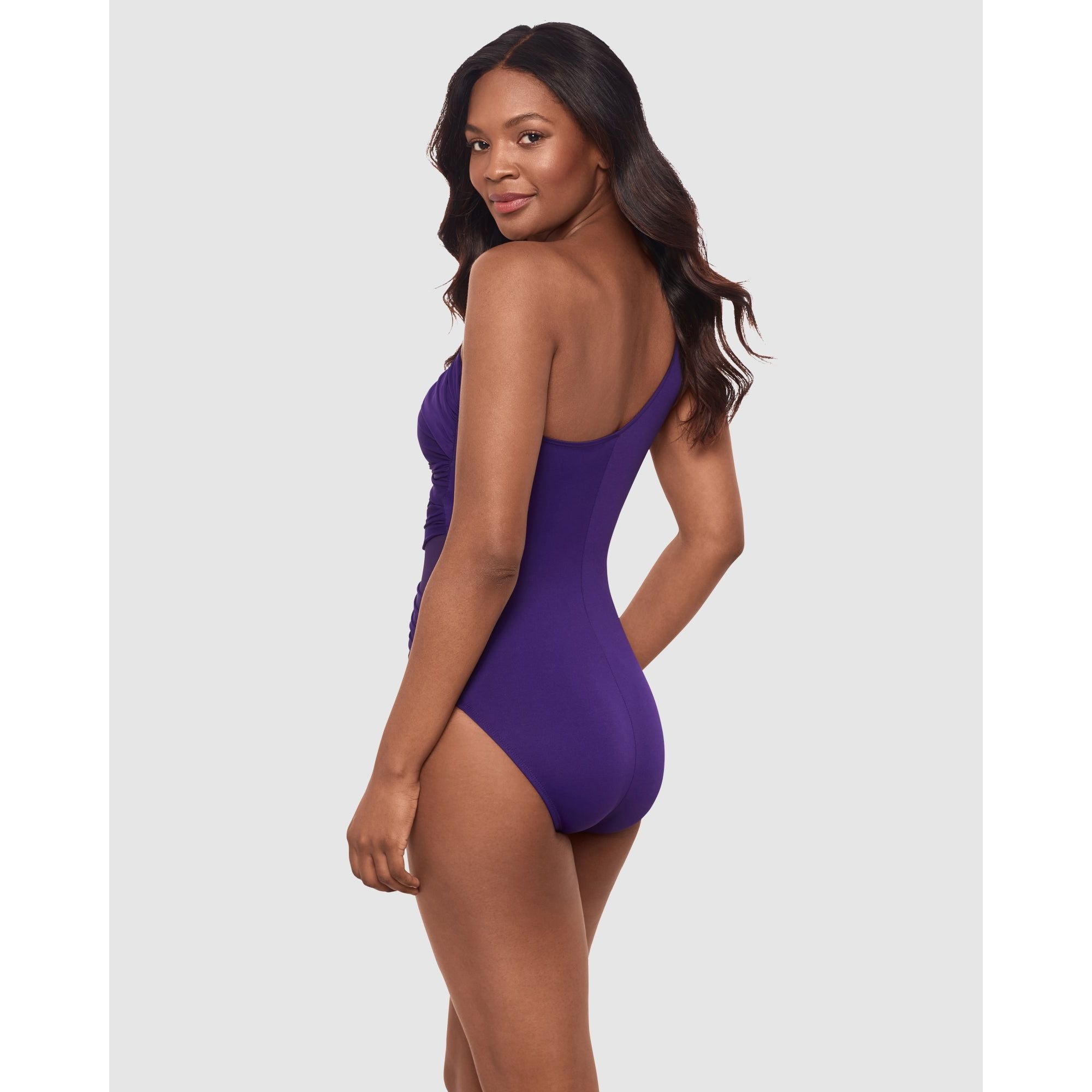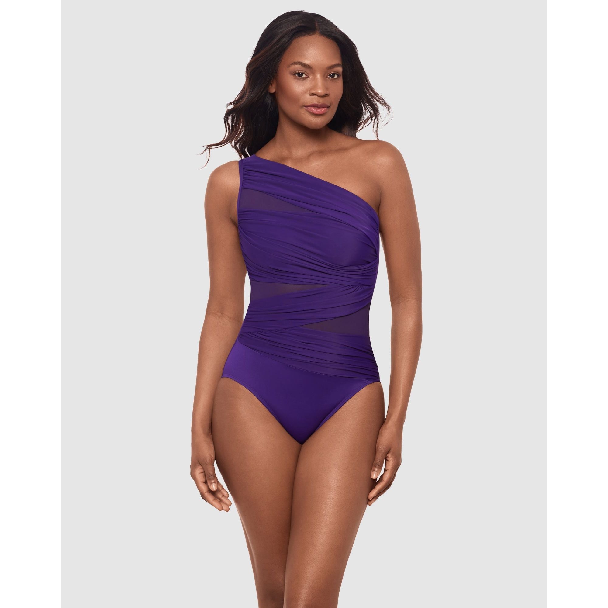 Feel fabulous at the beach in this one shoulder swimsuit with built-in shaping. Miraclesuit's Miratex fabric provides all-over control without the need for bulky lining panels, for as slim and sleek a silhouette as possible. Asymmetric panels of mesh and shirred fabric also help to create the illusion of hourglass curves. This control swimsuit also includes a hidden wireless shelf bra, for comfortable support and bust coverage.