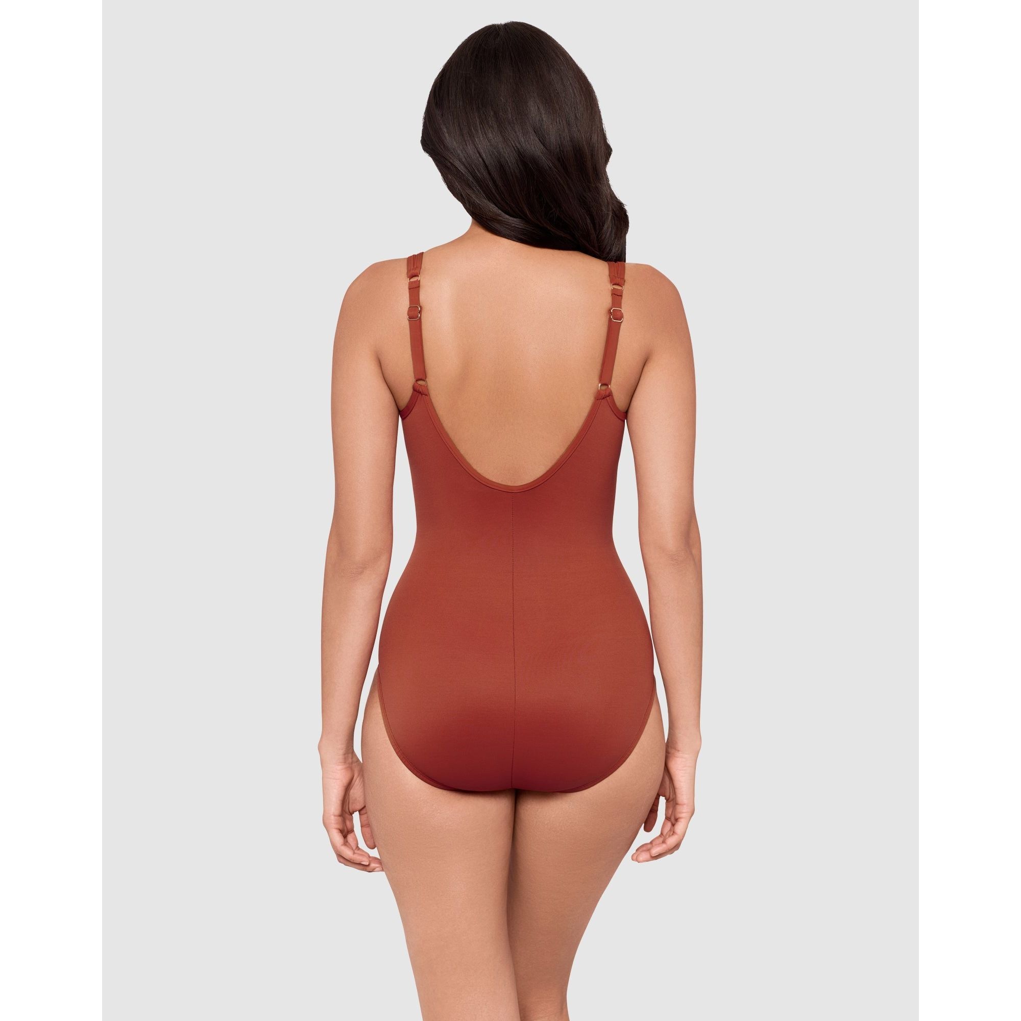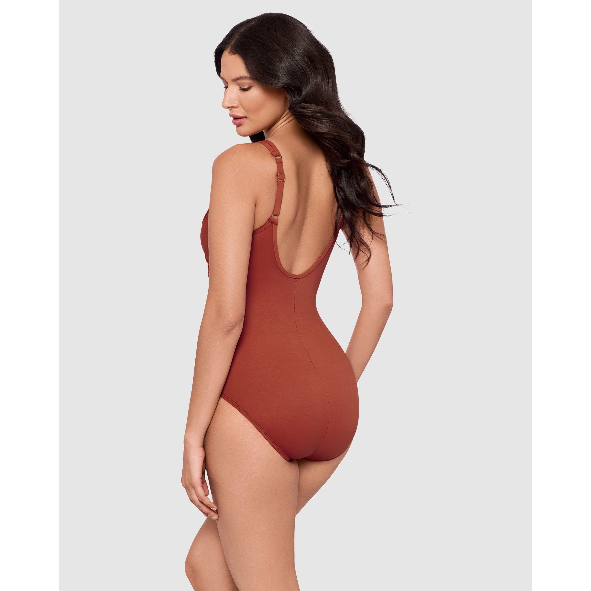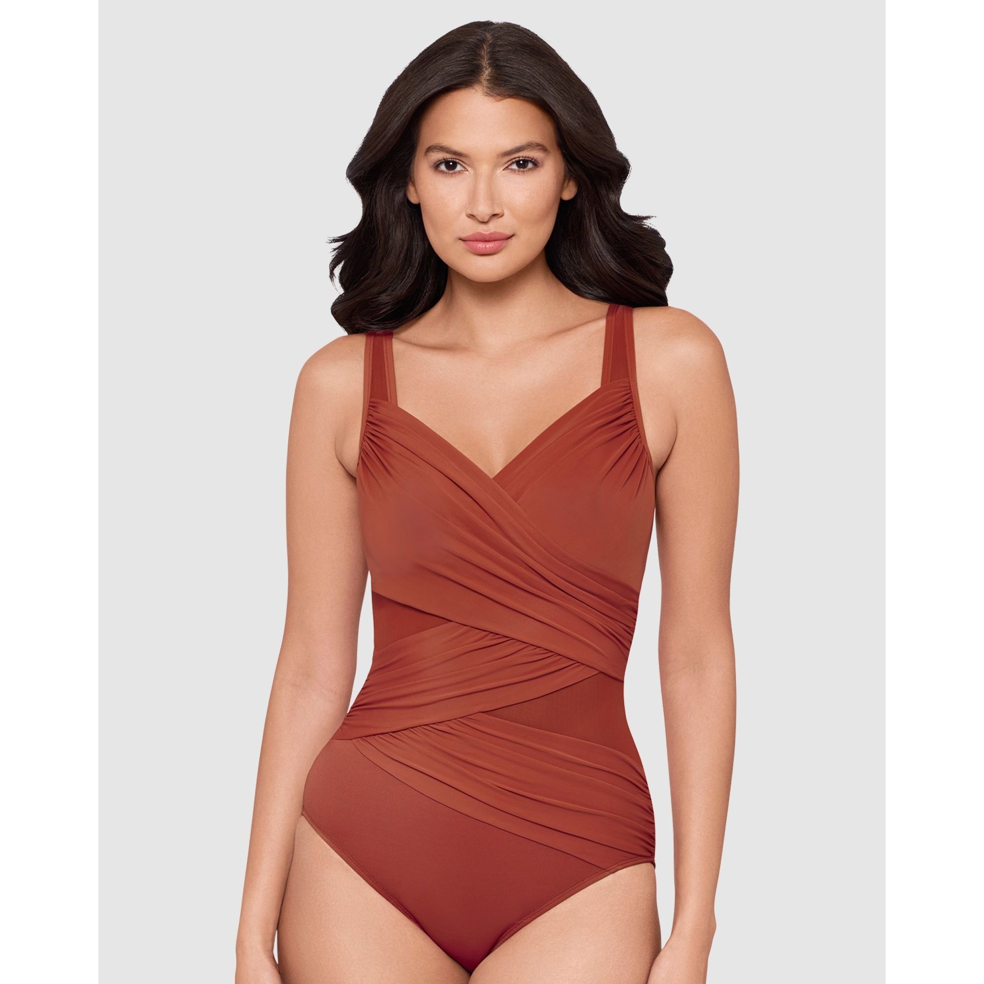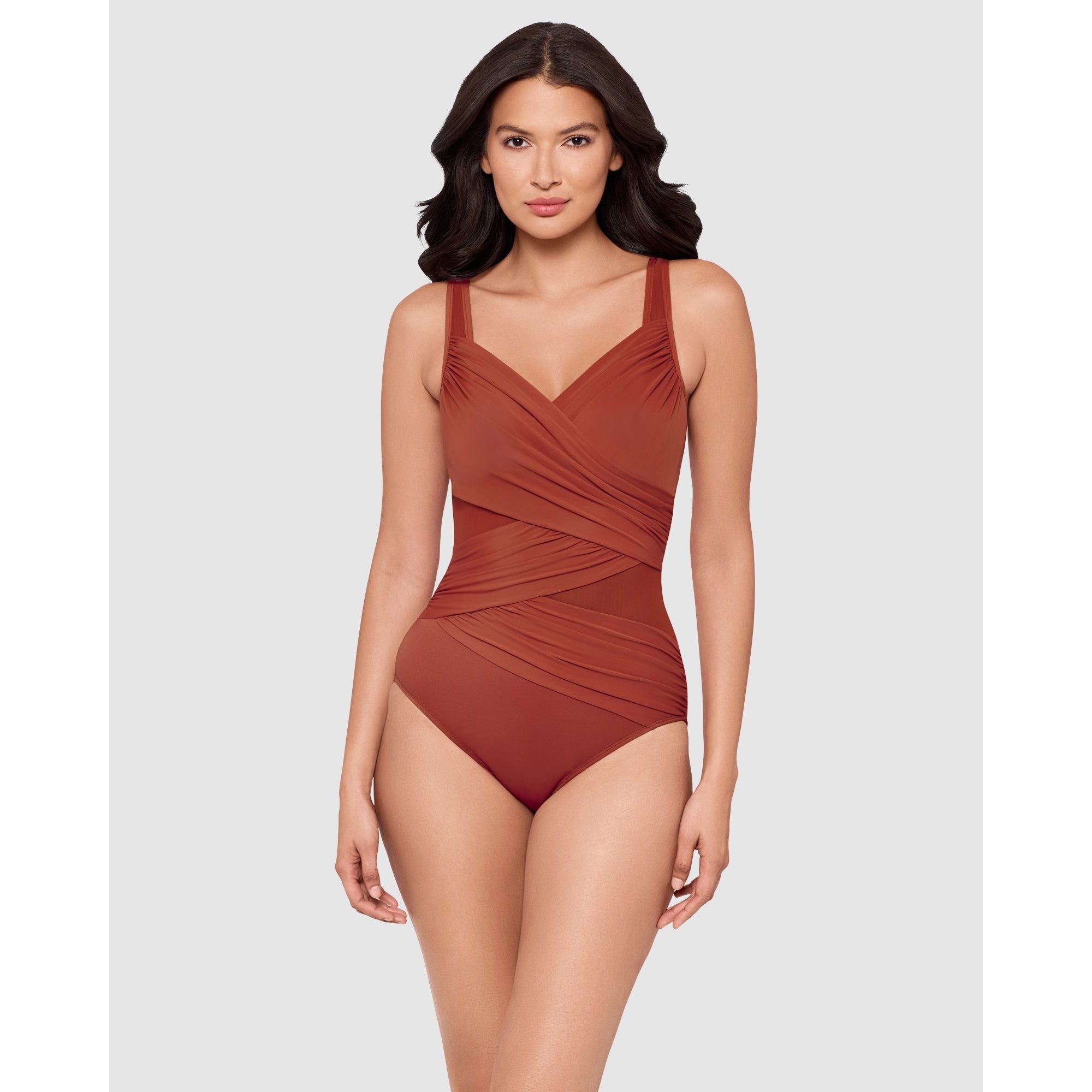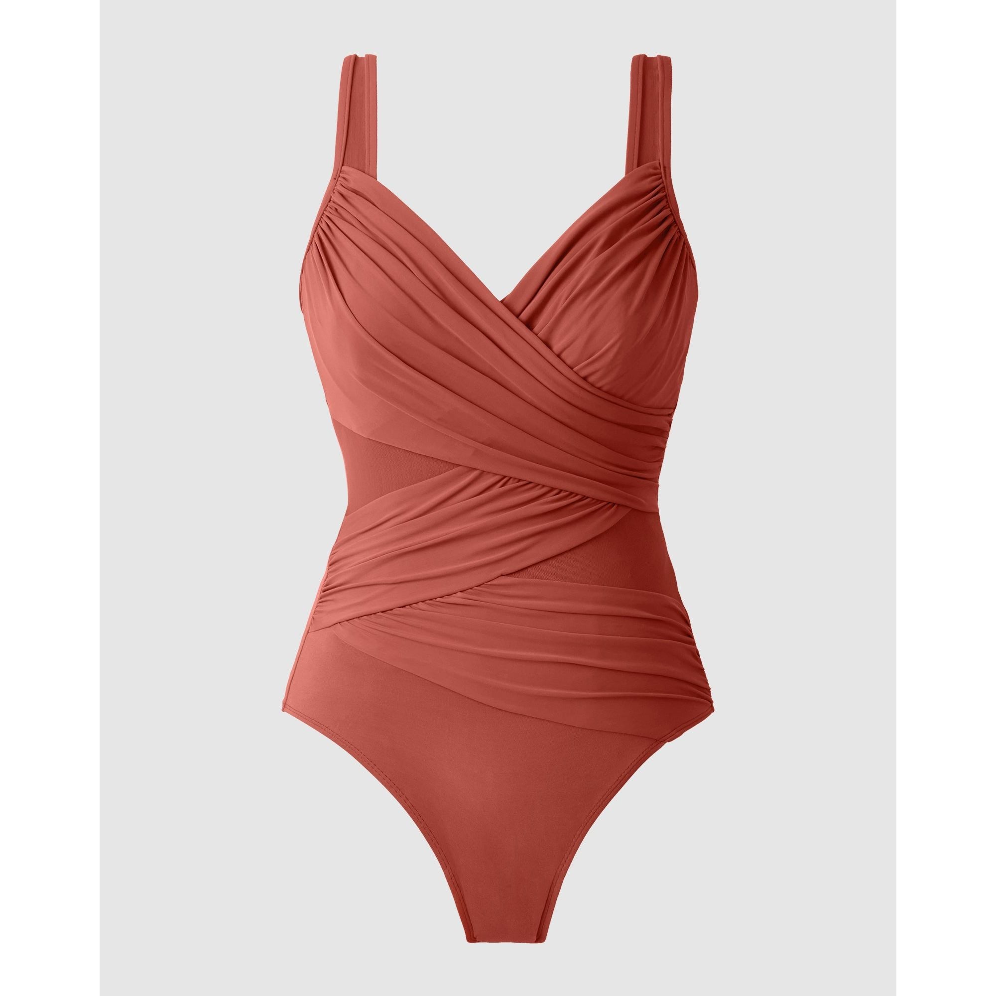 This underwired swimsuit will sculpt a beautiful silhouette, thanks to powerful shaping fabric that's complemented by curve-enhancing draping. Made from a single layer of Miratex fabric, it's a control swimsuit which smooths and slims all over, while the ruched crossover design and triangle mesh inserts create the illusion of a smaller waistline. With hidden underwire to support and lift your bust.