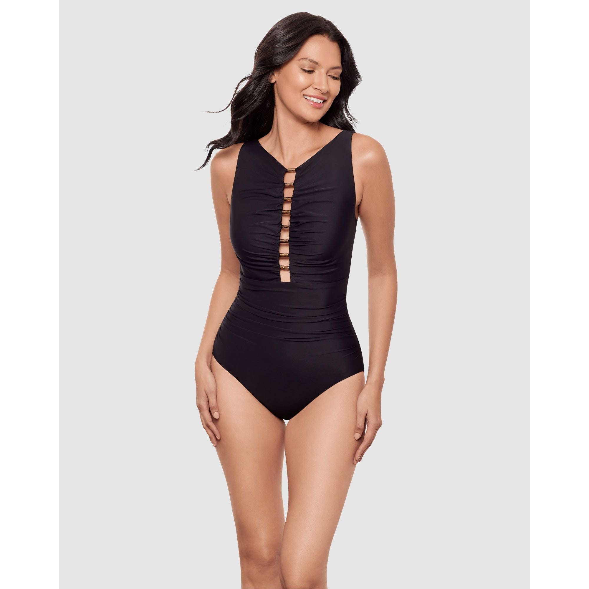 The perfect blend of slimming coverage and stylish details, this high neck swimsuit features a deep plunge front held securely in place by golden bead accents. Made from sculpting Miratex fabric and with expertly-placed shirring and hidden underwire support to enhance your curves.