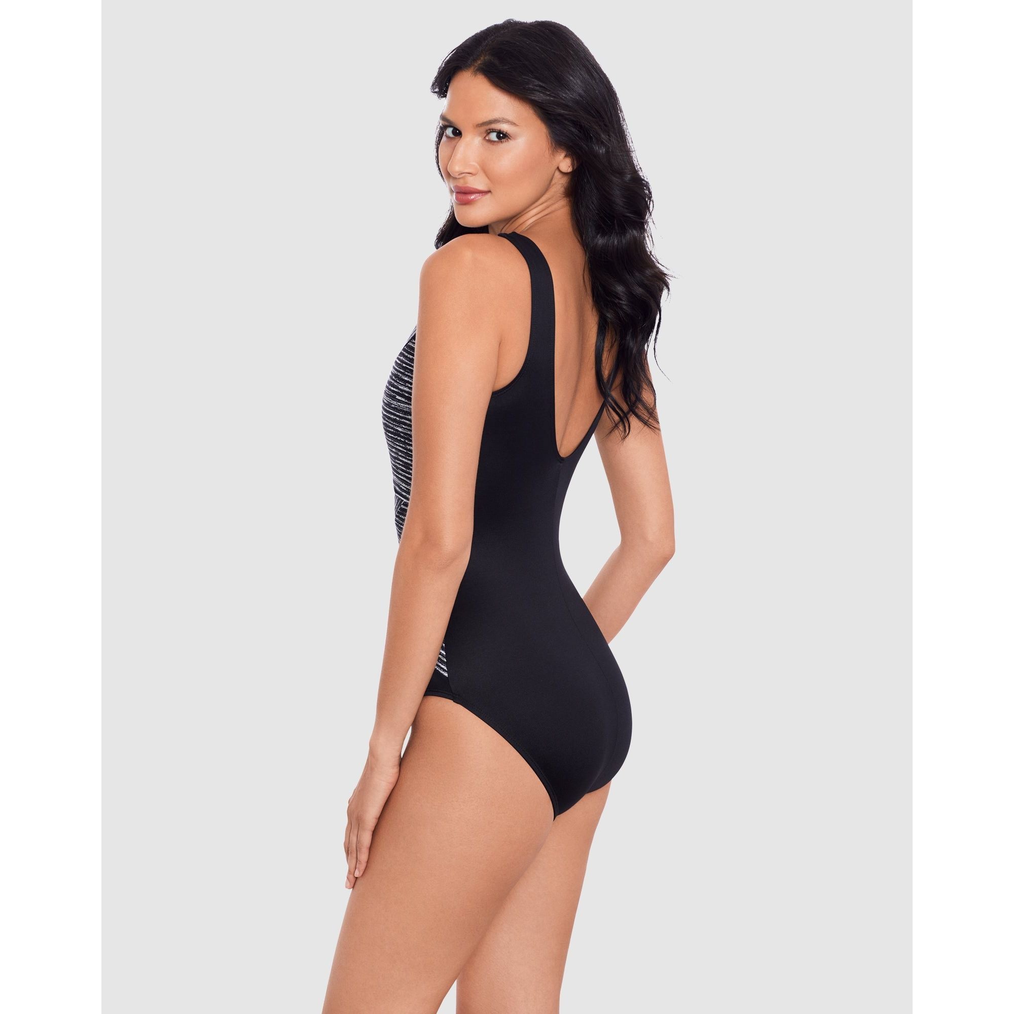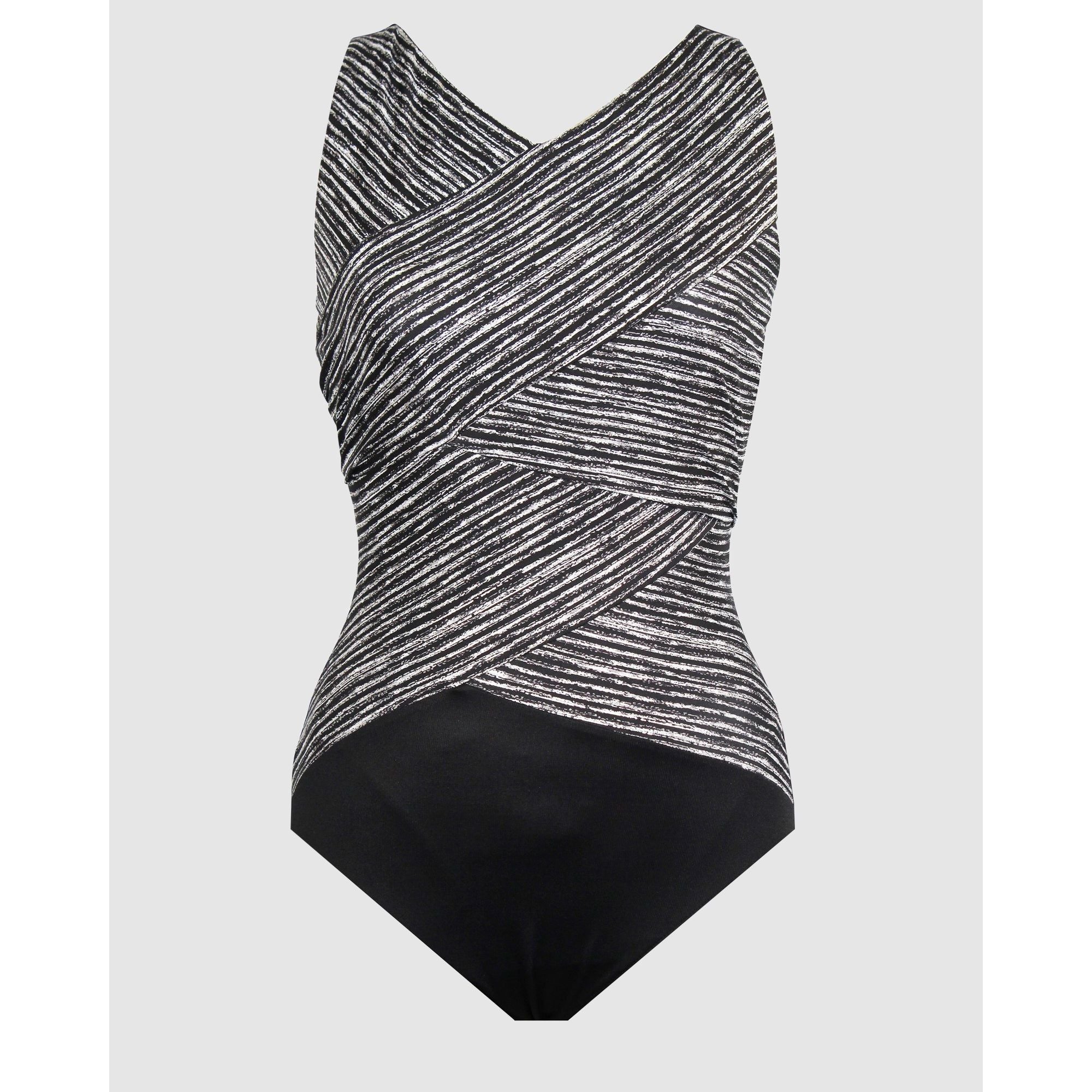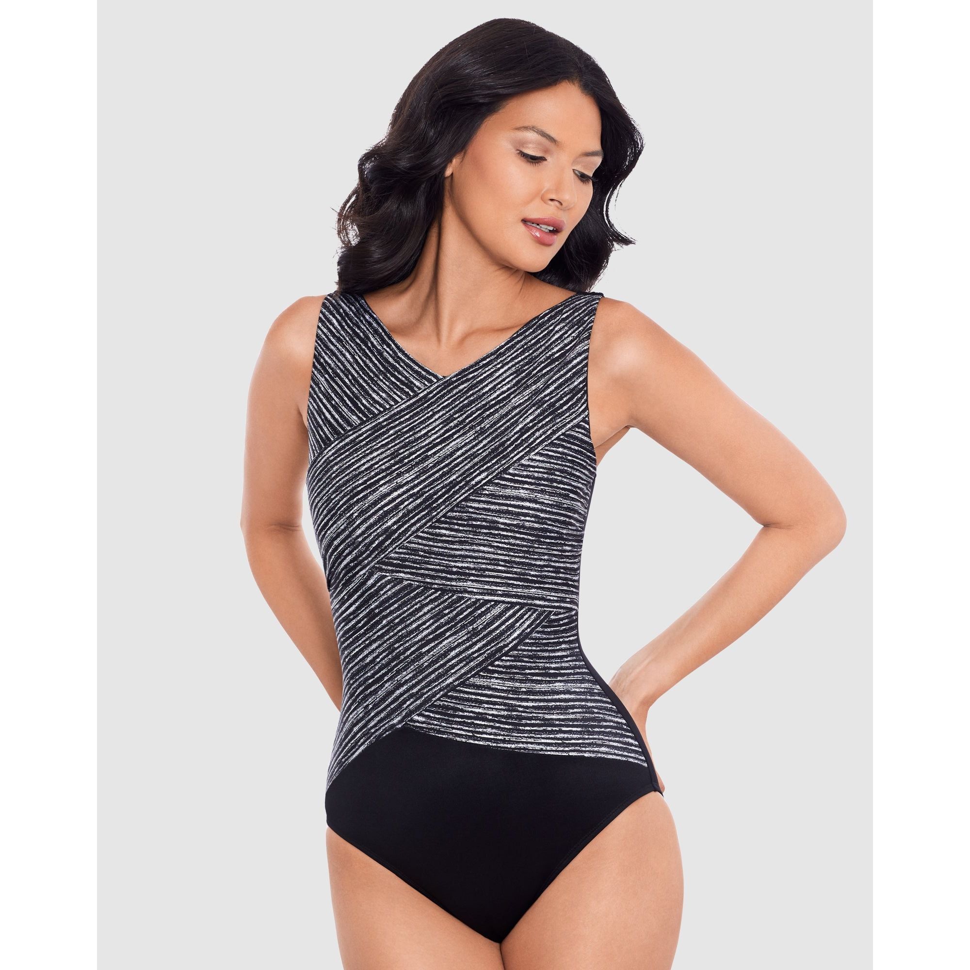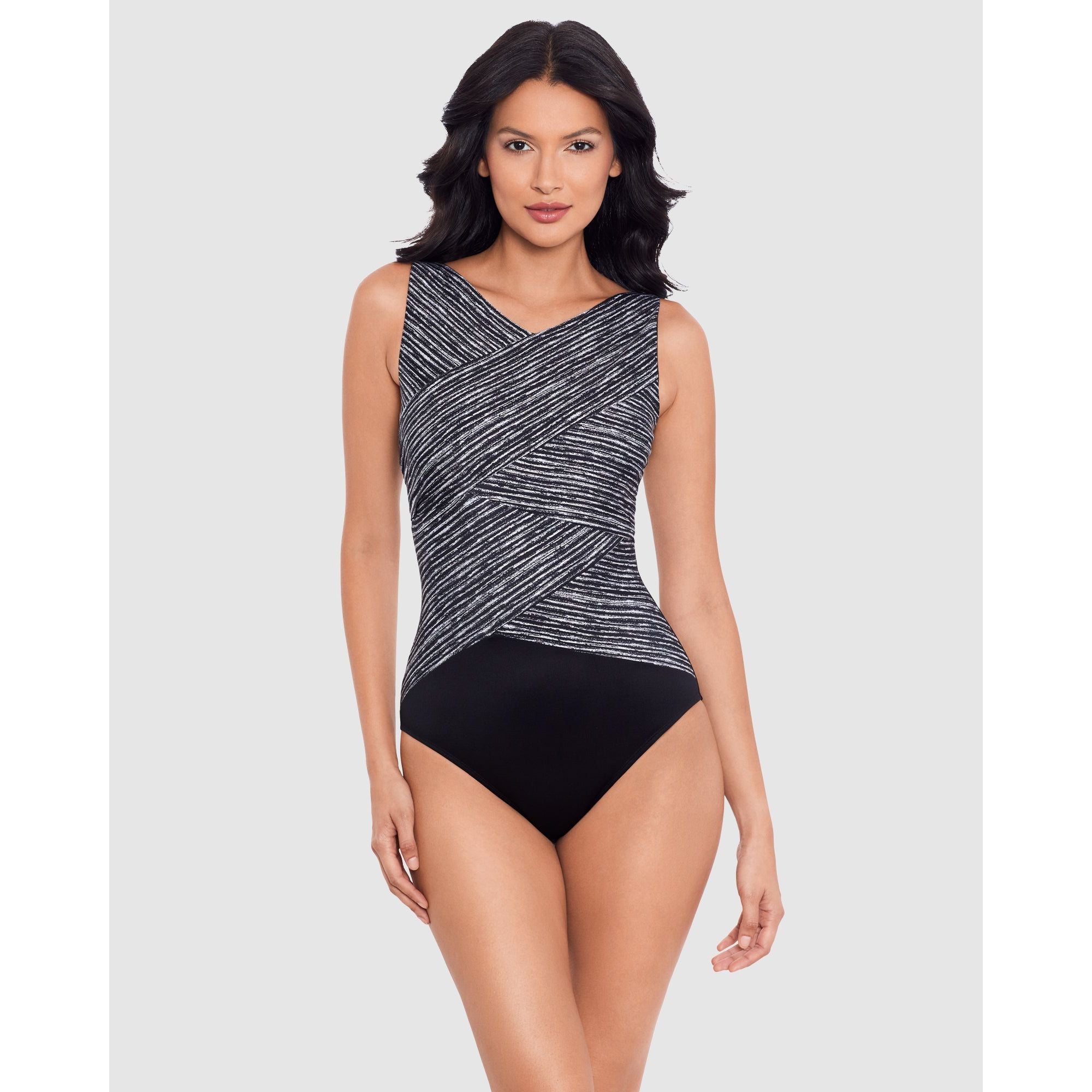 Enjoy a confidence-boosting blend of coverage, slimming, smoothing, and knockout style in this tummy control swimsuit. Wrapover panels of powerfully-slenderising Miratex® fabric create an eye-catching high neckline, while hidden underwire delivers sturdy support and shaping at the bustline.