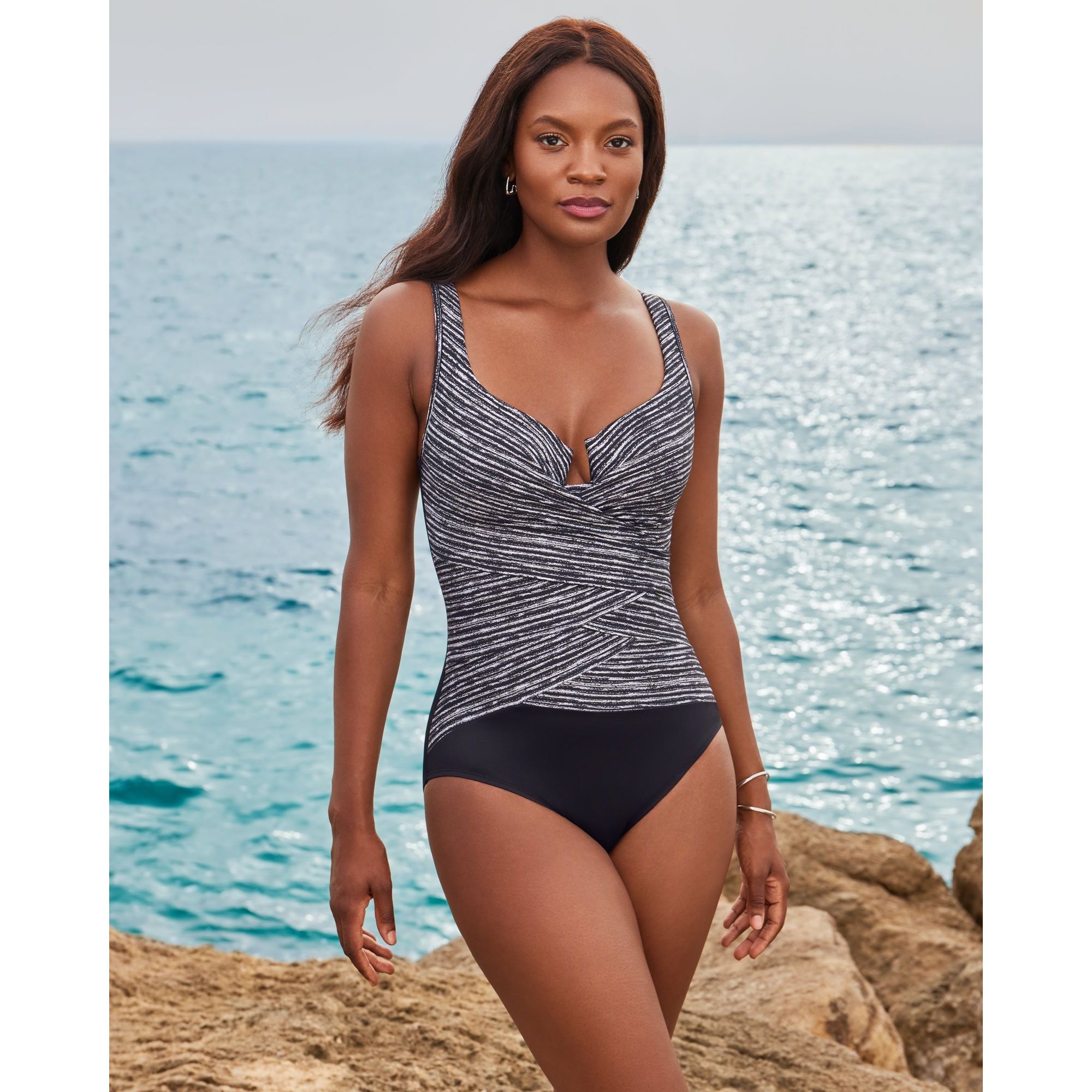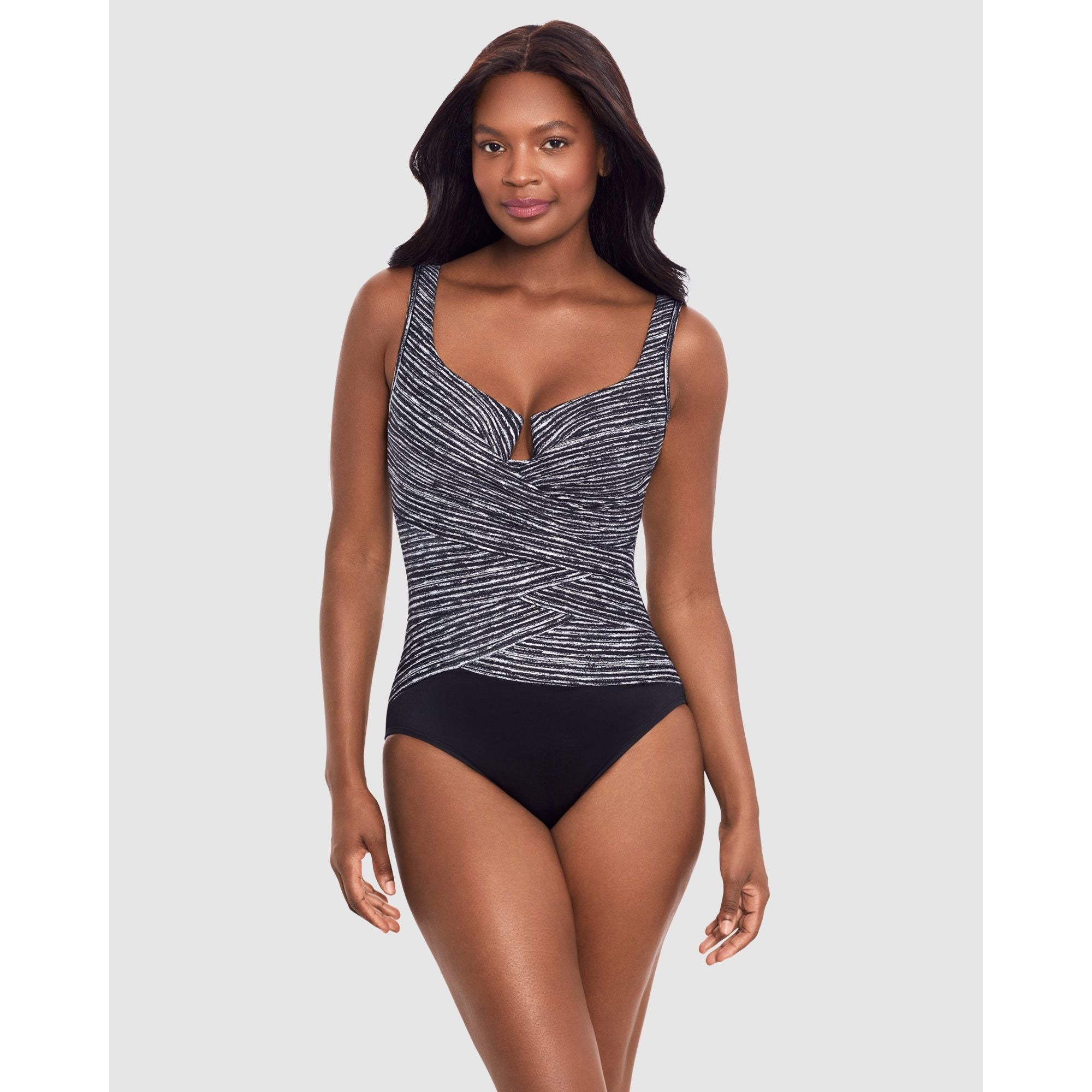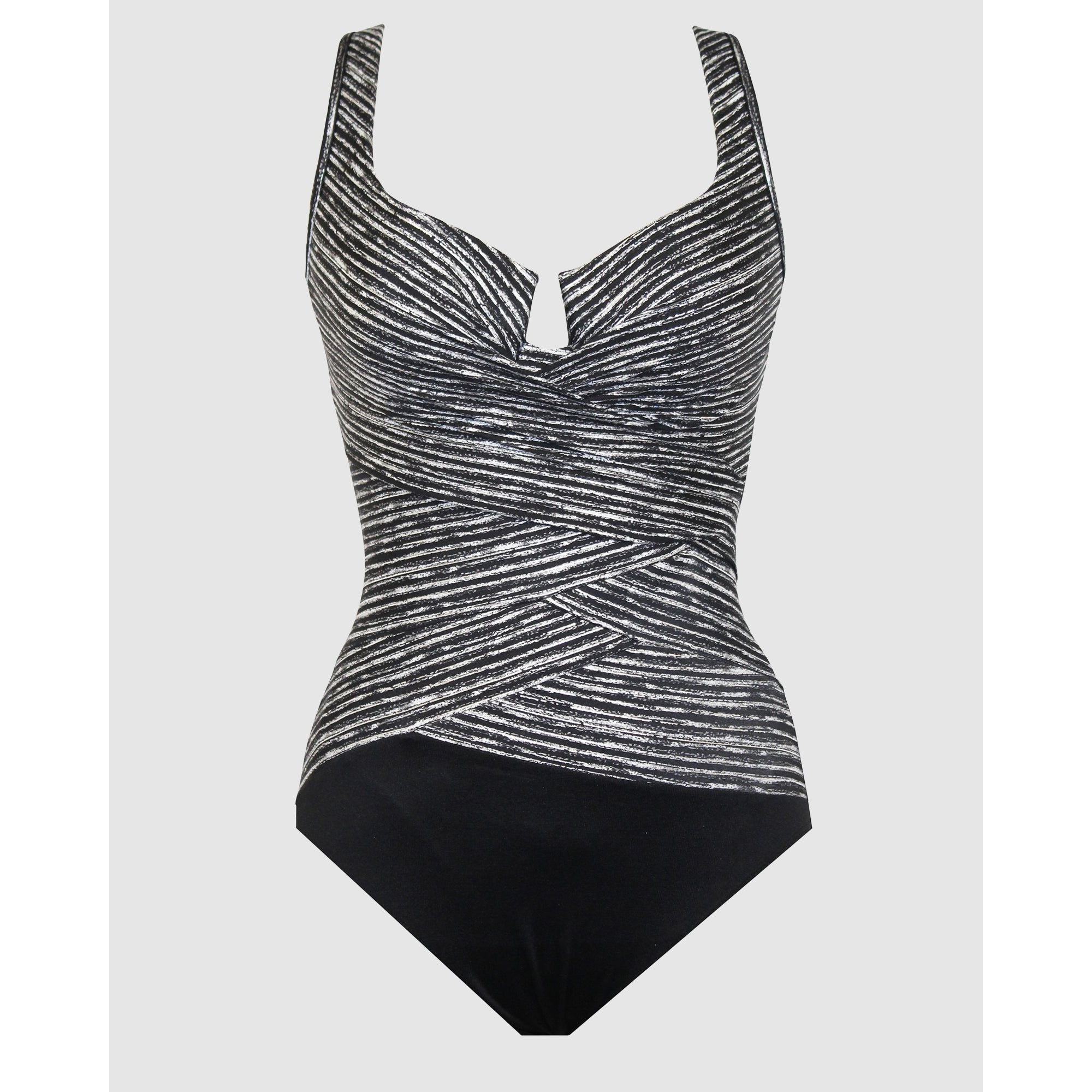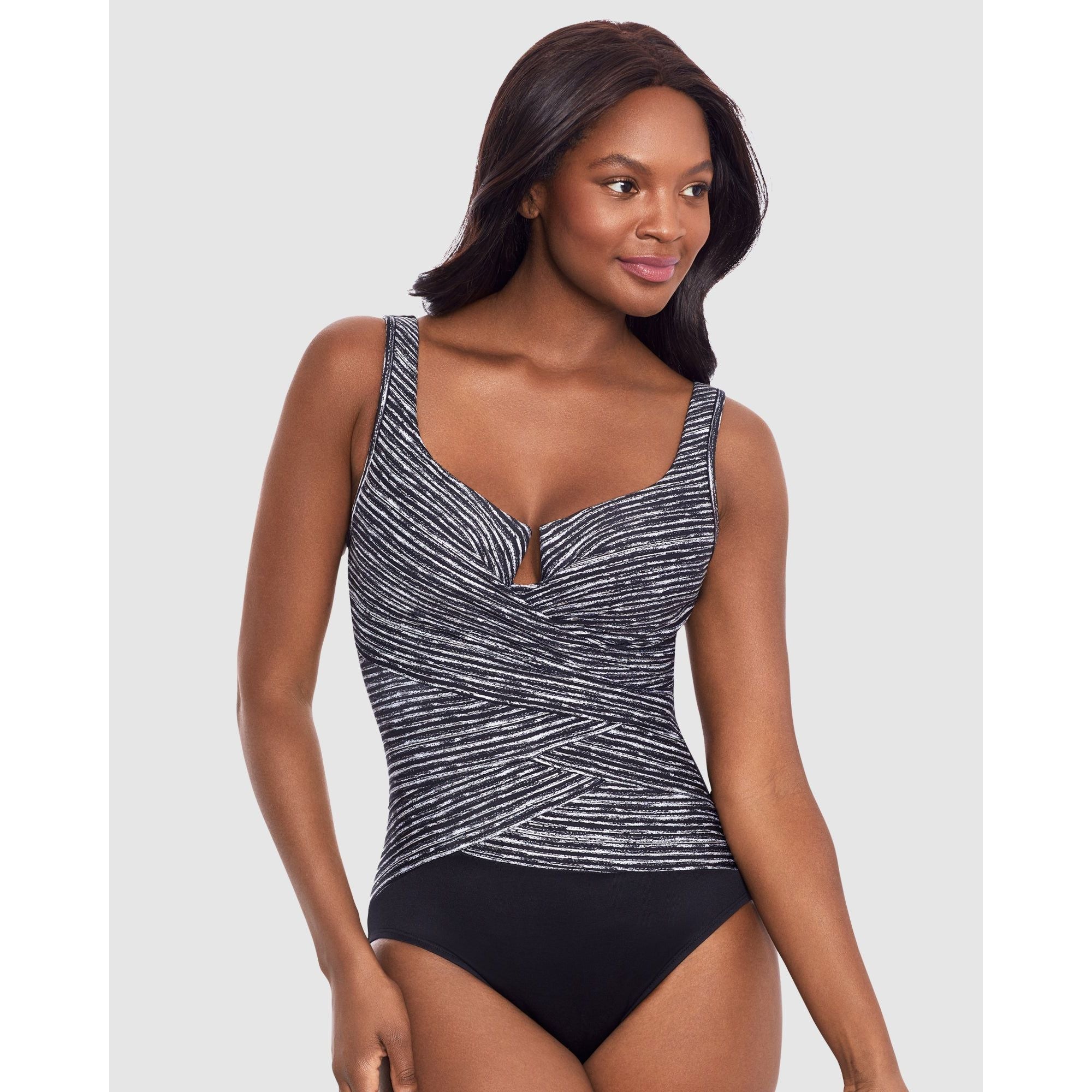 Recontour your body in seconds with this fabulous tummy control swimsuit, which uses a combination of Miratex® shaping fabric (three times more powerful than standard swimwear fabric!) plus the visual waist-slimming illusion of layered wrapover fabric. It's an underwired swimsuit with moulded foam cups for support and smoothness, and features a deep plunge detail at the centre.