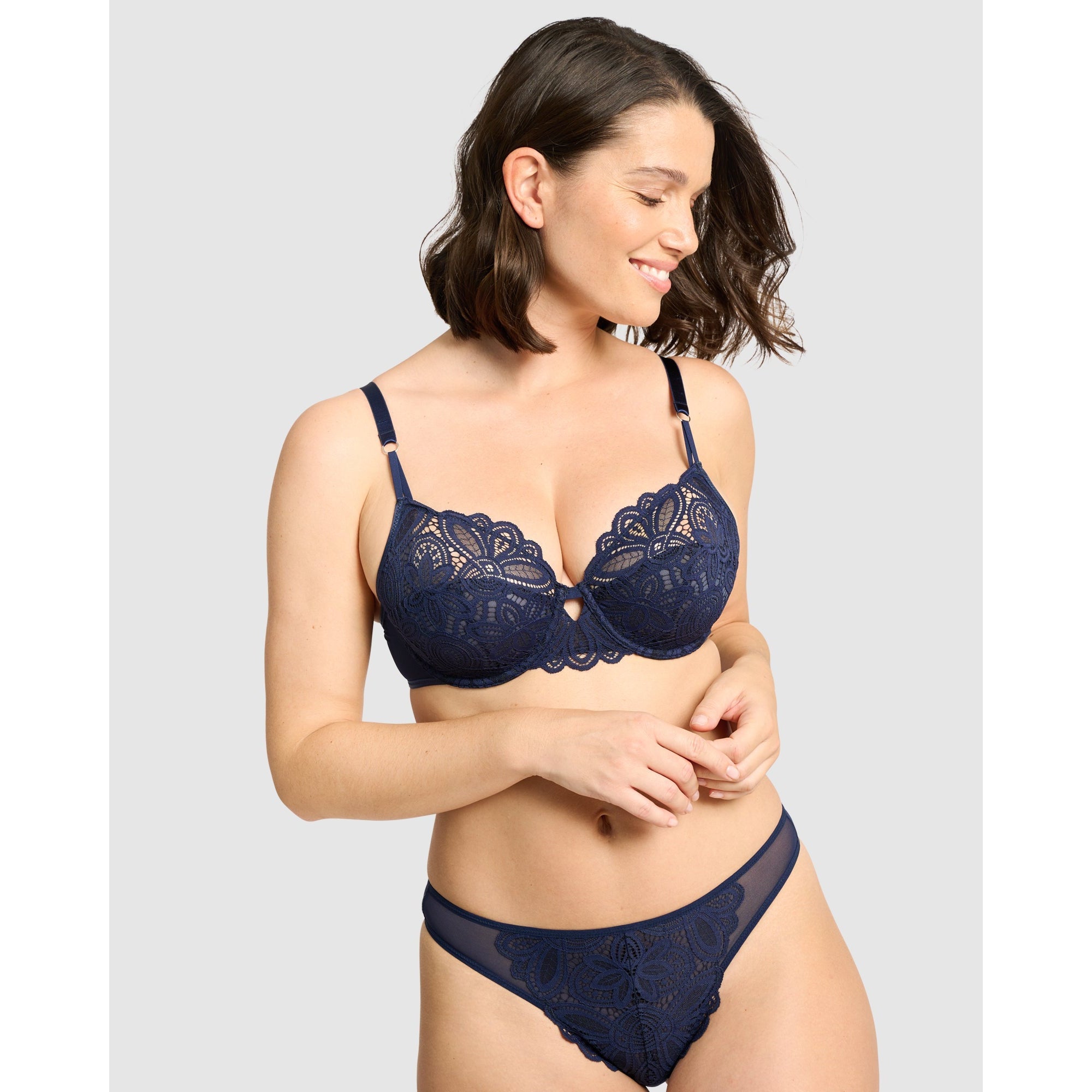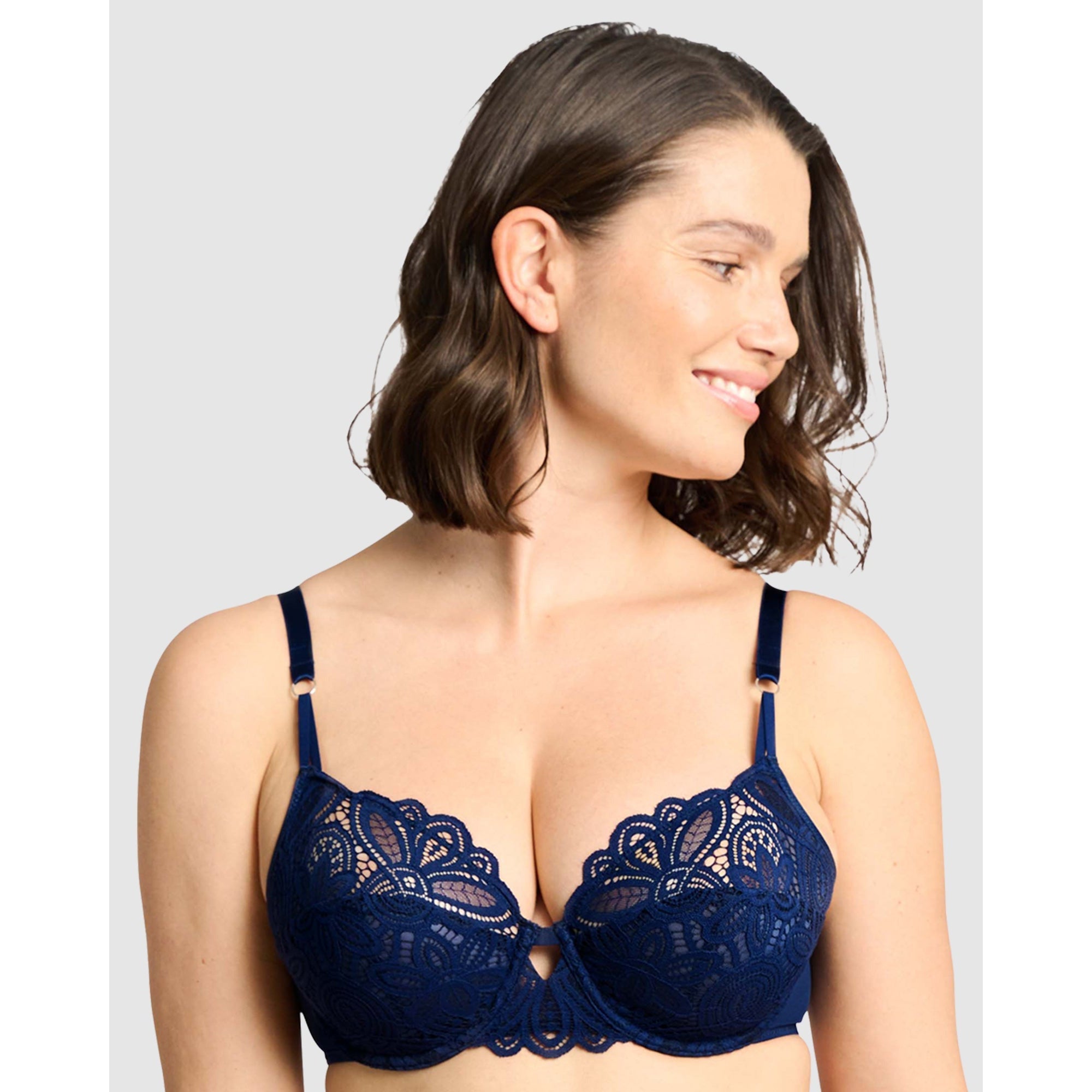 Look incredible from every angle in this sexy lace bra, featuring demi cups edged in sheer, scalloped lace, a keyhole cut out, and striking O-ring details at the back. It's a partially lined lace bra for great everyday support and comfort.