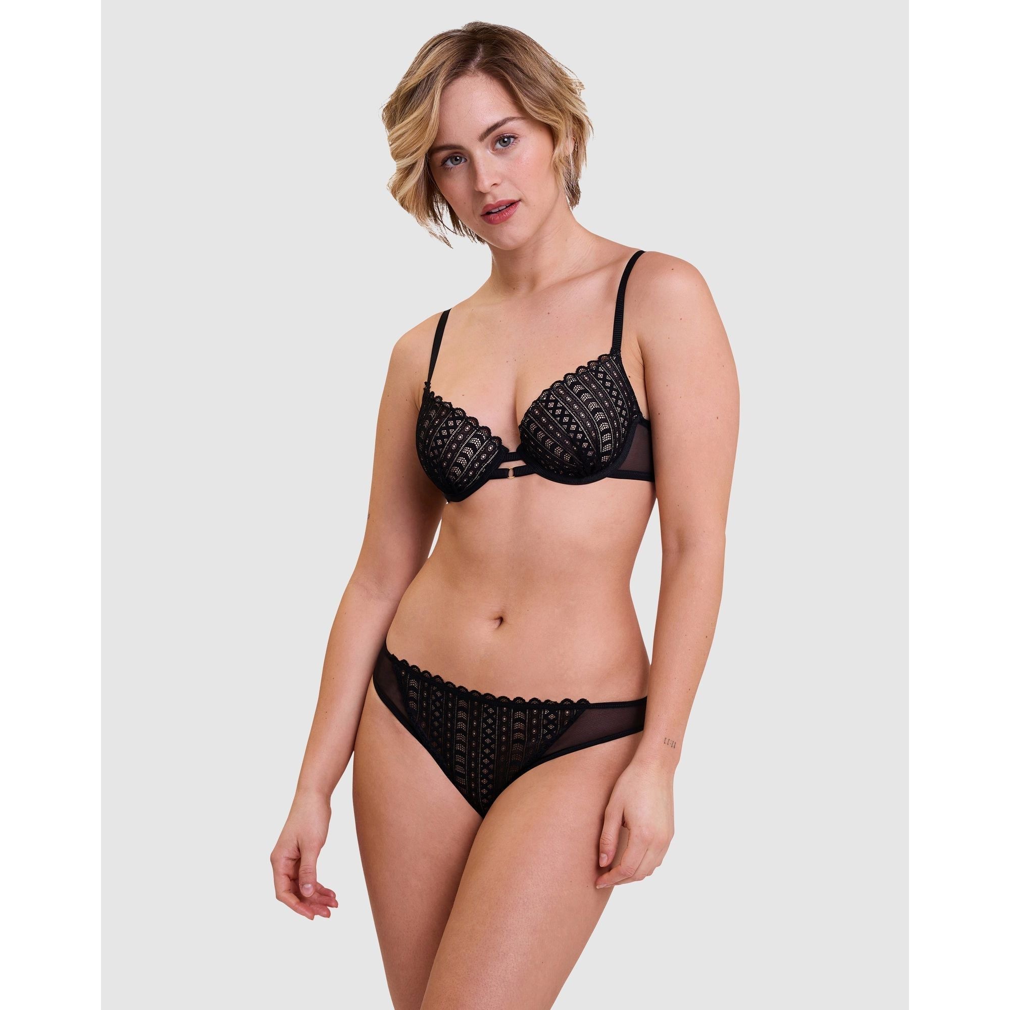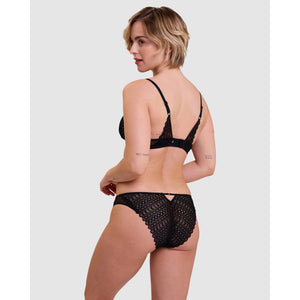 Made with at least 61% recycled fibres, this sultry lace brief combines a graphic geometric pattern with romantic scalloped edging, plus panels of sheer mesh at the sides. A triangular cut-out and gold ring detail at the back completes this sexy bikini brief.