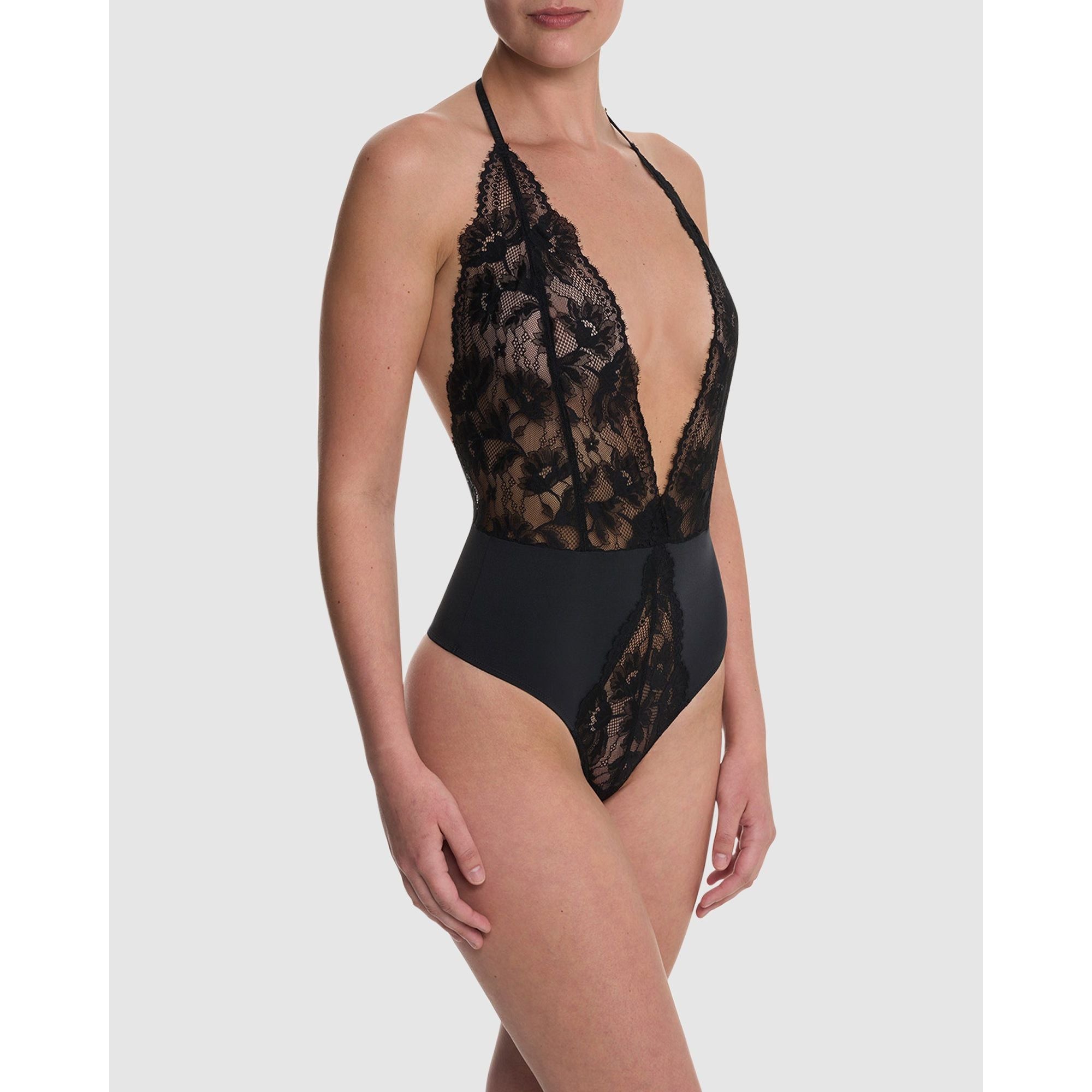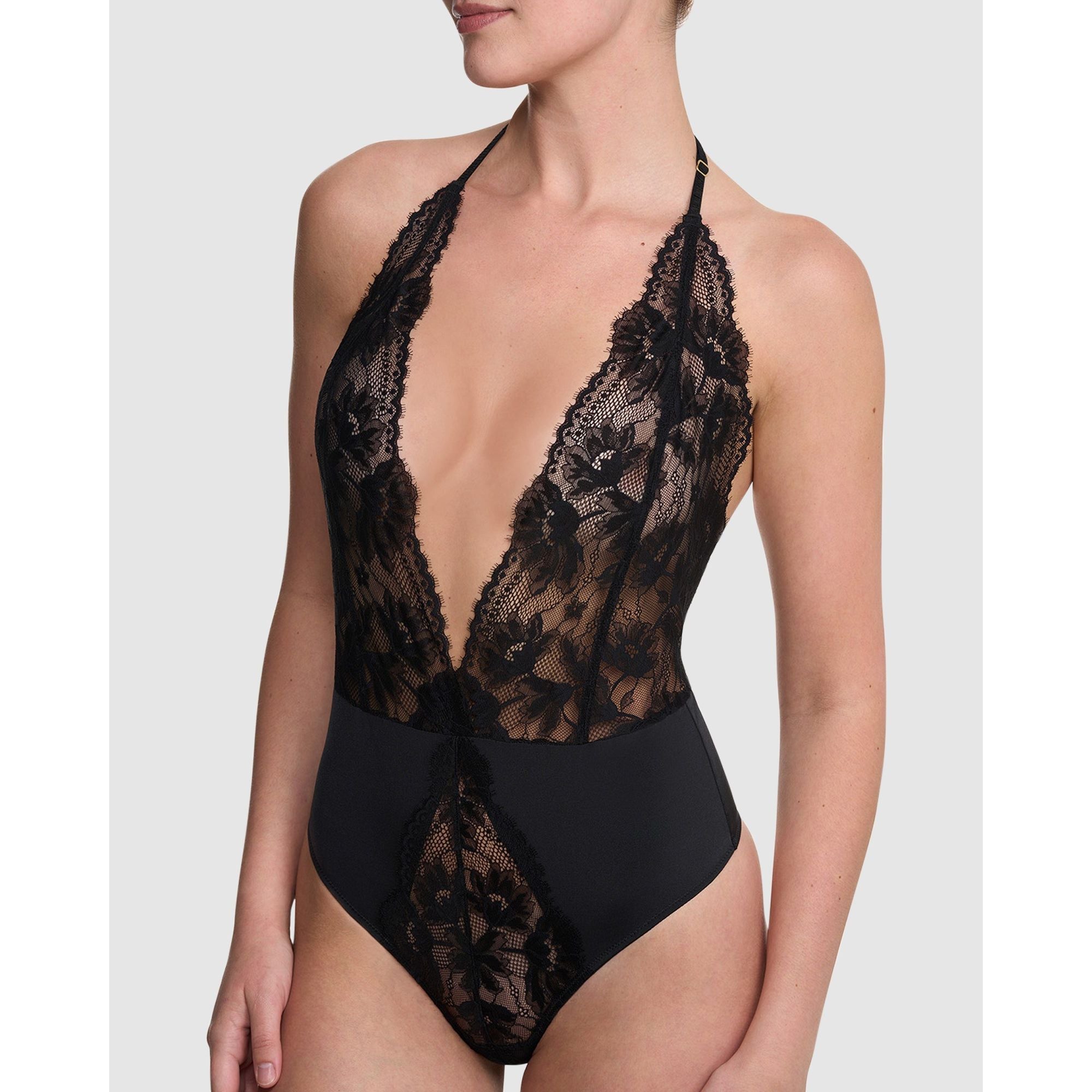 Captivating, feminine, and undeniably romantic, this lingerie teddy is made from a mixture of soft, shiny stretch jersey and sheer lace, with a cheeky thong-cut back and plunging neckline. Adjustable ruched halter and back straps ensure a perfect fit.