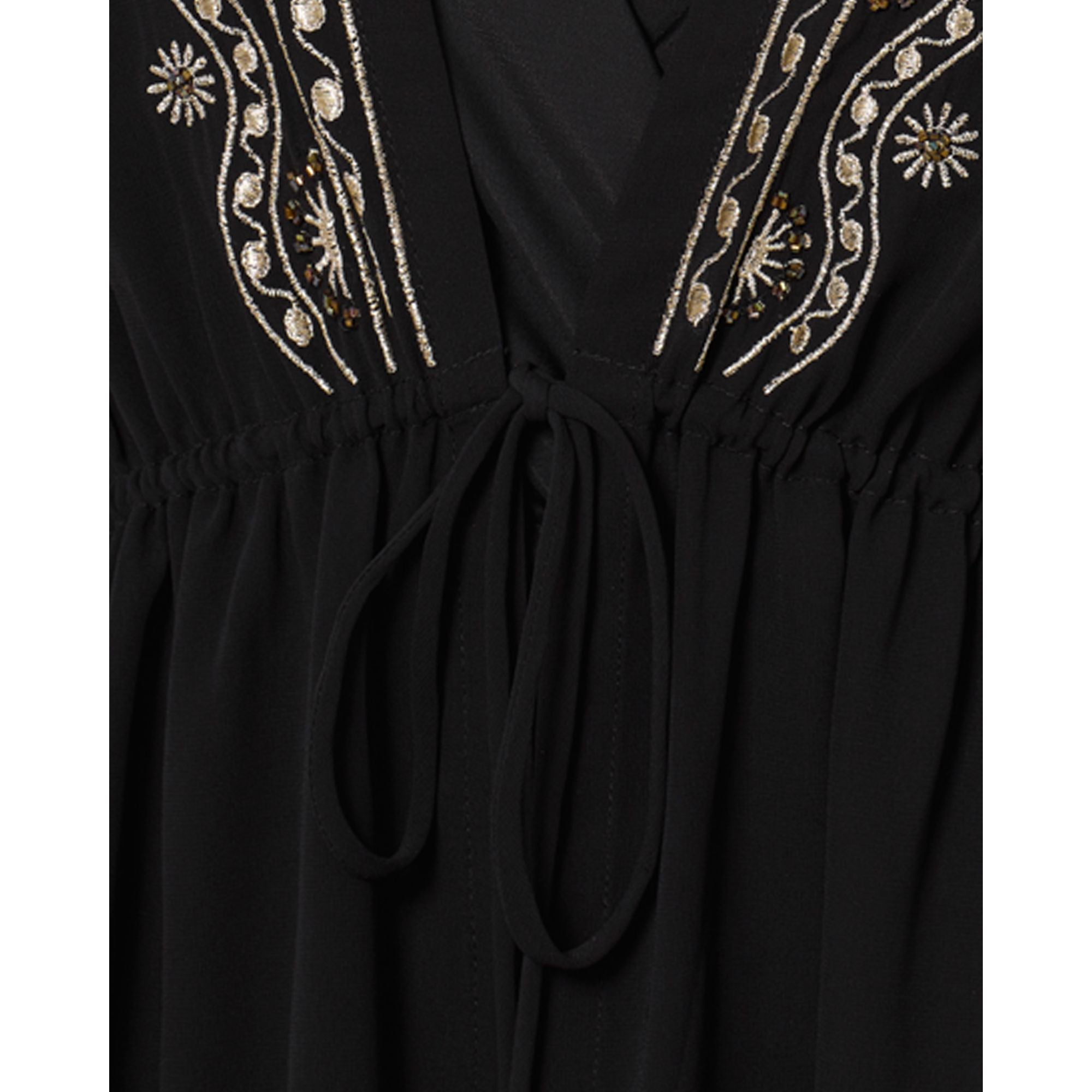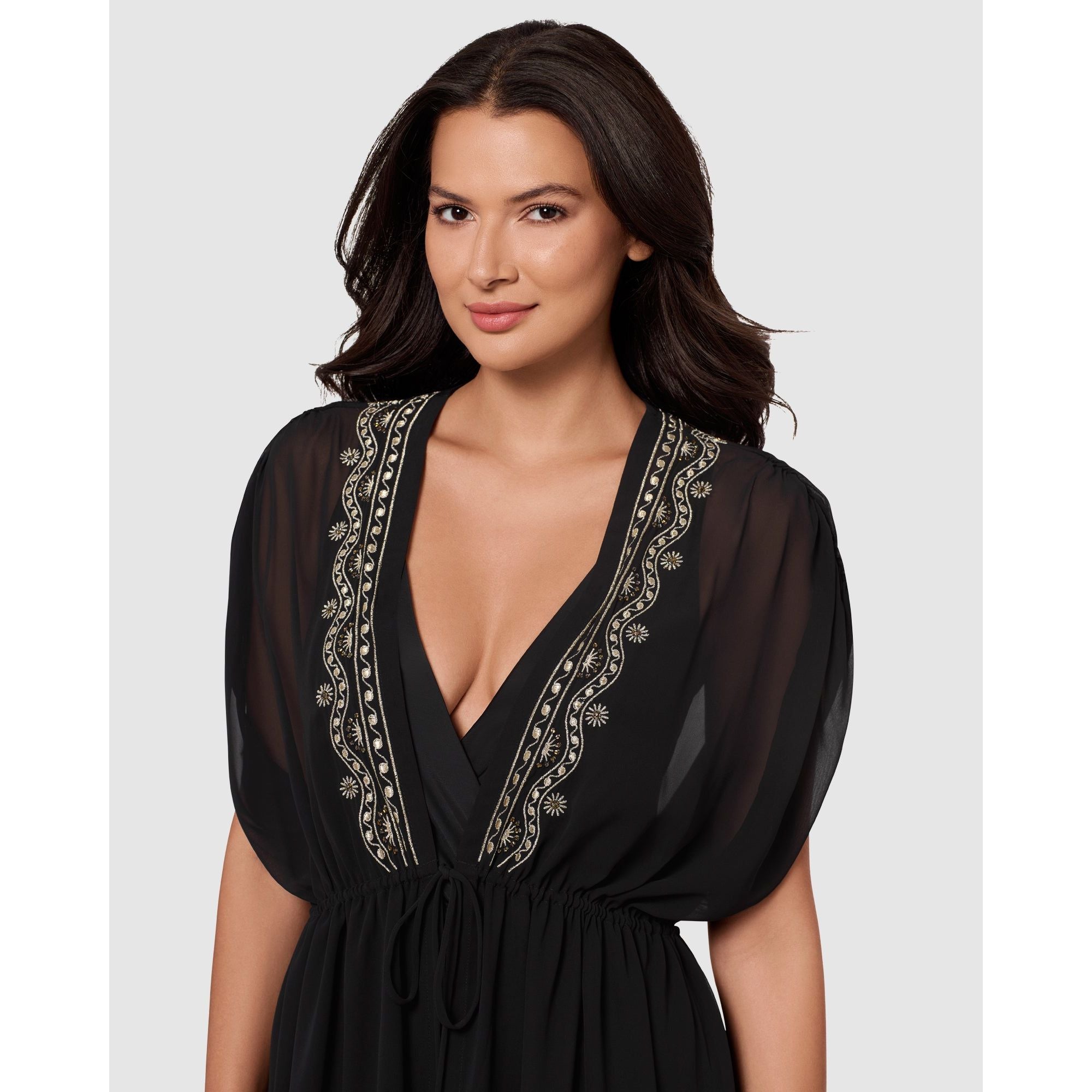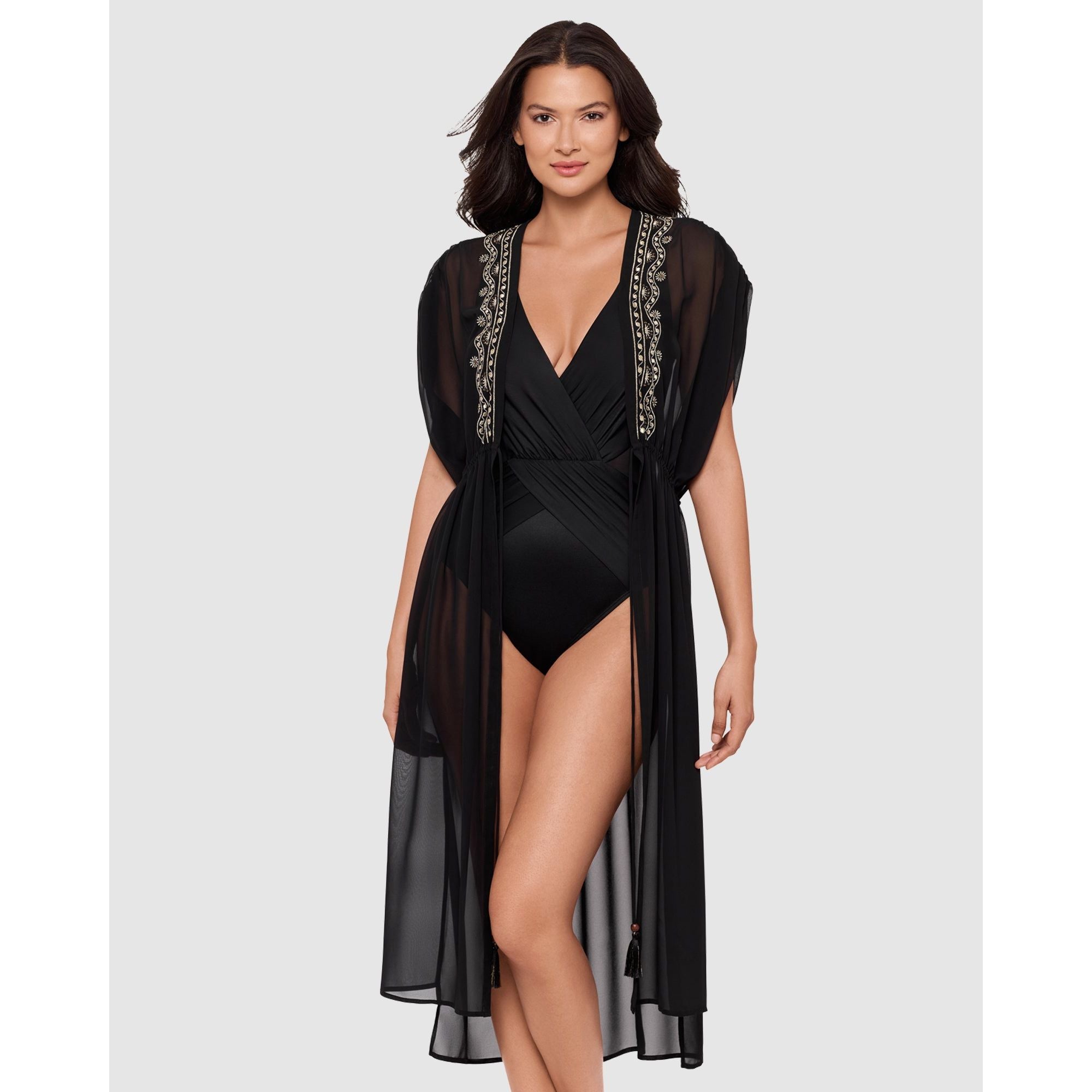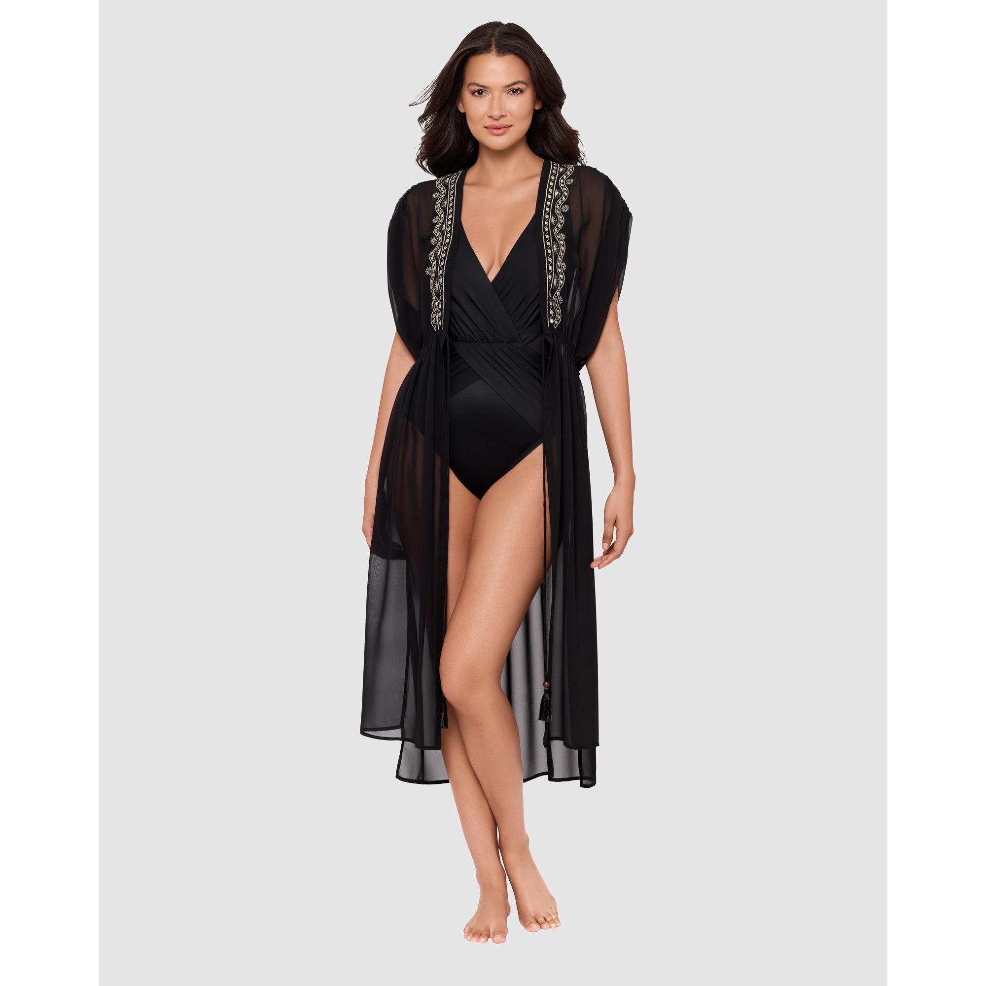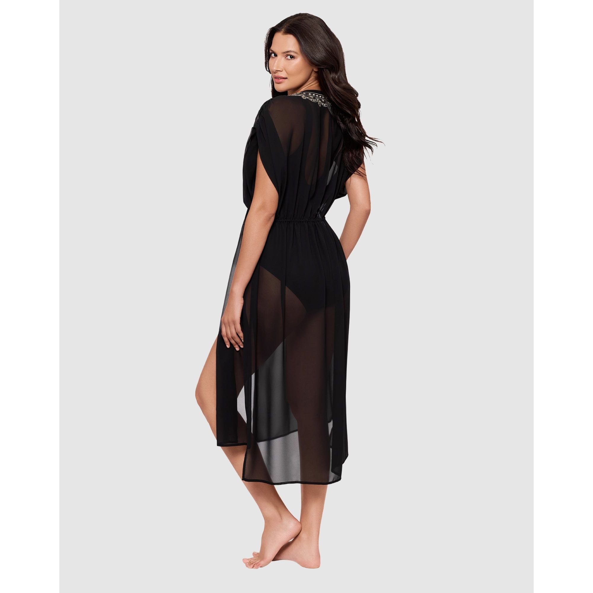 Perfect for pool parties, resorts, or just looking fabulous at the beach (pair it with your favourite little black swimsuit!), this swim cover up is as comfortable as it is chic thanks to the easy, open-fronted fit which ties at the waist. The beaded tassel ends on the waist ties, plus embroidery and hand-beaded details around the neckline, both add a luxury vibe to this sheer beach robe.