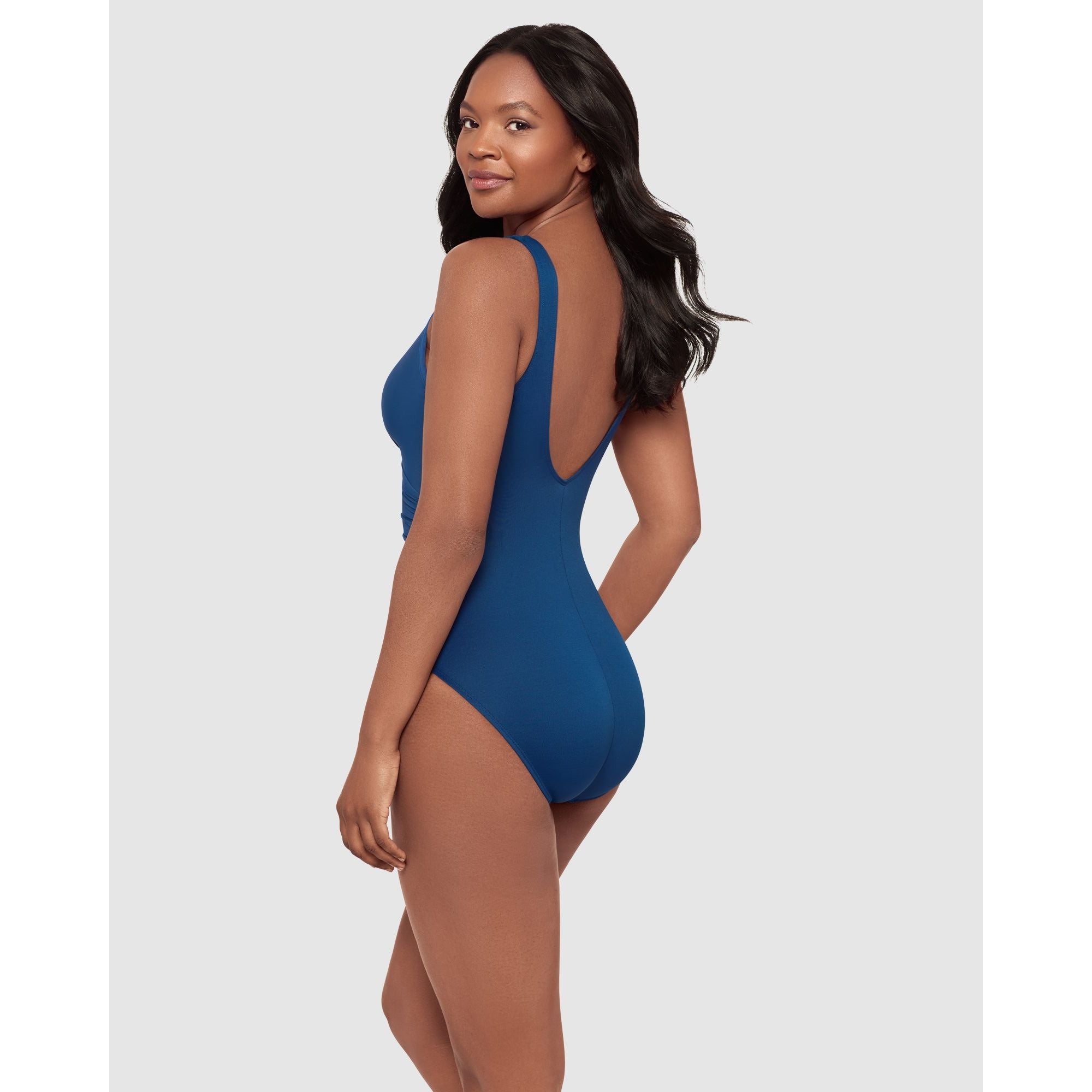 Step into this one-piece swimsuit and discover a slimmer, shapelier new you! Made from Miraclesuit's powerful Miratex fabric, it provides all-over control without relying on linings or shaping panels, for maximum smoothness with no added bulk. This slimming bathing suit also has underwired cups with moulded foam padding, which frame a stylish cut-out detail. It's finished with gathering that flares out from one side of the waist, to visually enhance the hourglass effect.