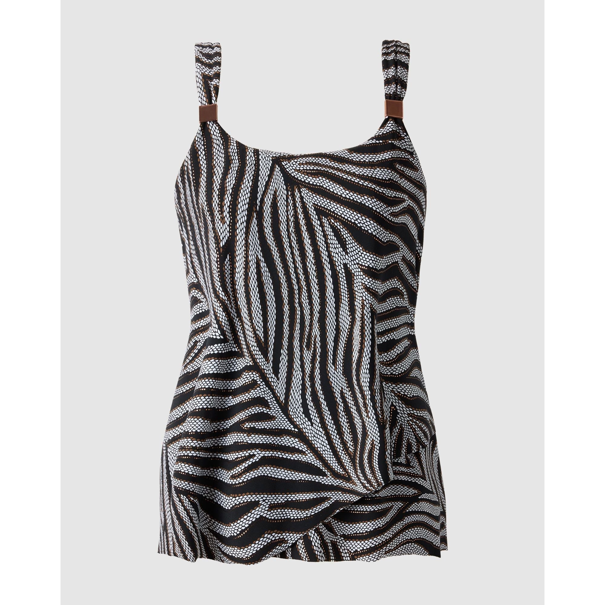 Don't let body worries put a damper on your day at the beach with this floaty tankini top, which completely covers your tummy thanks to its double-layered and loose fit design. Hidden underwire lifts and supports your bust, while jewellery accent details on the straps adds a touch of elegance.