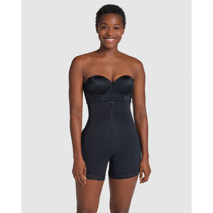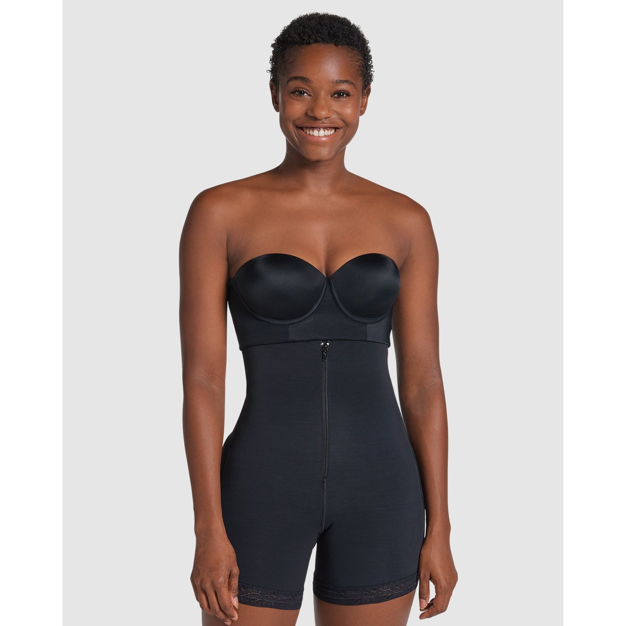 Get firm slimming and smoothing from your bra band to your thigh with these zip front shapewear shorts, which are made from sculpting PowerSlim® with a soft microfibre lining. Not only do these also function as butt lift shorts thanks to the MagicUp® bands and ruched rear seam, but the design also incorporates stylish lace leg trims (with an anti-slip gripper lining) and removable thermofused straps for extra stays-put support.