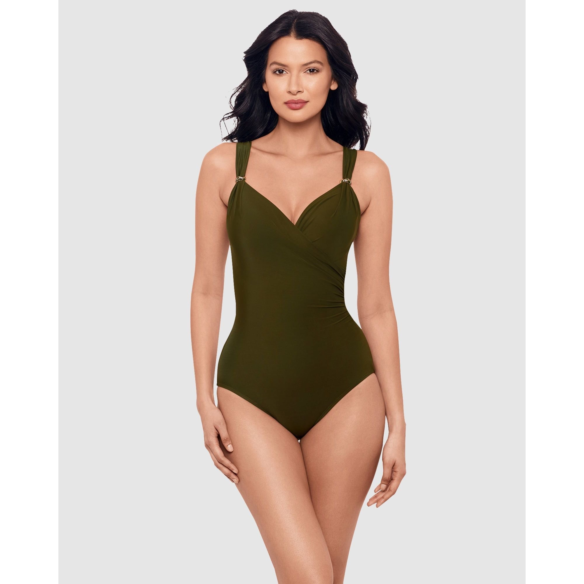 This one-piece swimsuit cleverly molds hourglass curves, so you can feel more confident than ever by the water. A single-layer of Miratex fabric provides all the body-smoothing and tummy-flattering control you need without added shaping panels, while a crossover neckline and subtle draping detail creates the illusion of a smaller waistline. This slimming, shaping swimsuit also features foam cup lining and hidden underwires for lift and support.