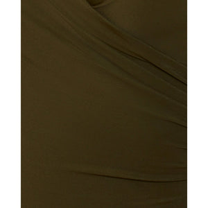 Fabric composition: Body - 69% Nylon, 31% Spandex. Drape - 82% Nylon, 18% Spandex.