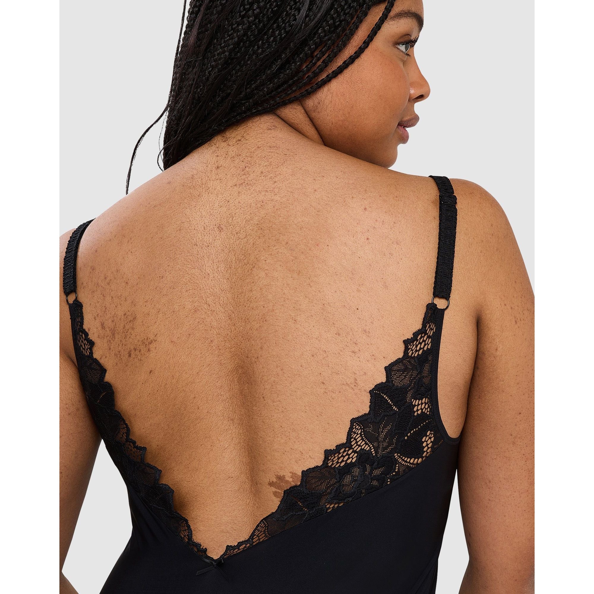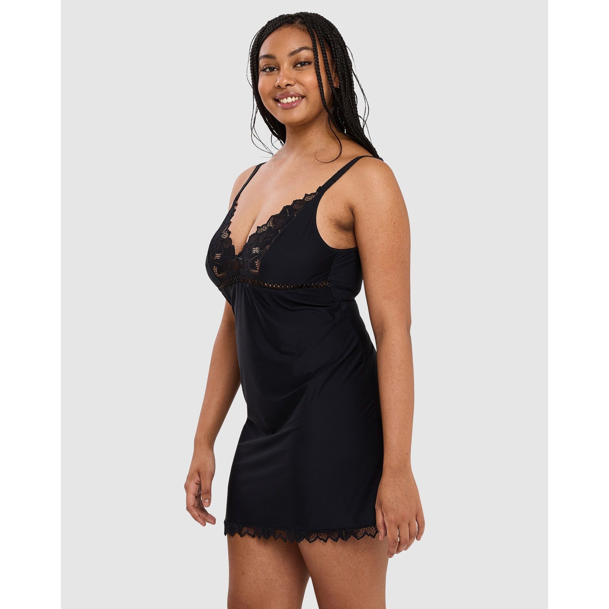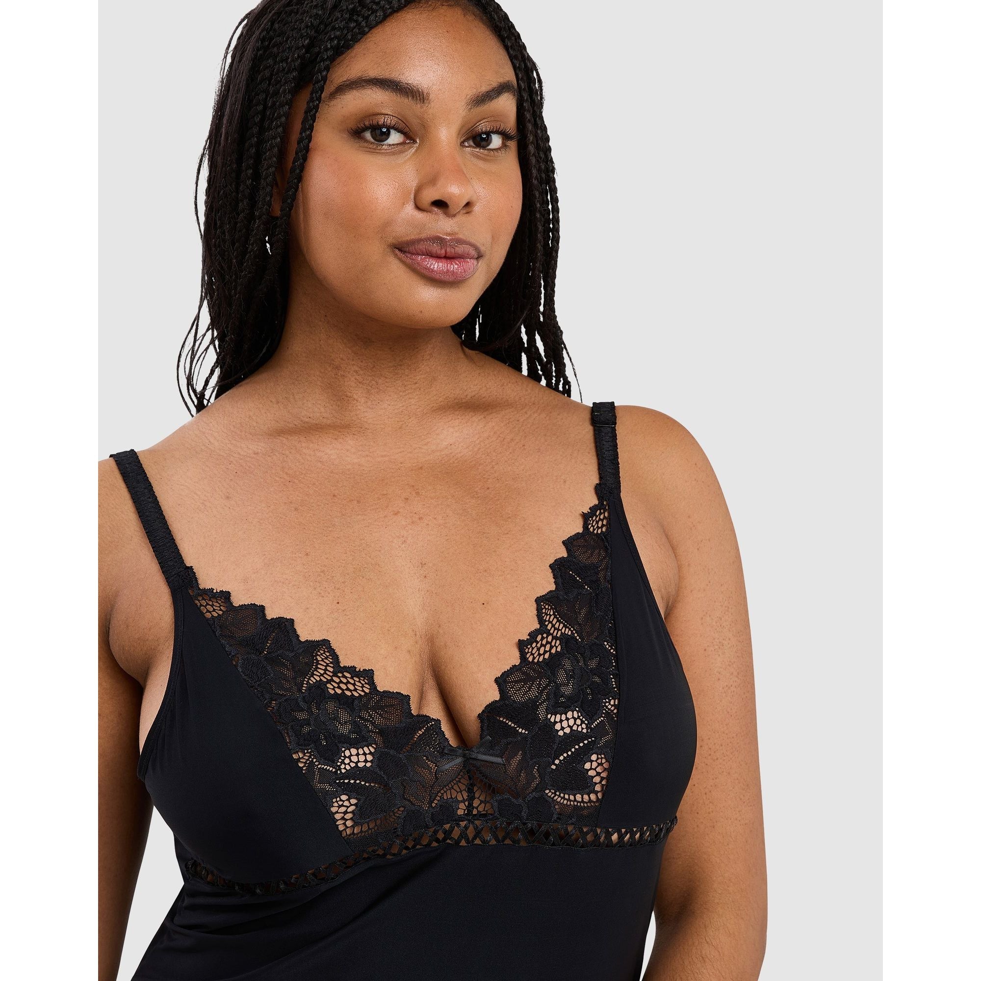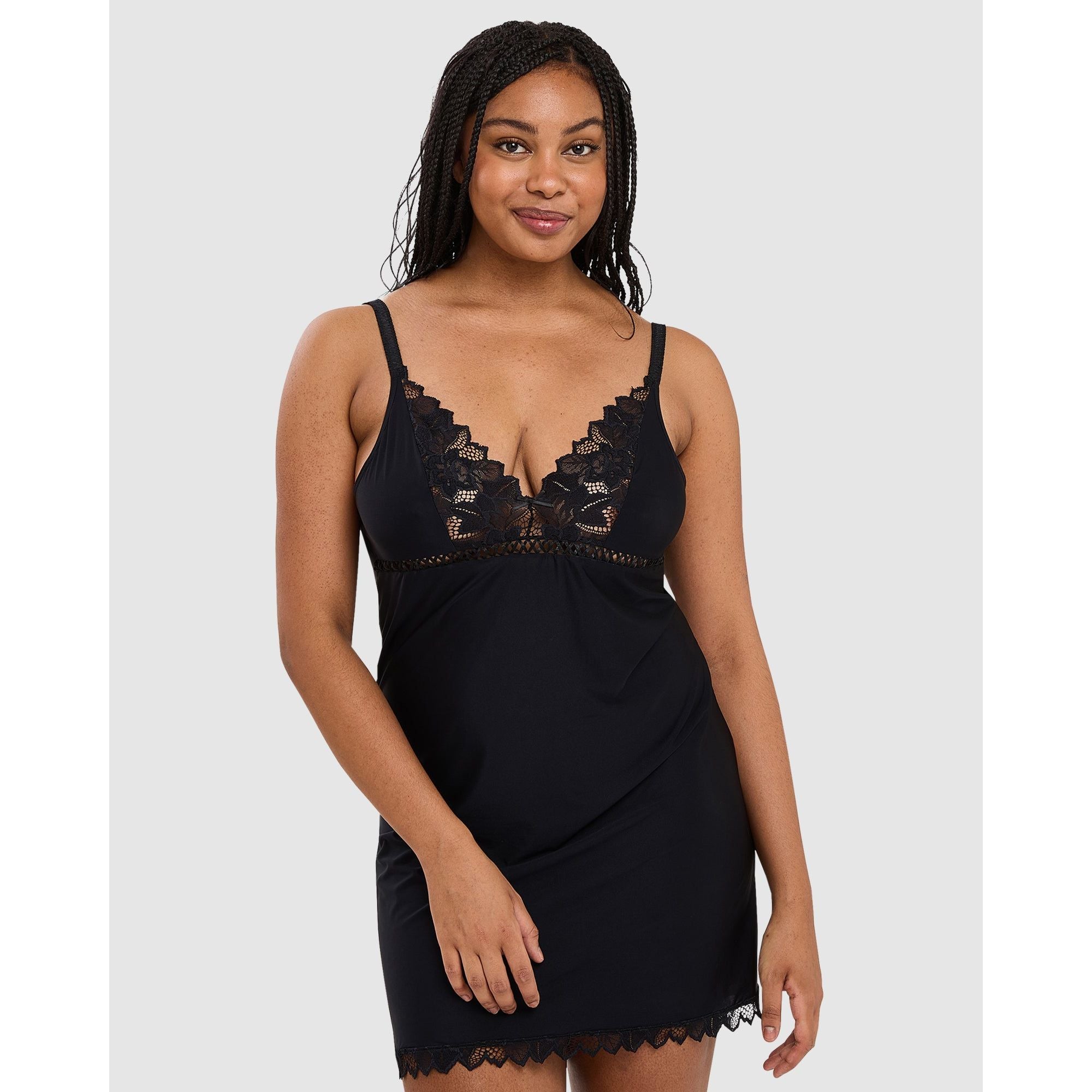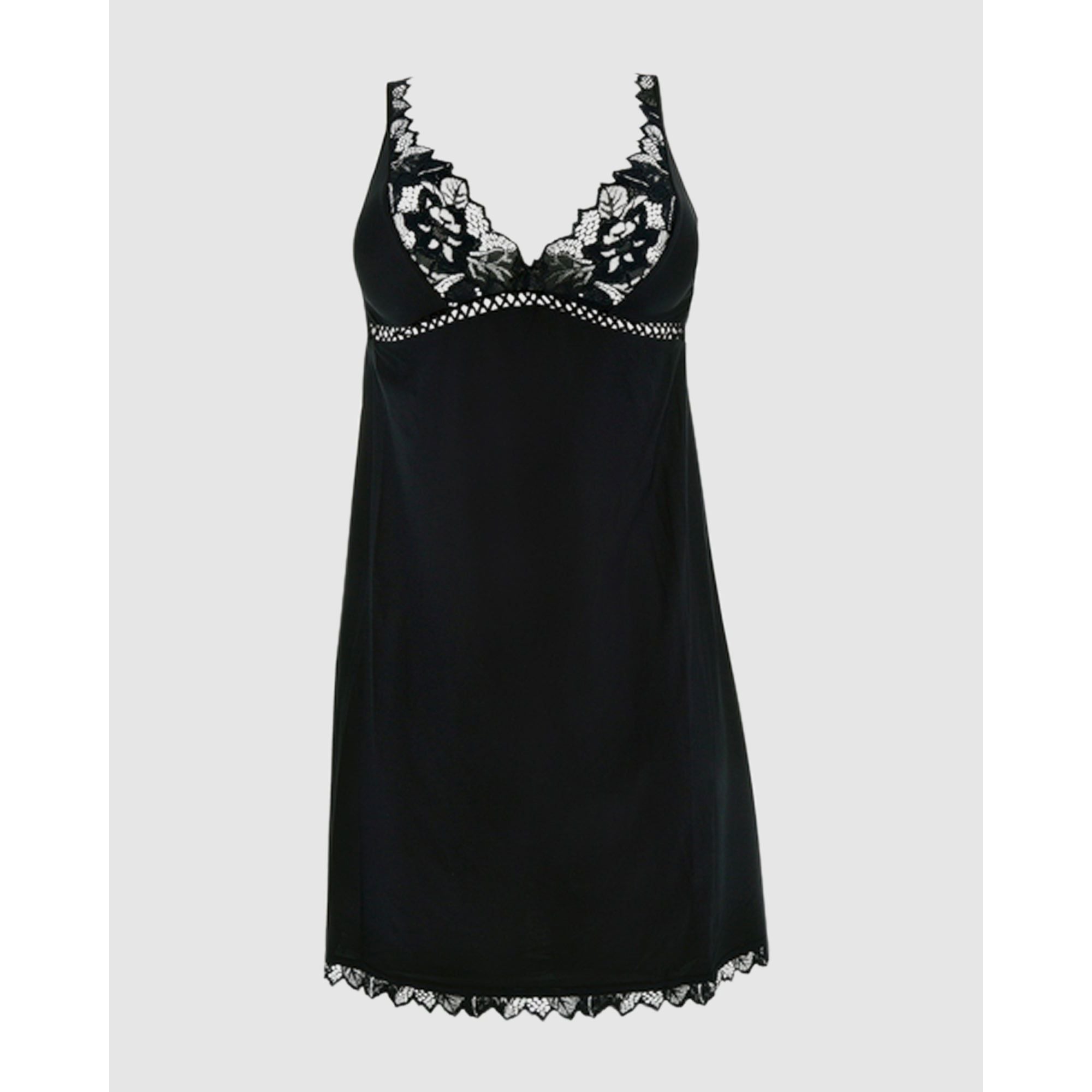 Sleep the night away in dreamy comfort and sensual style with this soft microfiber chemise. The lace trim nightdress design takes the best bits of the brand's signature Arum lingerie collection - an iconic leafy lace pattern and transparent ribbonwork details - and applies them to this chic, short nightdress shape with a seductive low-V back and plunging front.