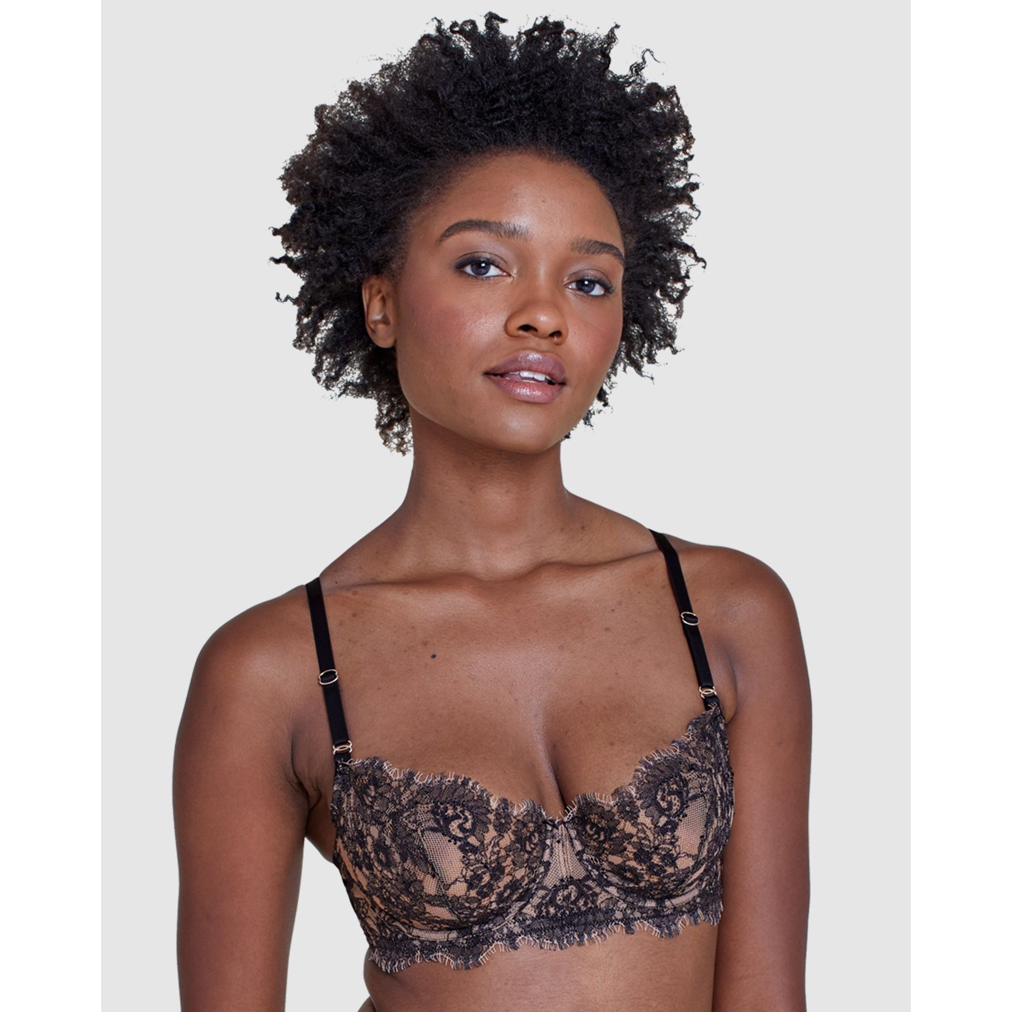 A sexy lace bra with a breath-taking look, this sheer lace balconette is sure to be a favourite in your lingerie drawer! The unlined, cotton-blend lace features a scalloped eyelash edge, and the straps are front-adjustable so you get maximum visual impact from the luxurious gold-tone hardware!