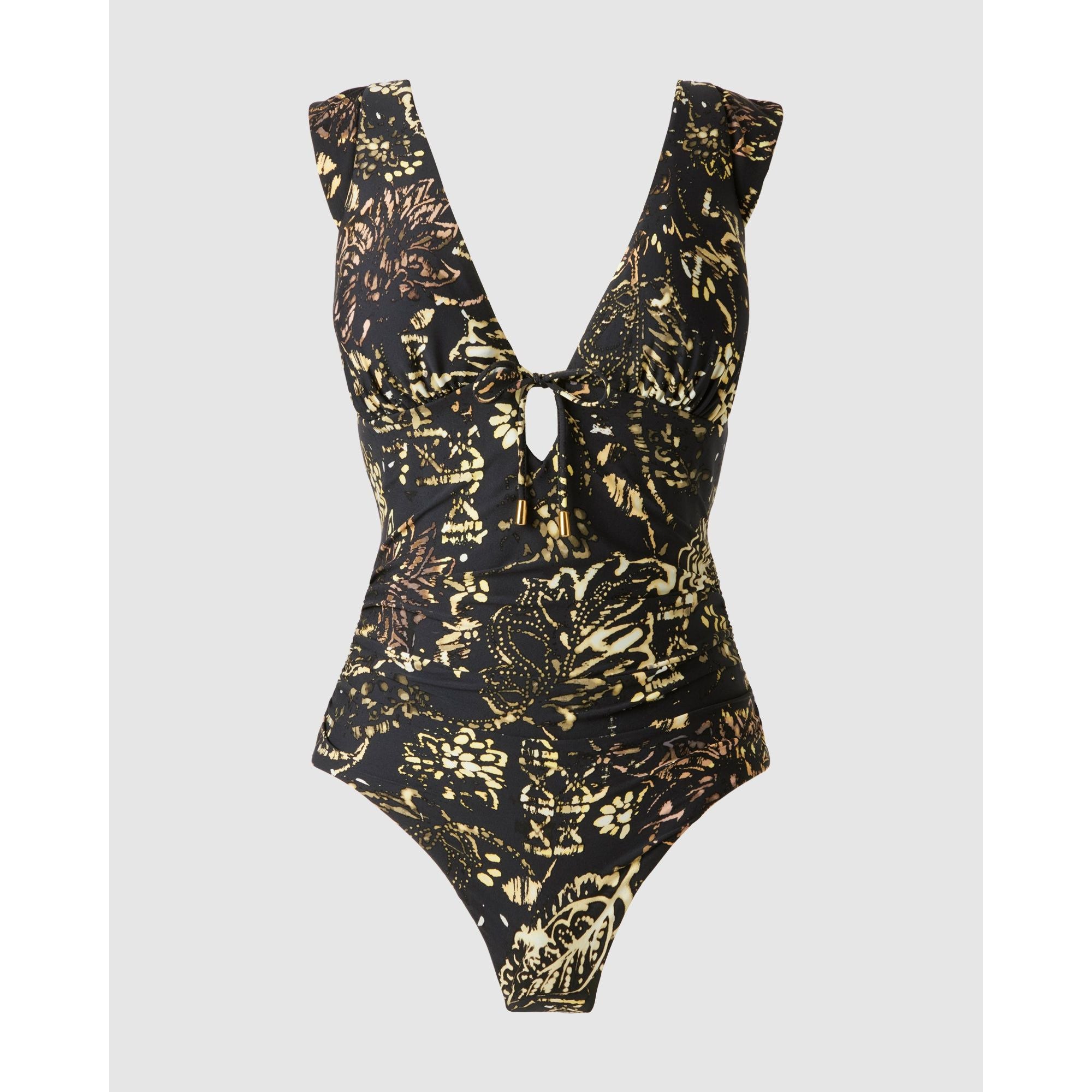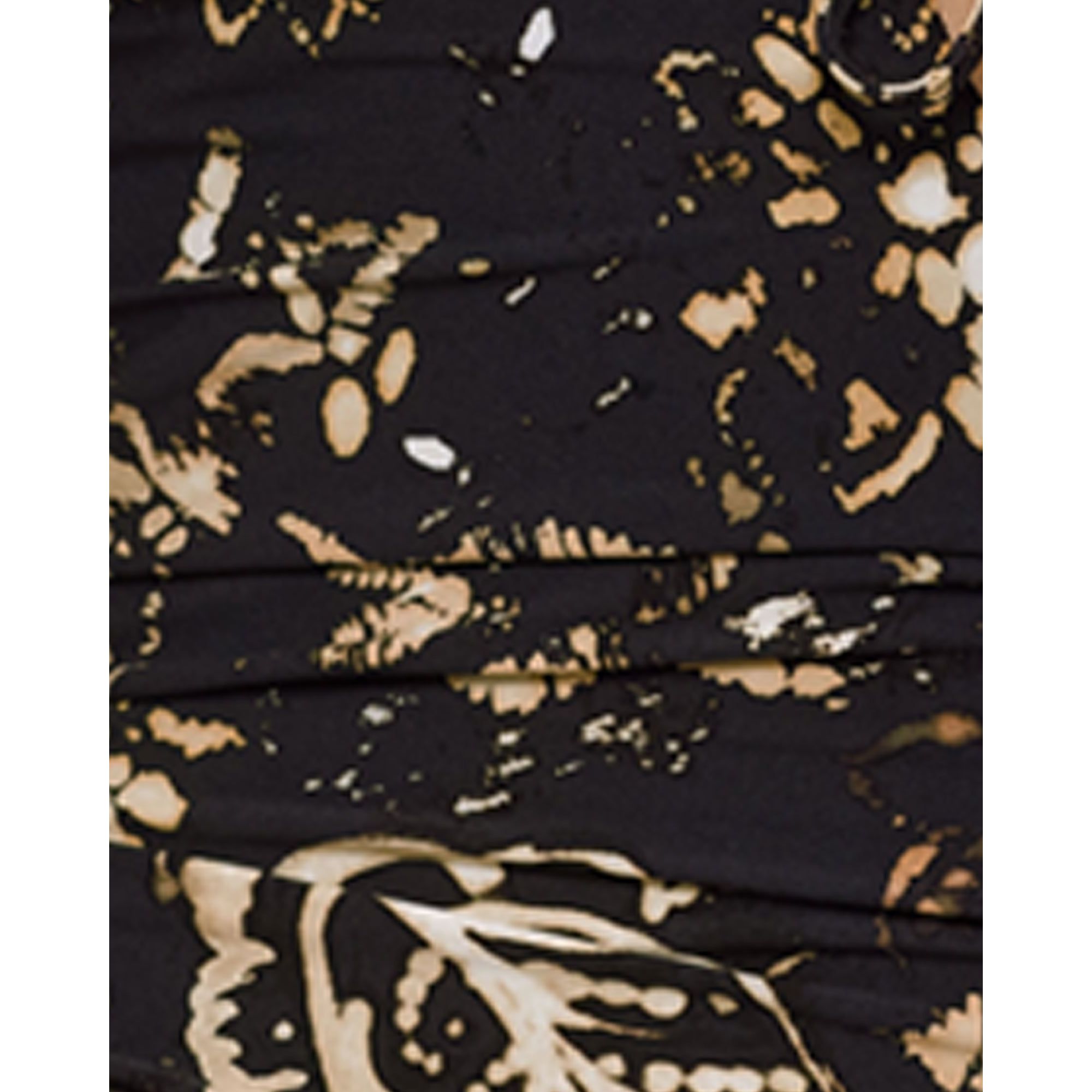 Party in the front, party in the back; this slimming tummy-control swimsuit features a deep plunge neckline framed by wide straps and accented with an adjustable spaghetti tie, plus a stunning open portrait back with a golden clasp closure behind the neck. Gentle shirring at the sides subtly enhances your figure, and the hidden support with removable padding adds shape to your bustline.