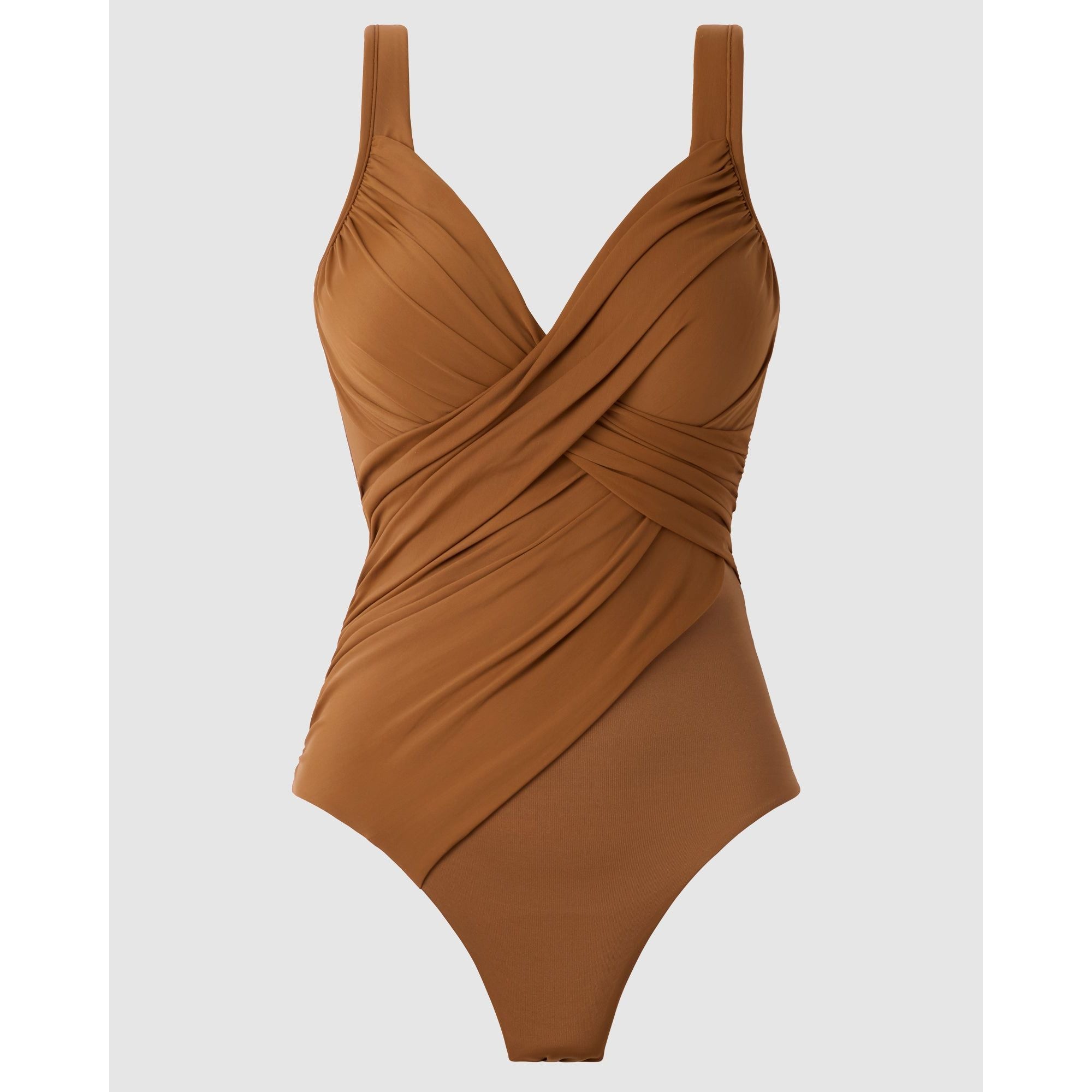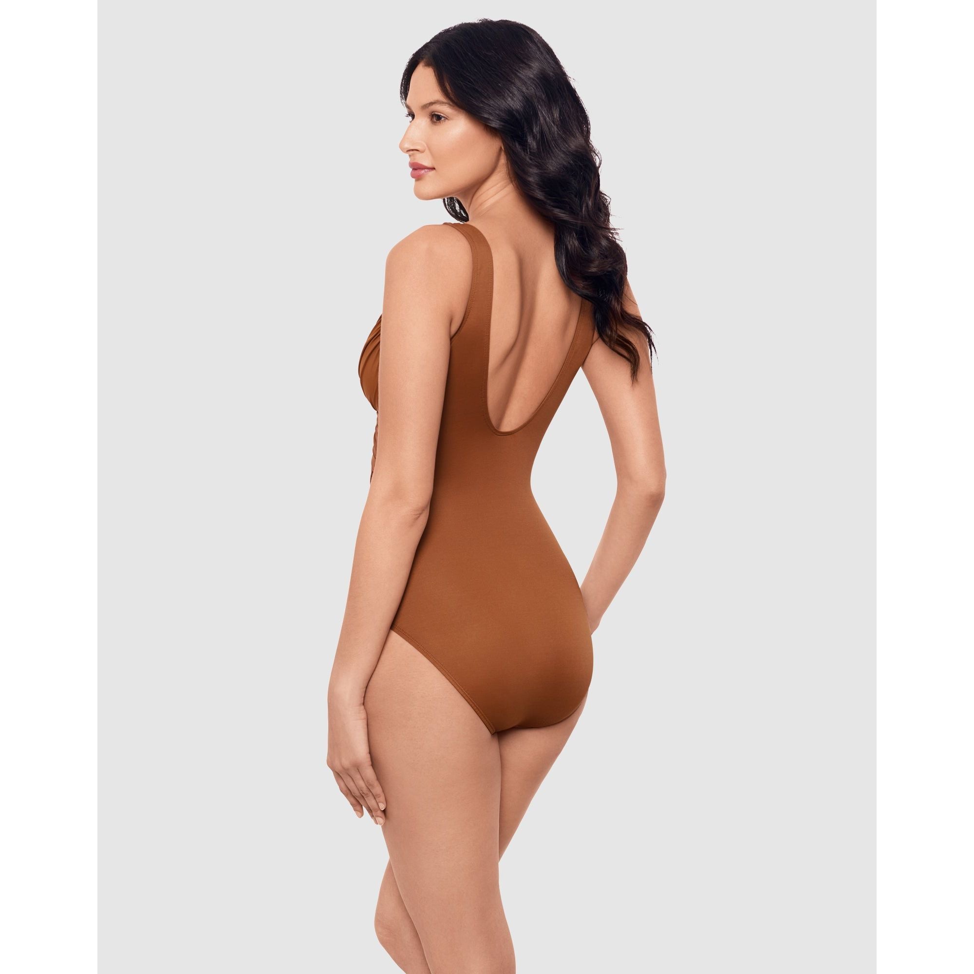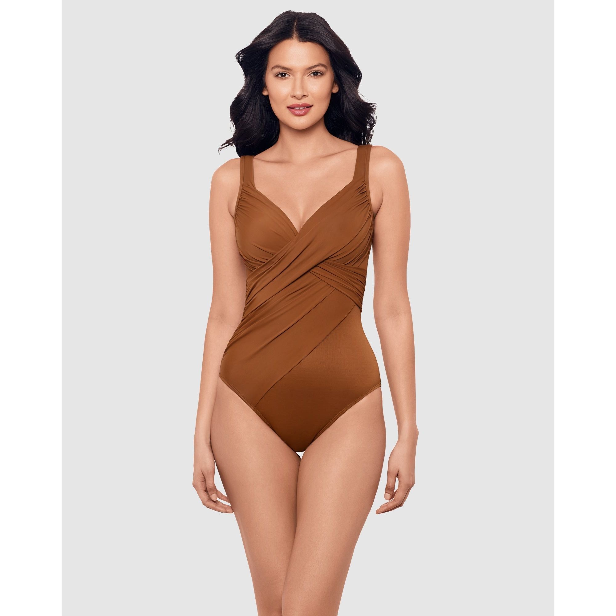This one-piece shaping swimsuit will reveal curves you never knew you had. With a crossover neckline that leads into tummy-flattering draping, this slimming bathing suit sculpts the illusion of an hourglass figure while also providing all-over smoothing via Miraclesuit's unique Miratex fabric. Hidden away inside are underwired, foam-lined cups, so your cleavage will get a confidence-inspiring boost too!