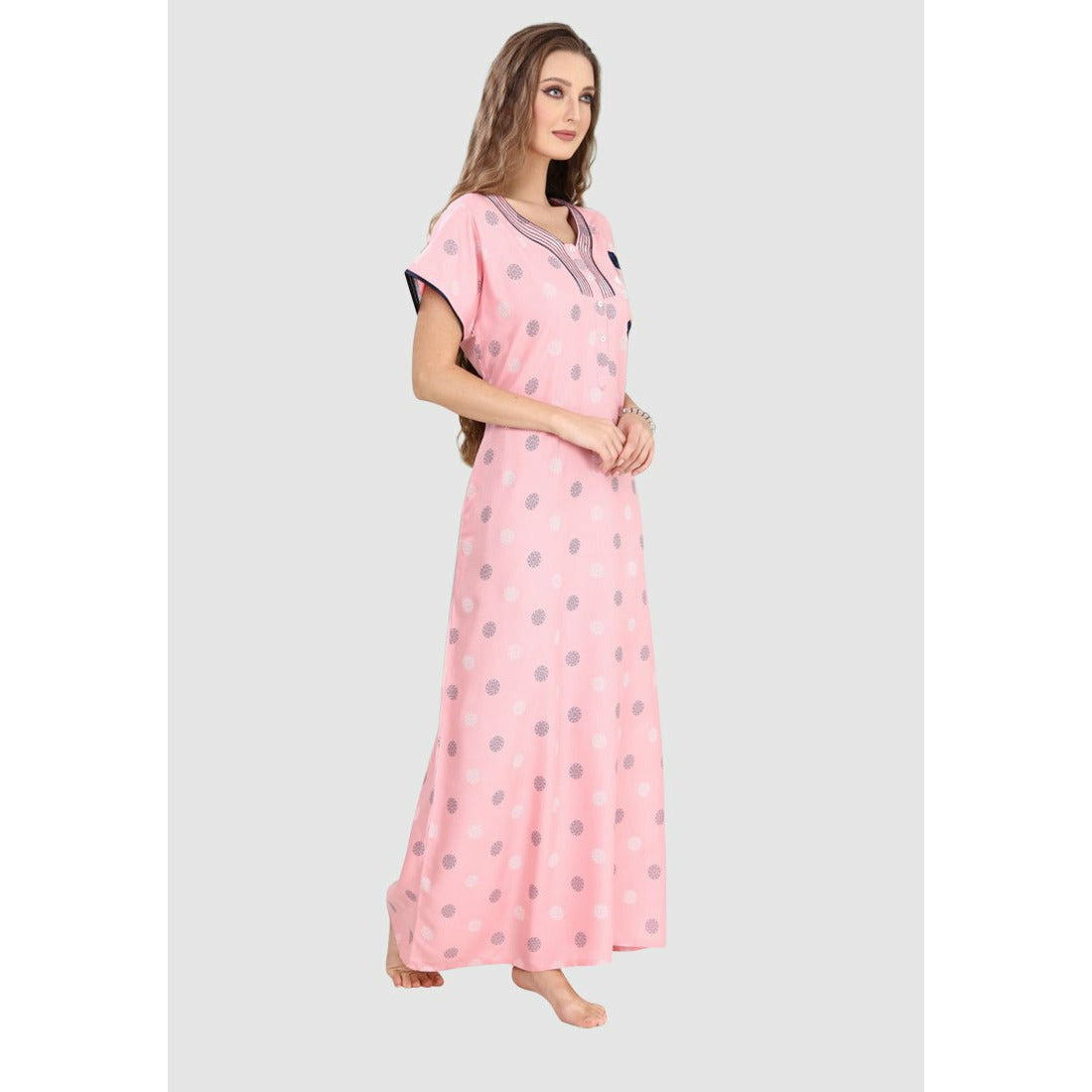 Lounge or slumber in dreamy comfort in this long nighty with a button up neckline, which is made from rayon fabric. Manufactured using plant cellulose, rayon is naturally breathable and ultra-soft, making this an exceptionally comfy nighty and one that you can wear year round. Printed with geometric flowers, it's also adorned with floral embroidery and contrast trims at the neckline and bust.
