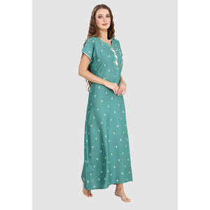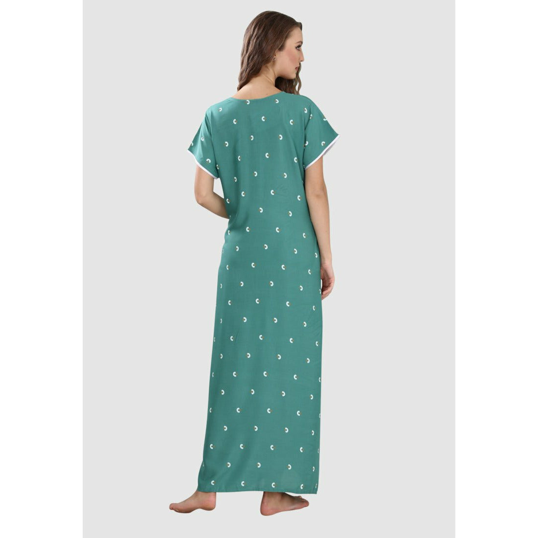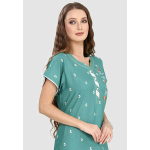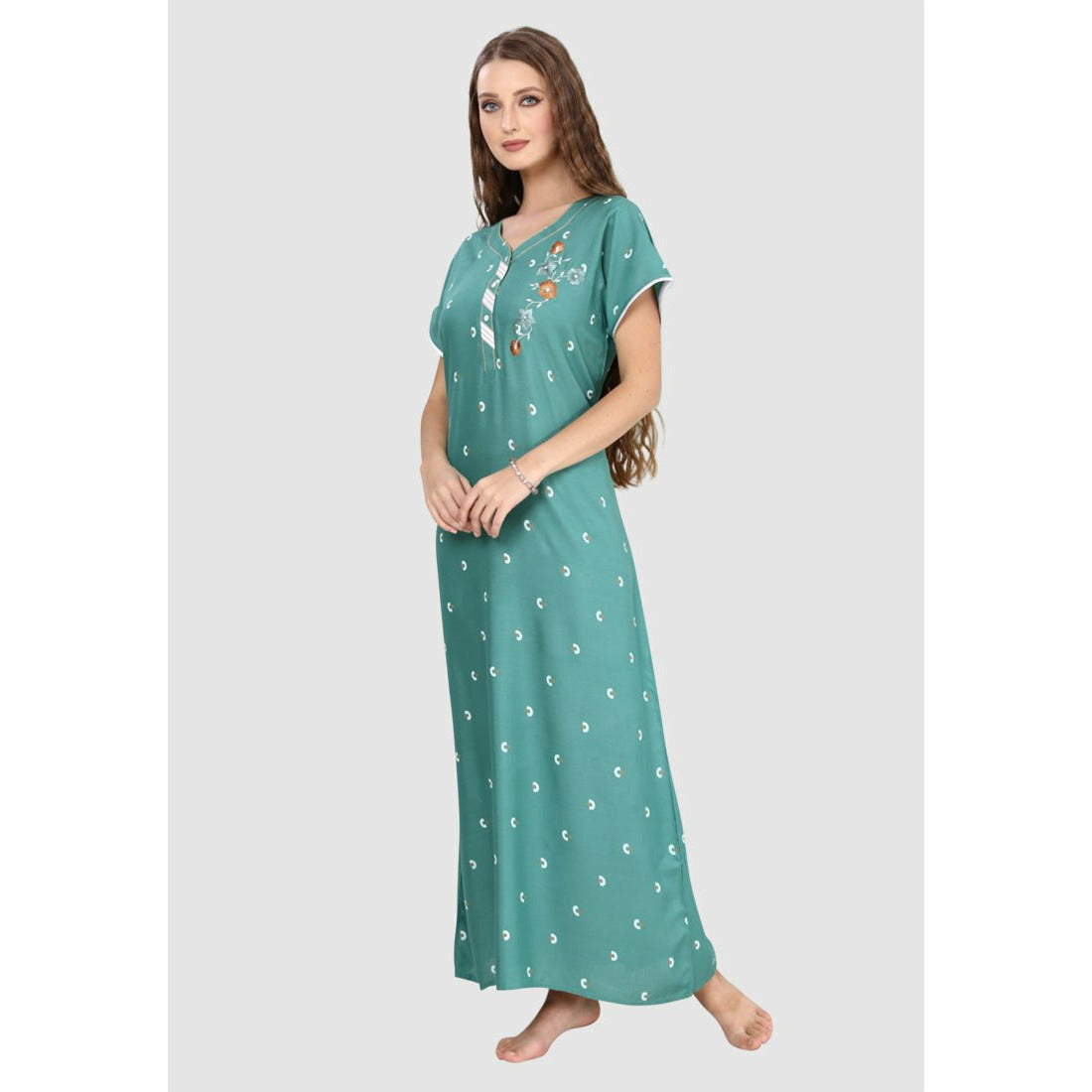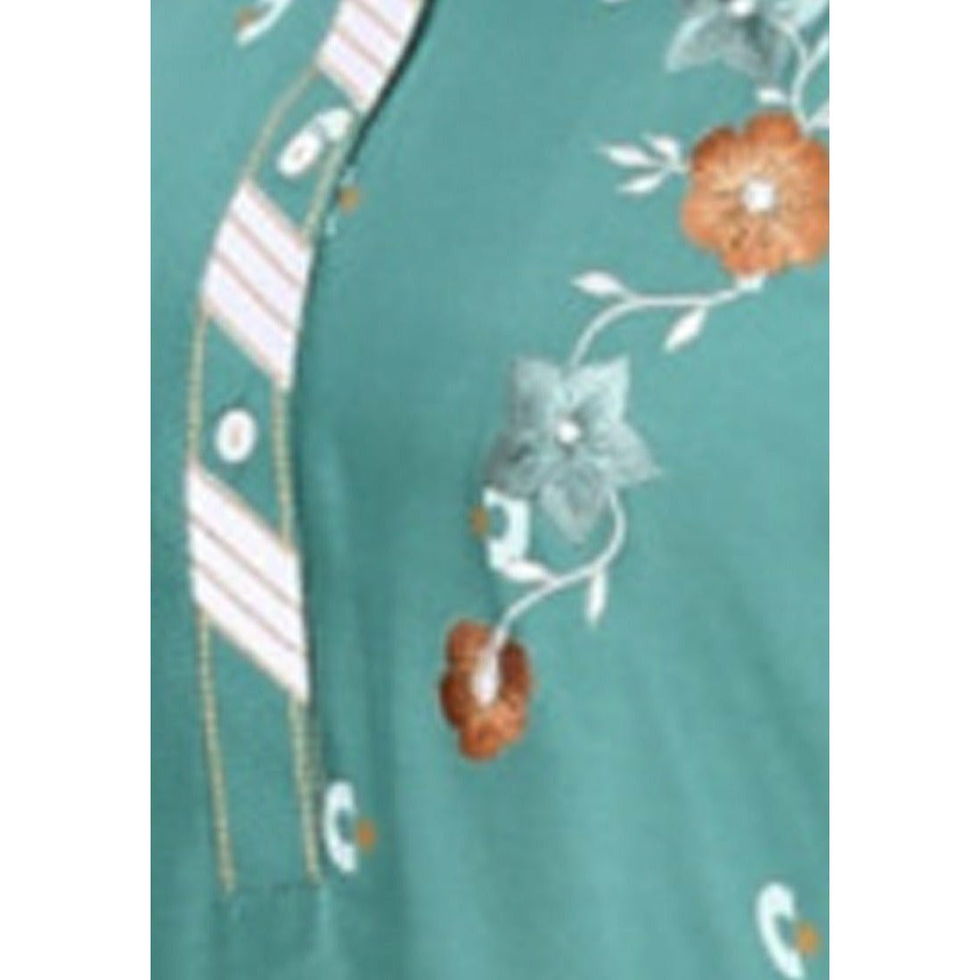 When it comes to breathable sleepwear, look no further than this flowing sleep dress which is made from rayon fabric. Derived from plant cellulose, it's known for its soft feel and breathability, making this an incredibly comfy nighty you can wear through all four seasons. Featuring a geometric print, it's also decorated with floral embroidery and has contrasting colour on the button placket and hems of the sleeves. Also perfect for wearing as a lounge dress with your favourite slippers!