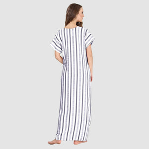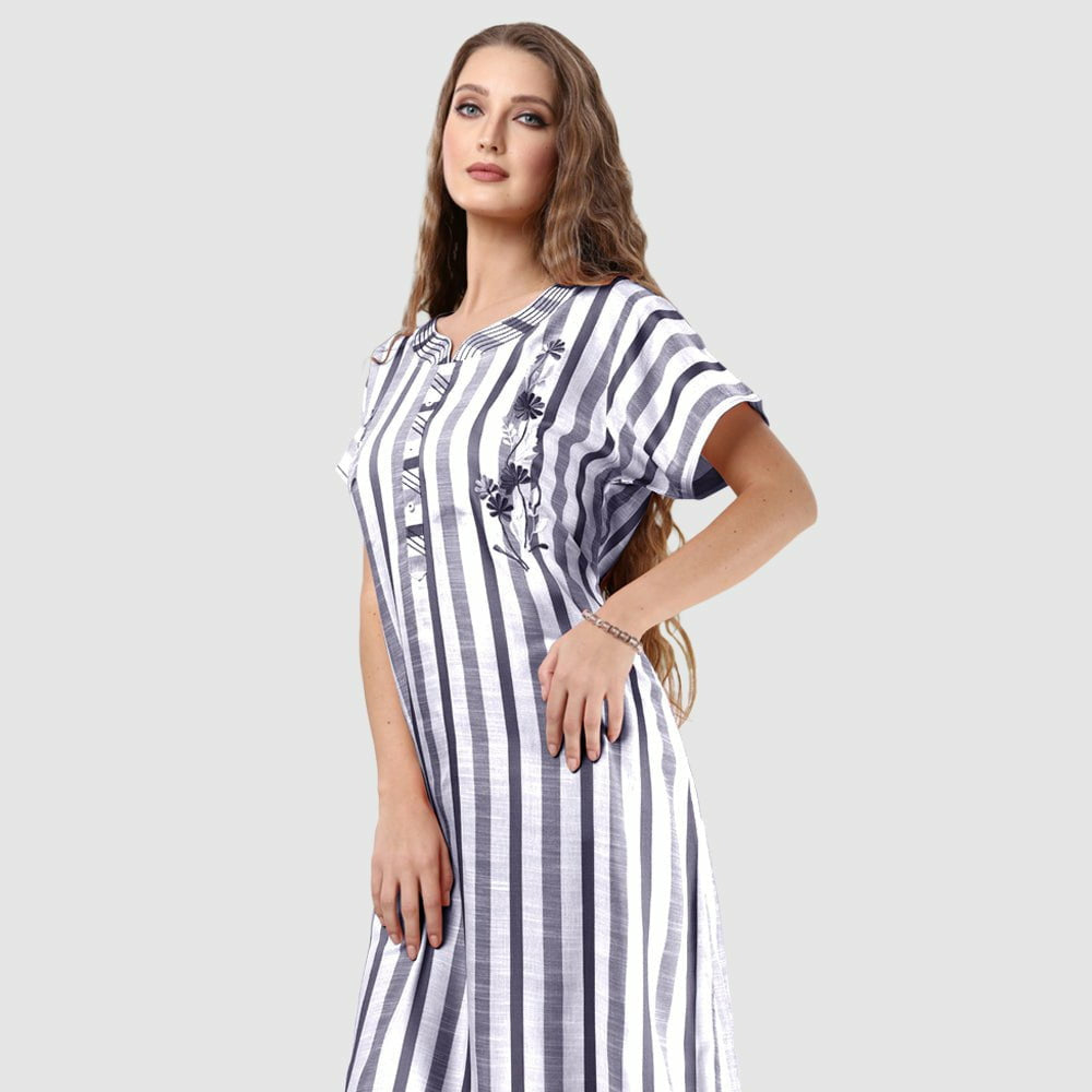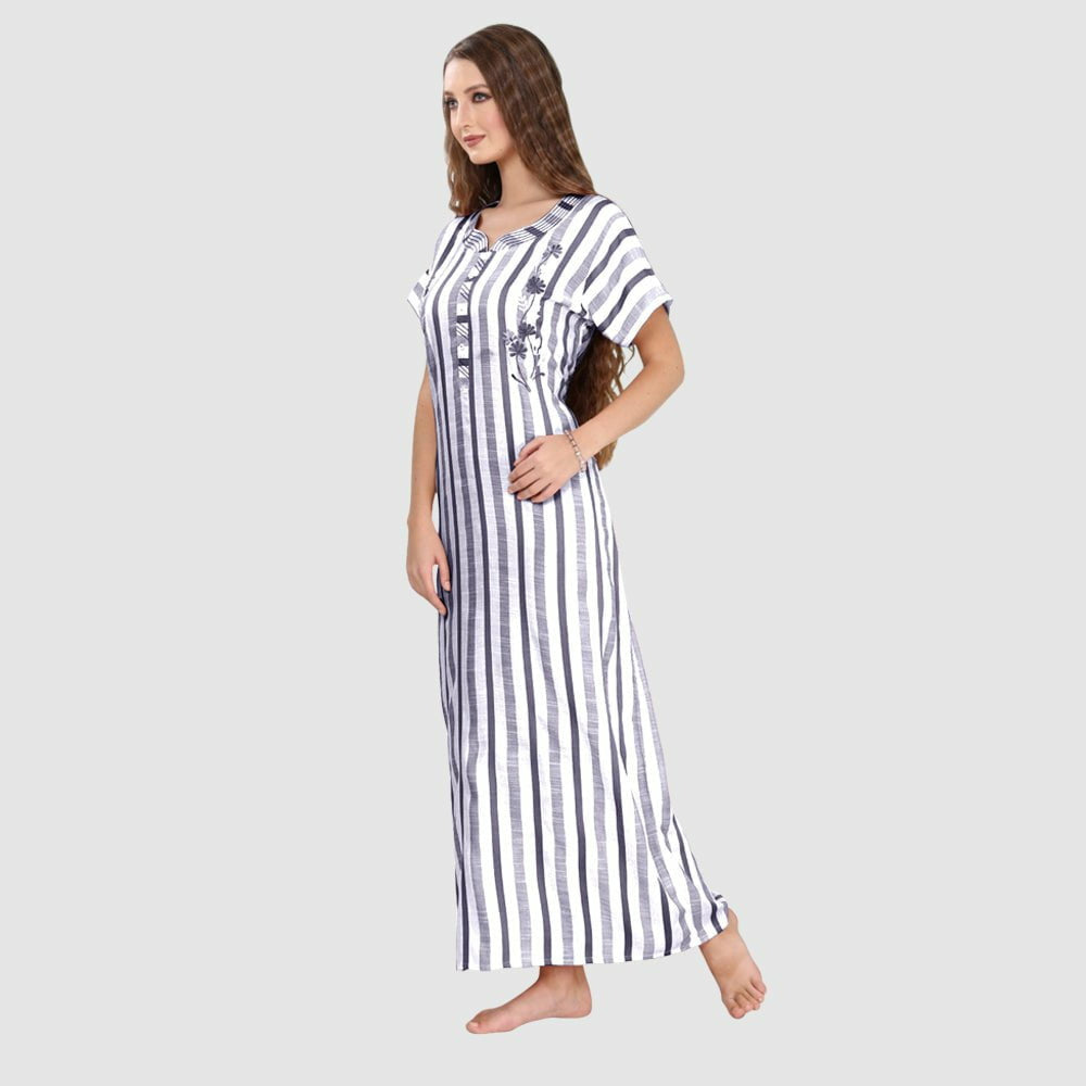 Get ready to discover your most comfortable sleep dress ever! This long nighty is made from rayon, a natural fibre-based fabric that's made from plant cellulose and which is known for its softness and breathability. Printed with stripes and embroidered with a floral design, the free-flowing fit enhances the comfort further - it's a good thing this soft nighty also makes a fabulous lounge dress, because you won't want to take it off come morning!