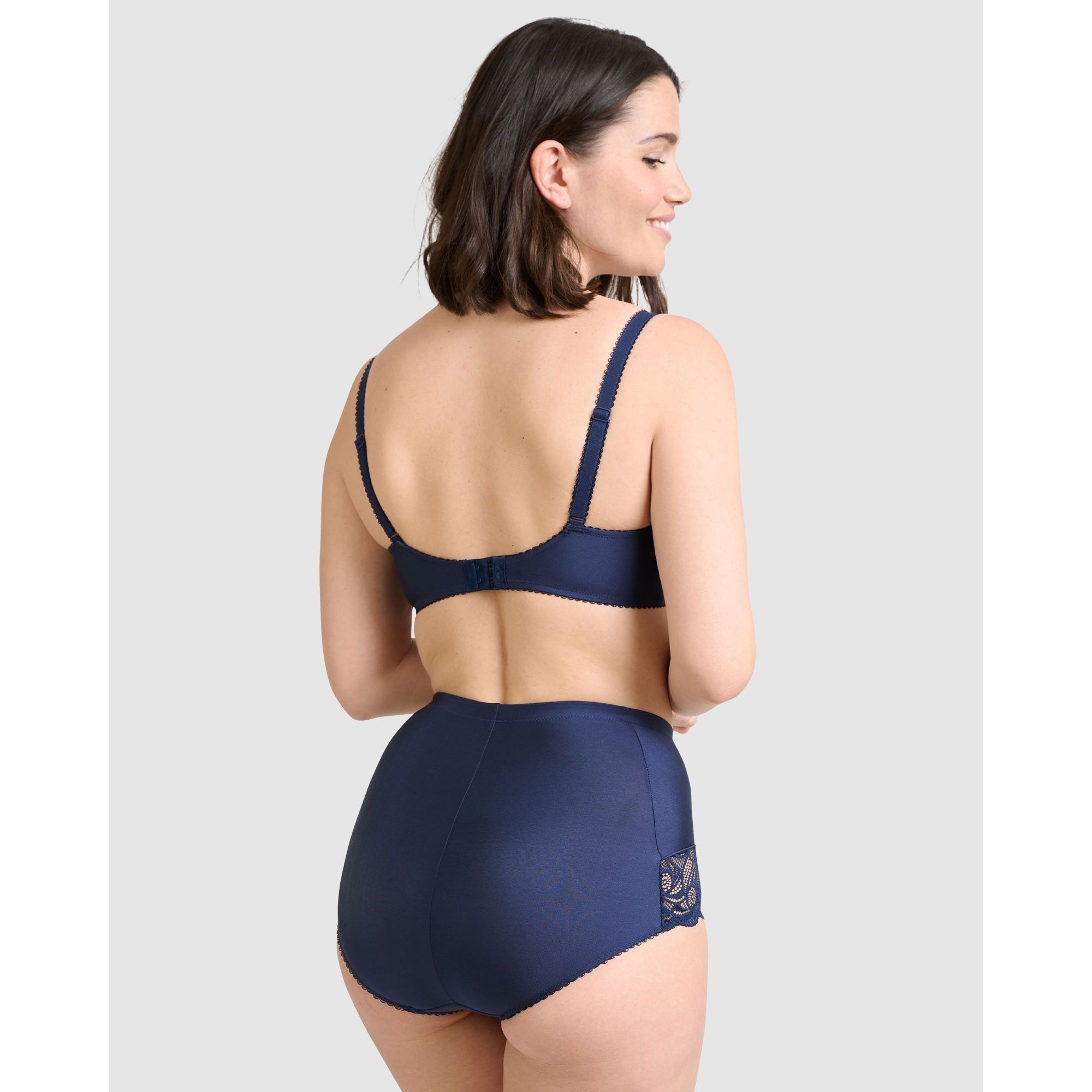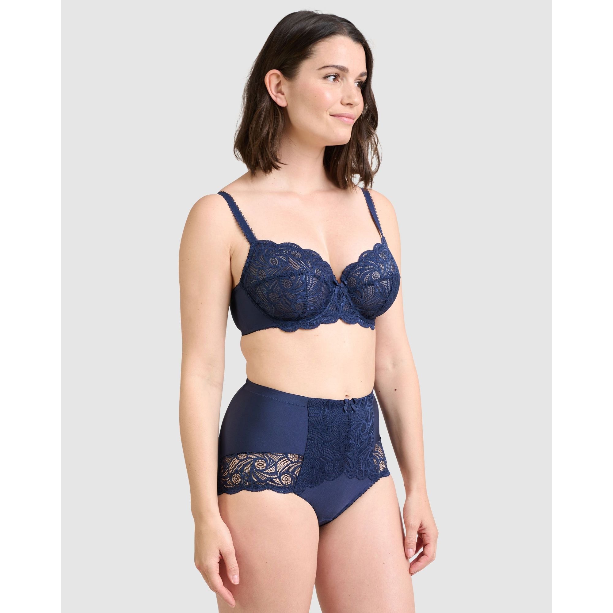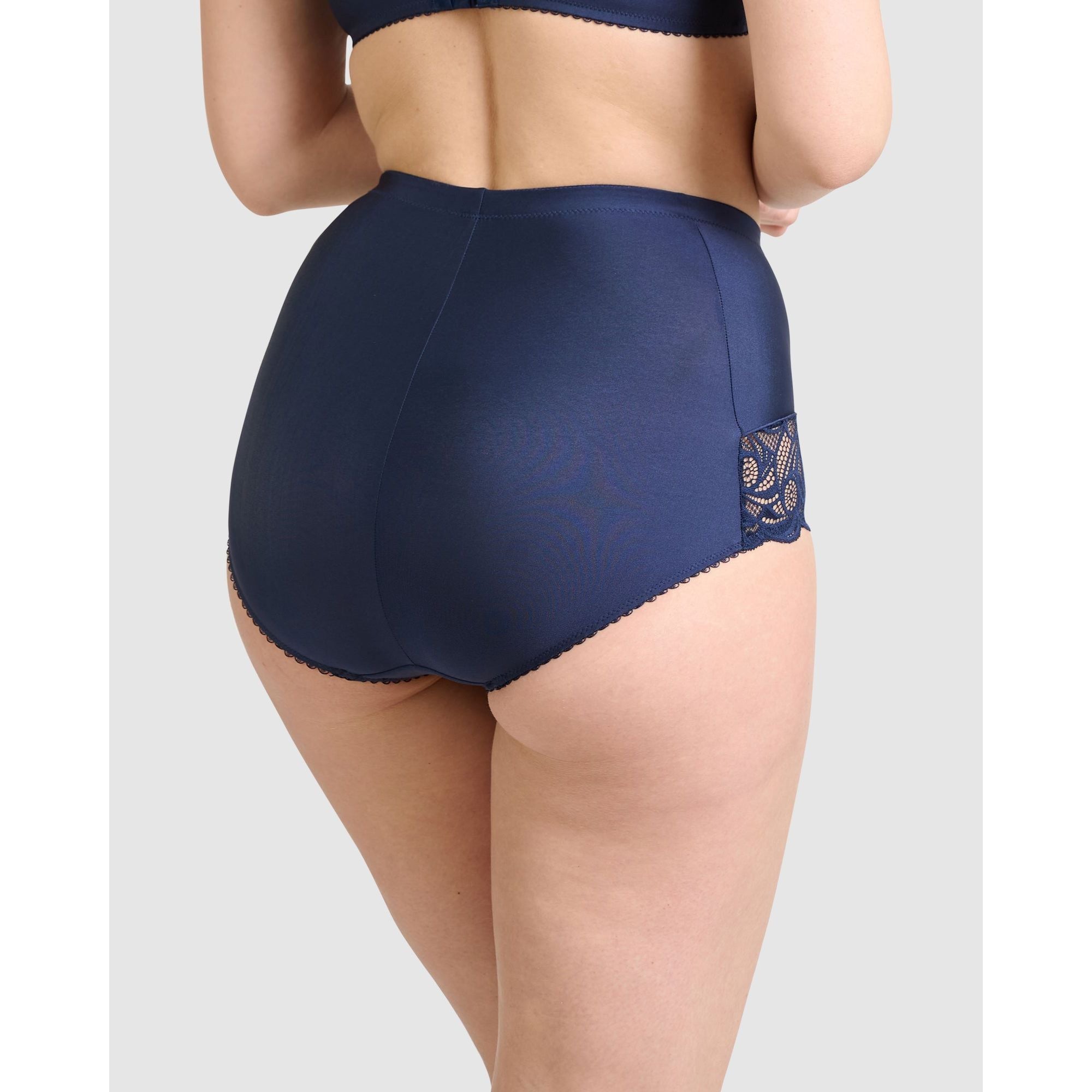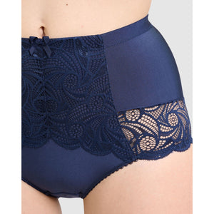Enjoy subtle smoothing and a retro-meets-modern look in this high waist brief. Panels of swirling lace decorate the front of this incredibly soft microfiber brief, while the back features a curve-enhancing seam up the middle. A front lining gently flattens your tummy - wear this figure-hugging lace brief under skirts and dresses when you want to comfortably smooth away lumps and bumps without the restrictive feel of a firm control brief.
