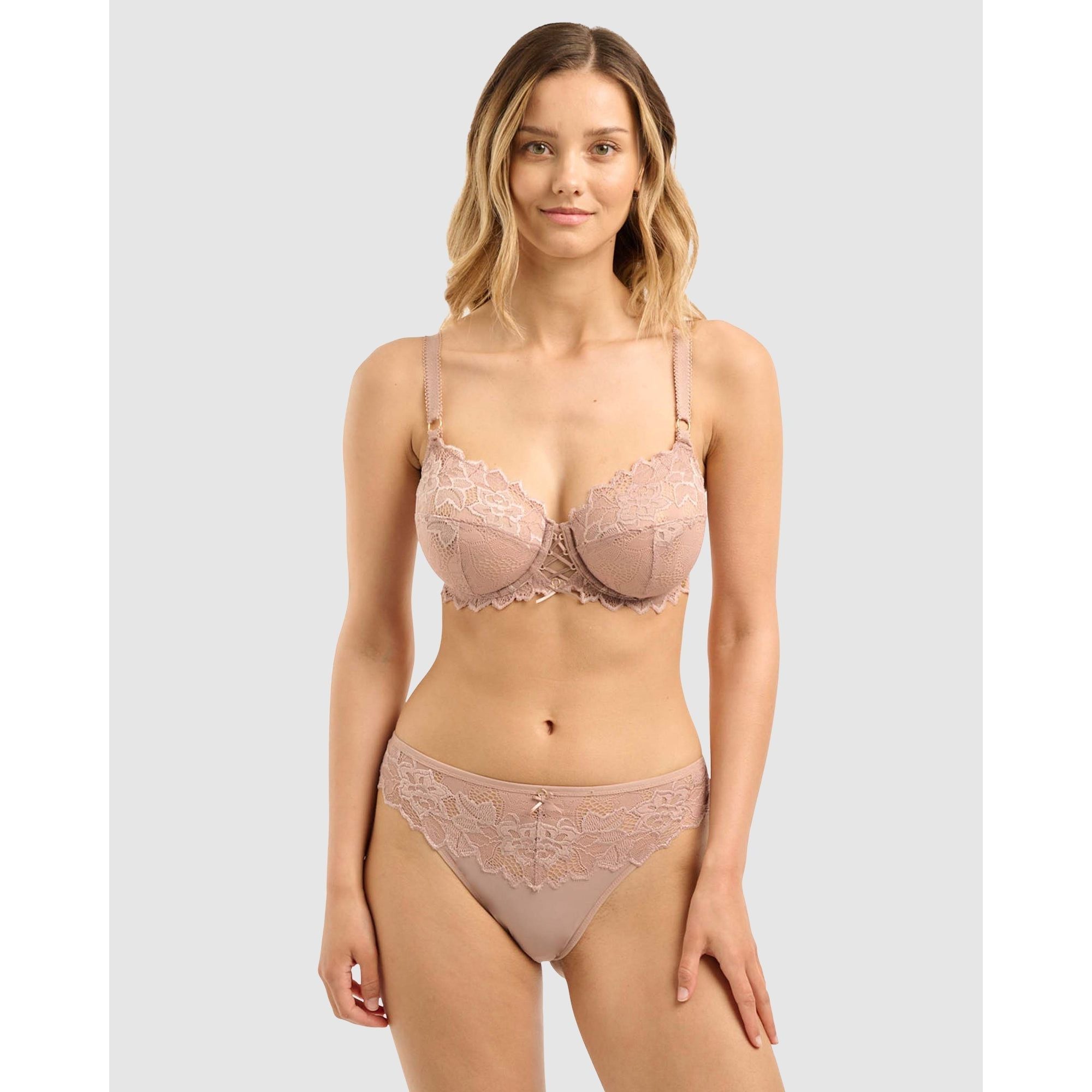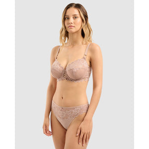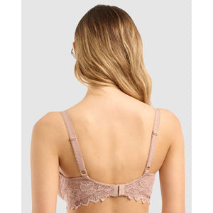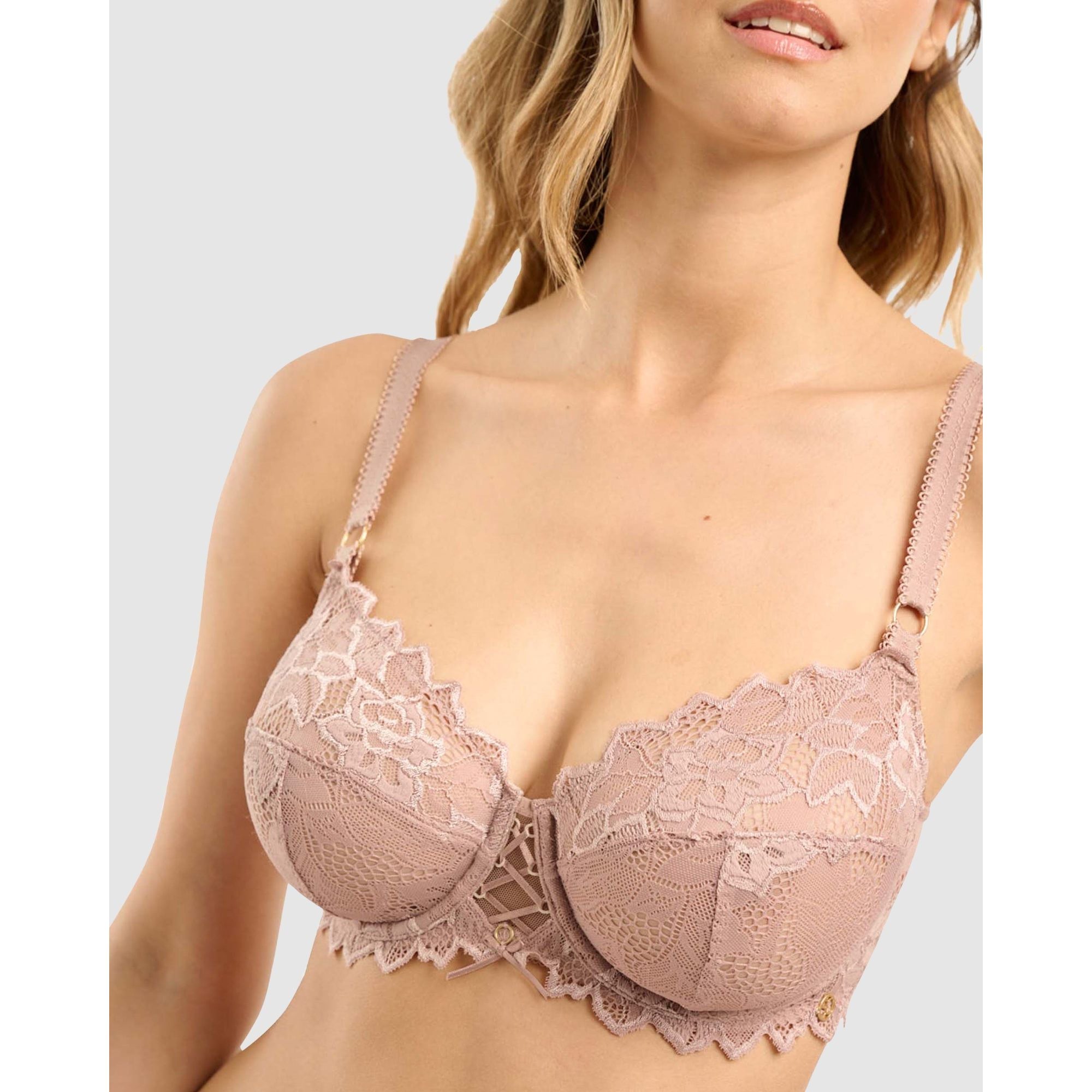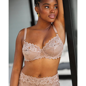 A luxurious reimagining of Sans Complexe's bestselling lace bra, this underwired, unlined bra features the signature Arum lace alongside elegant ribbon lacing and golden hardware details. The 3 part cup design makes this an incredibly supportive bra even for full busts, and this new version has been designed with extra-flat finishings for a more discreet look under your clothing.