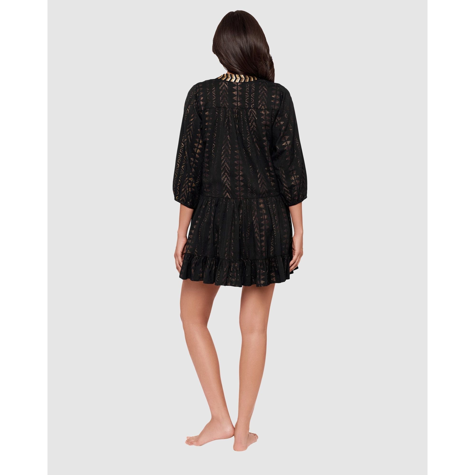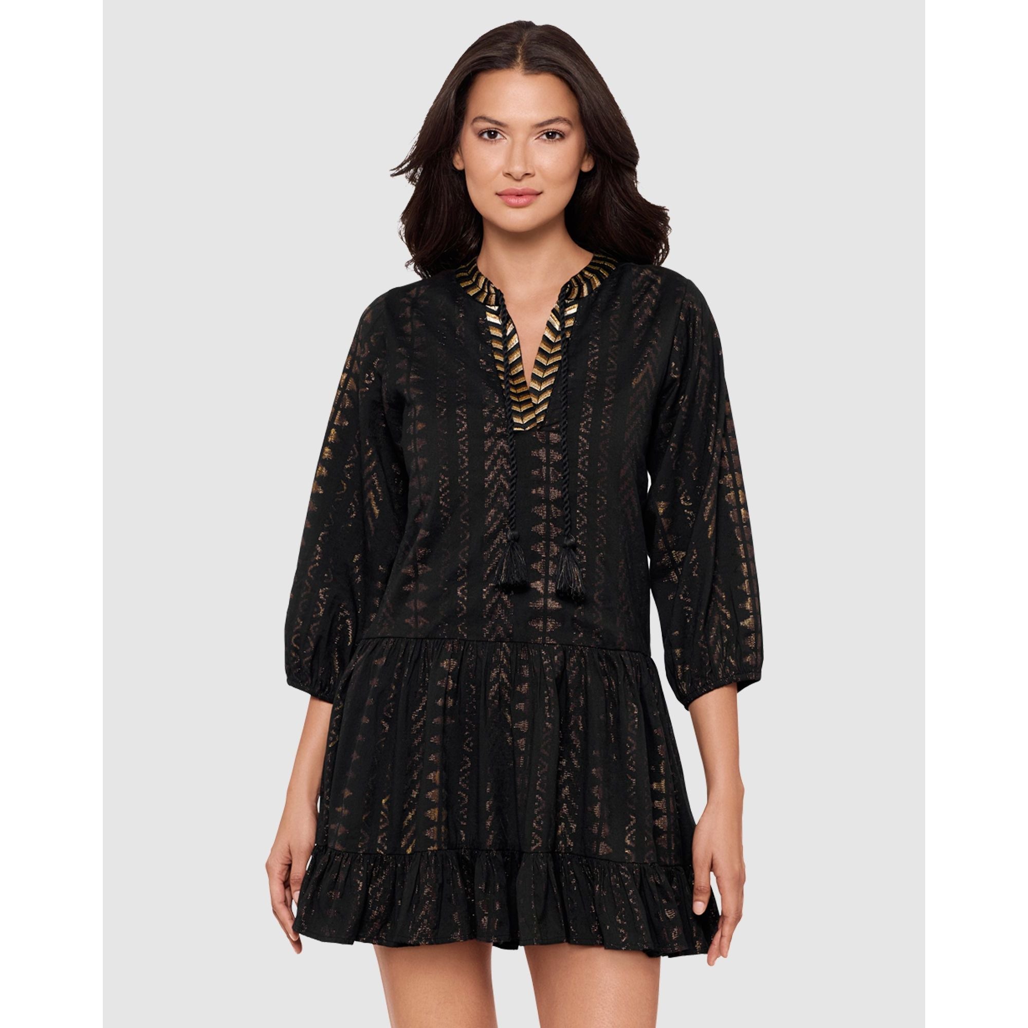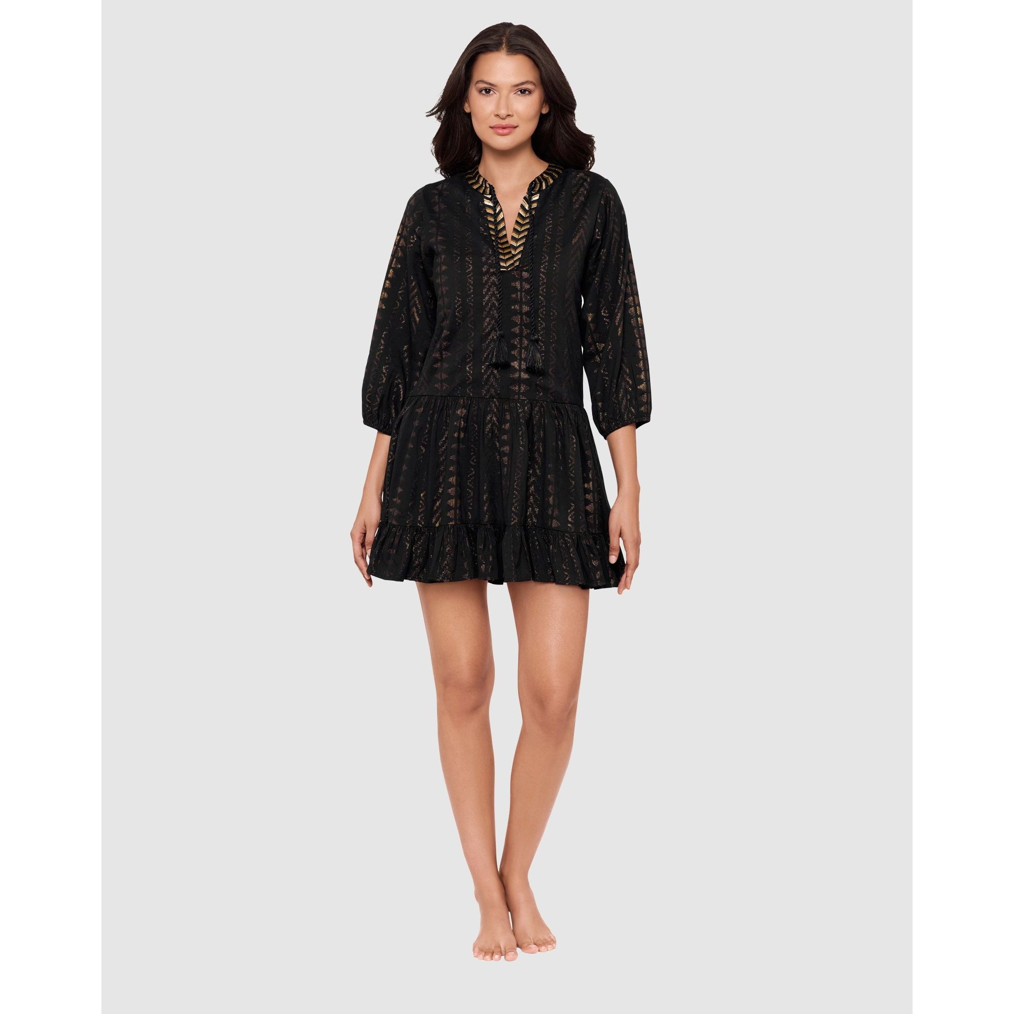 Whether you're attending a glamorous pool party or just want to cover up from the sun, you'll love this luxury beach dress which is made from lightweight cotton voile with a jacquard shimmer, and embellished with two tassels at the embroidered neckline. A high, closable neckline and 3/4 sleeves ensure maximum skin protection without sacrificing on spectacular style.