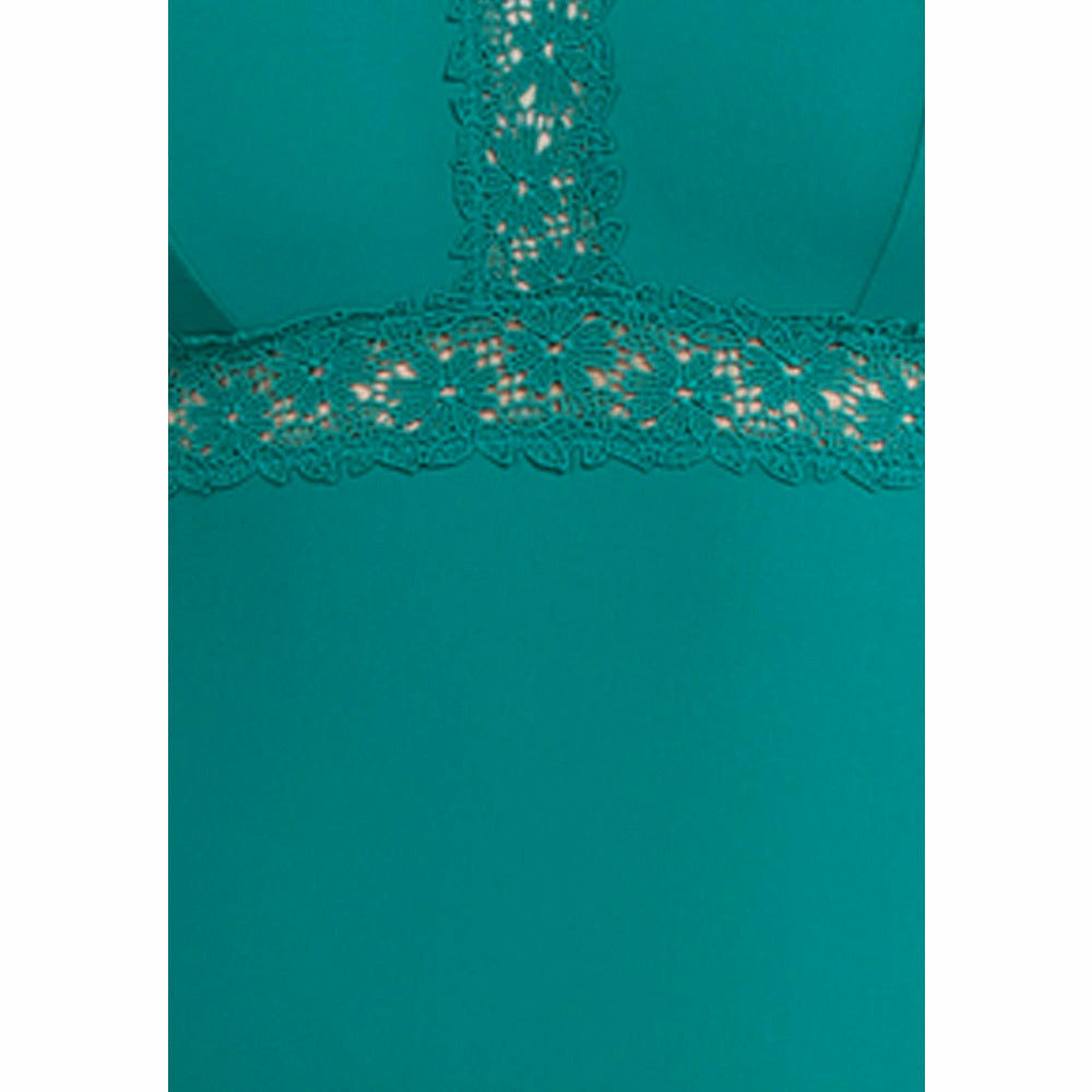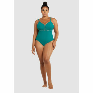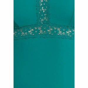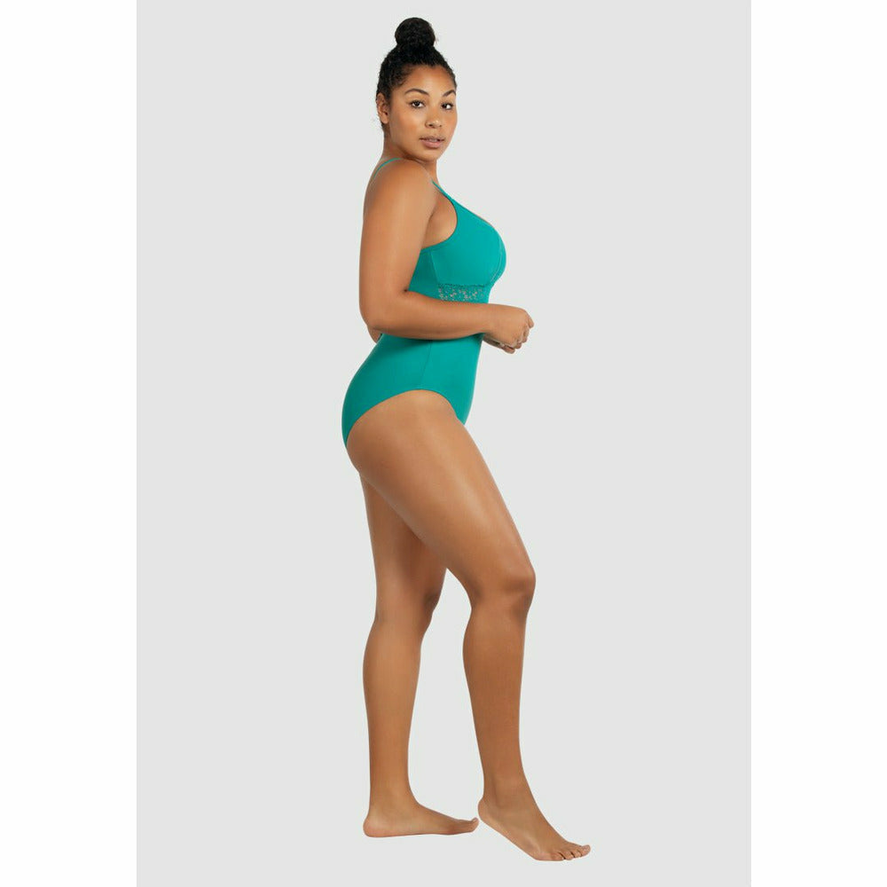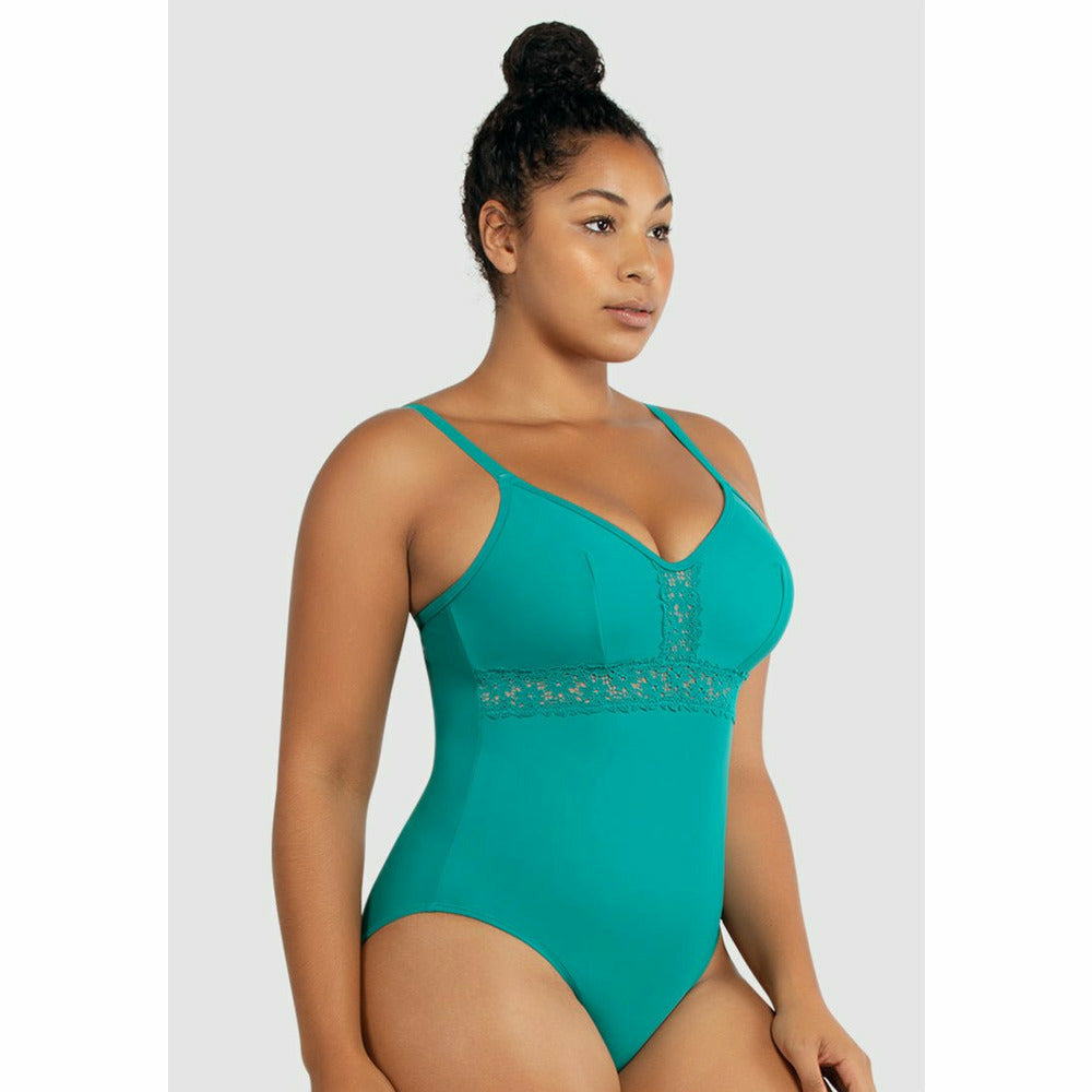 Flaunt your figure in this supportive full bust swimsuit, which is wirefree but features a built-in shelf bra for lightweight lift. Panels of sheer, embroidered lace trim both the front and the V-shaped low back, for a pretty touch that also enhances your curves.
