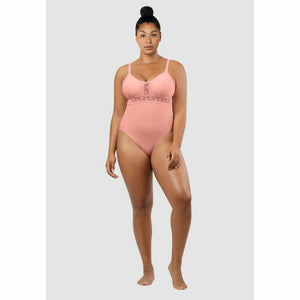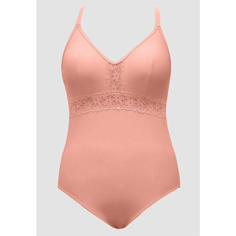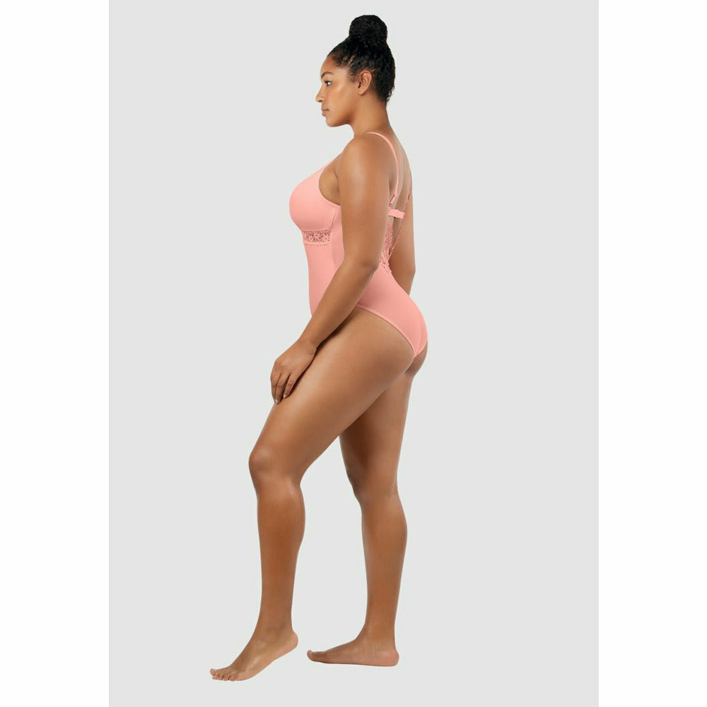 Flaunt your figure in this supportive full bust swimsuit, which is wirefree but features a built-in shelf bra for lightweight lift. Panels of sheer, embroidered lace trim both the front and the V-shaped low back, for a pretty touch that also enhances your curves.