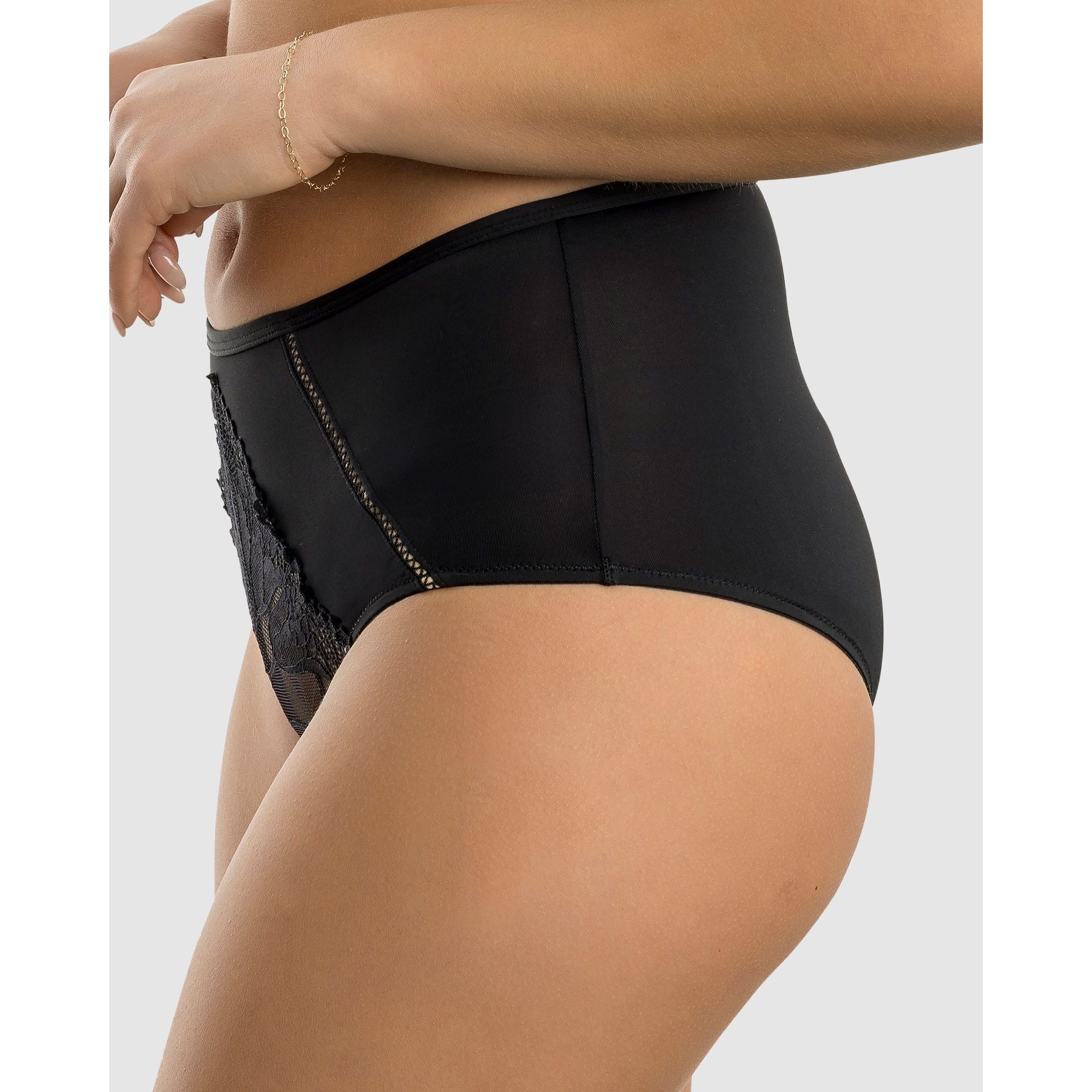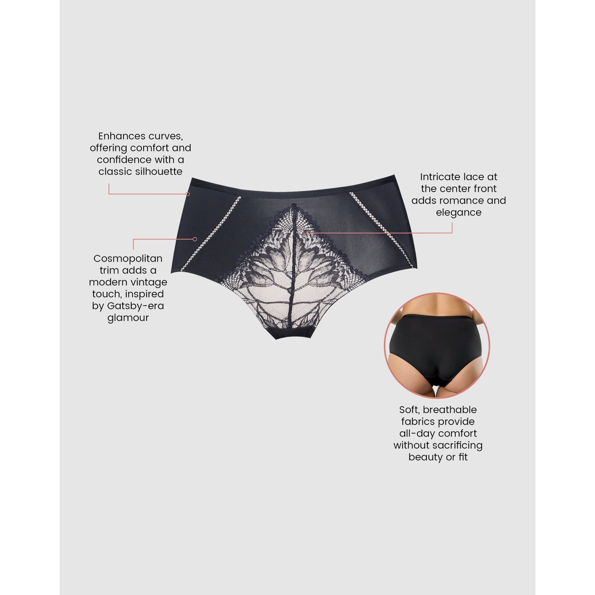Timeless vintage charm meets modern comfort and style with this high waist brief that's crafted from soft, breathable fabric plus a panel of romantic tulip-motif lace at the front. The high waistline offers a smoothing fit under clothes, and it's finished with Art Deco-inspired trims that are angled to enhance your curves.