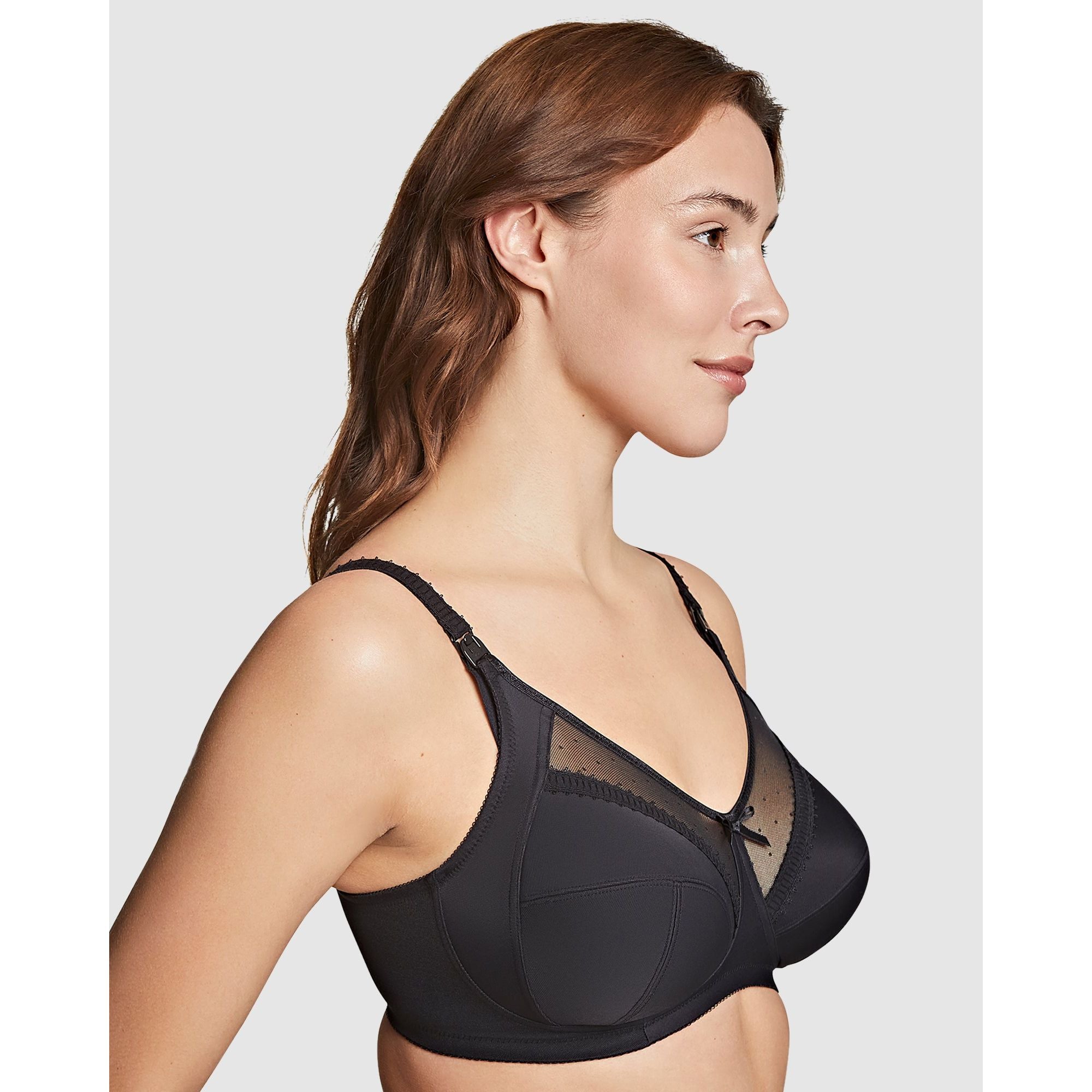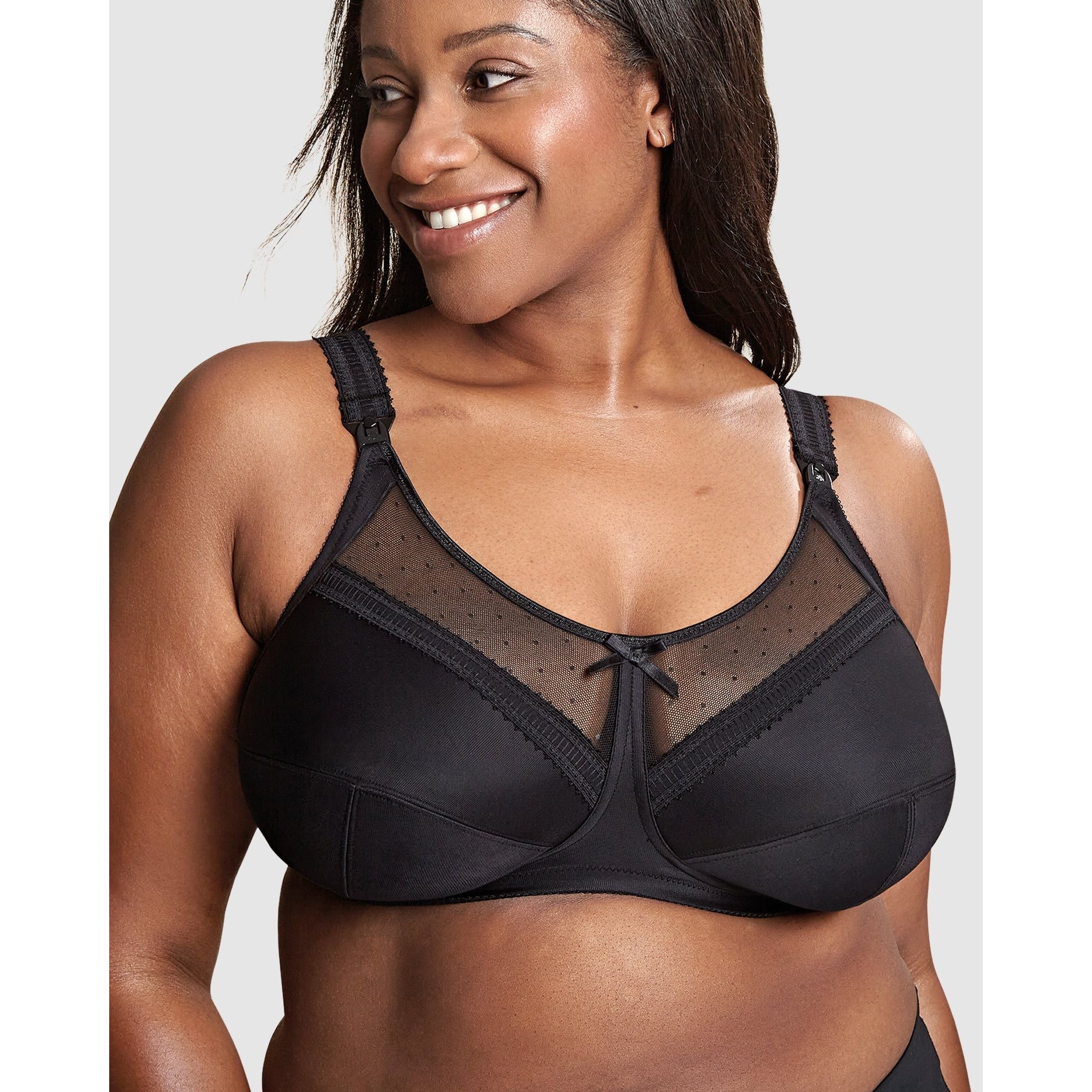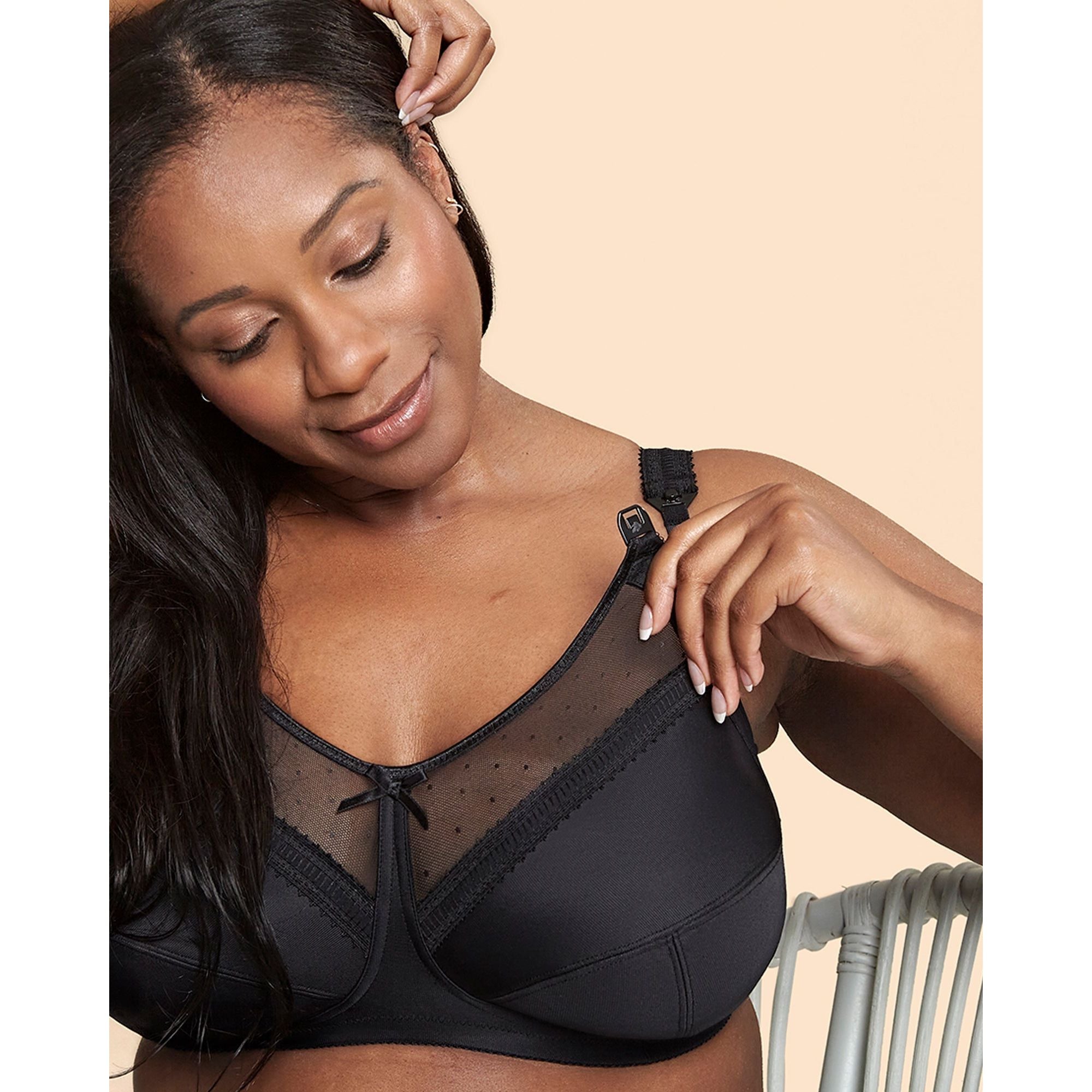Designed especially for full busts, this DD-L cup nursing bra offers the perfect blend of comfort, support, and practicality. The 3-part cup design with side slings lifts and shapes the bust without the need for underwire, and it has easy-release clips to quickly drop down the cups for breastfeeding.