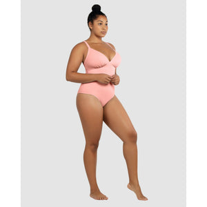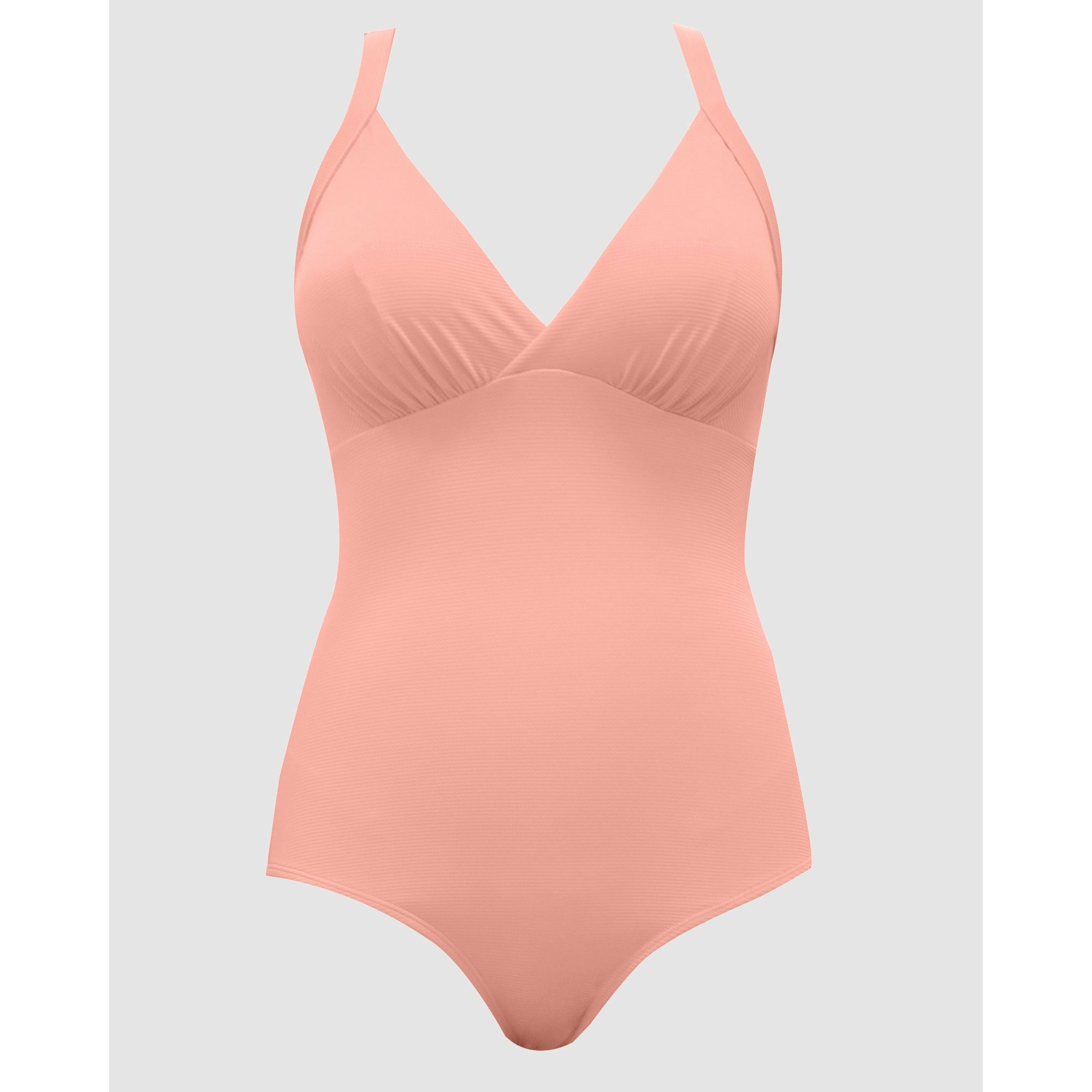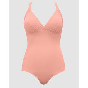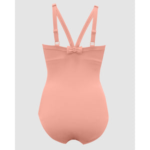 Created by full-bust specialists Parfait, this one piece swimsuit features a cleavage-flaunting plunge V neck, but also a hidden shelf bra with a wide underbust band to deliver lightweight support and keep the neckline in place. It's a high back swimsuit with chic Y-shaped shoulder straps, culminating in a minimalist bow adornment.