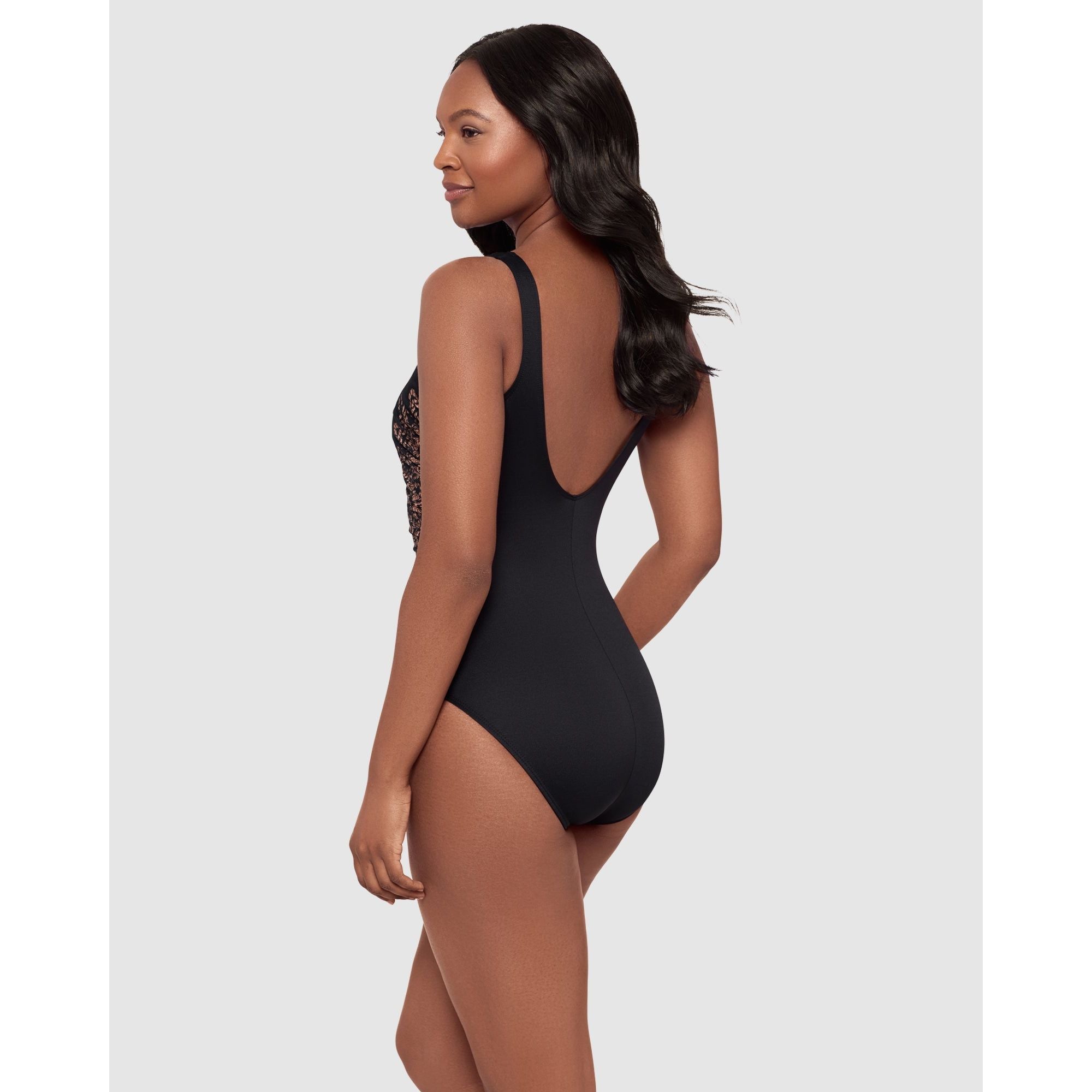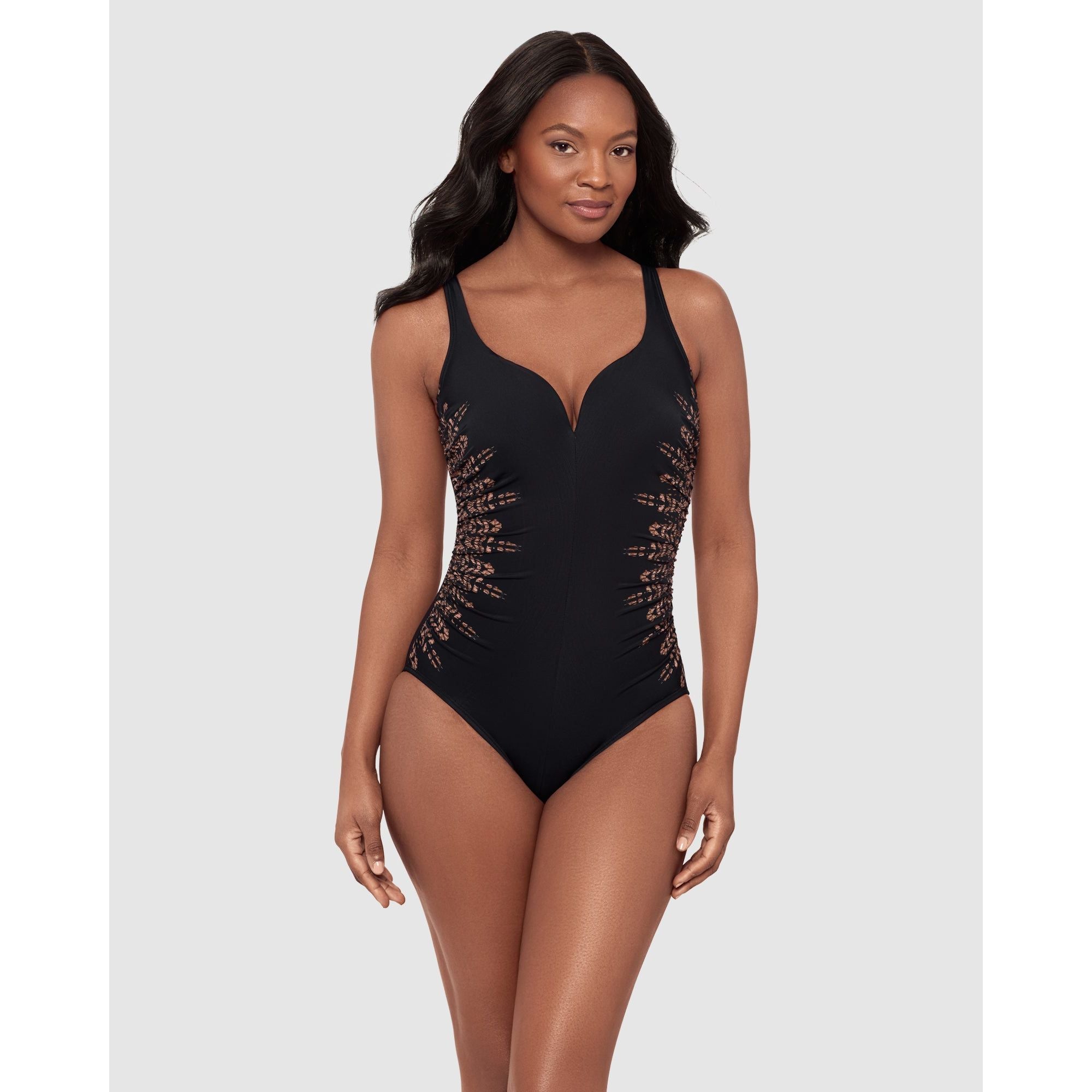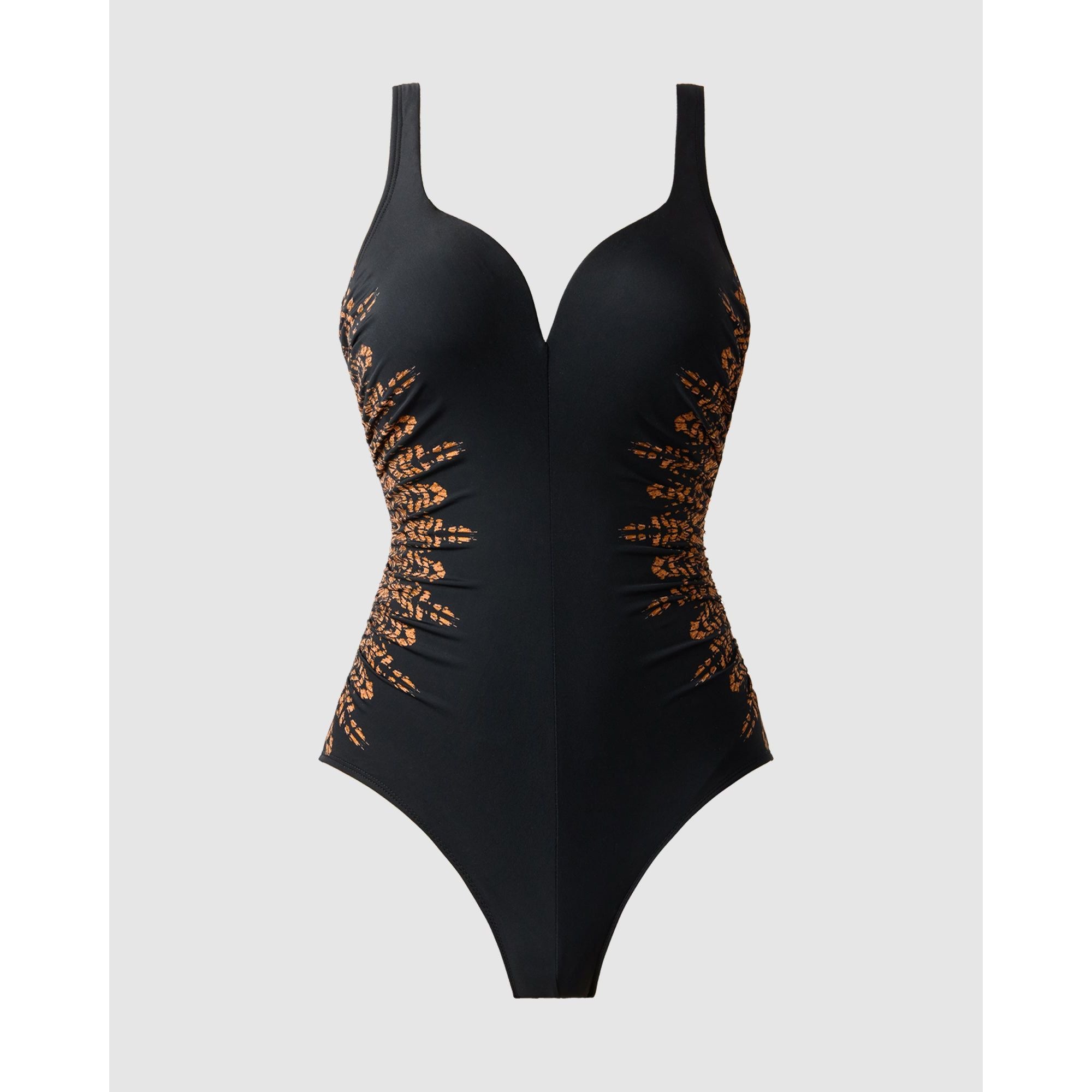 Get instant curves with this tummy control swimsuit, made from slenderising Miratex® fabric to deliver ultra-firm control without restricting your movement in any way. The cleverly-curved side print details and waistline ruching create the illusion of an hourglass figure, while the low plunge neckline beautifully frames and flatters your décolletage.