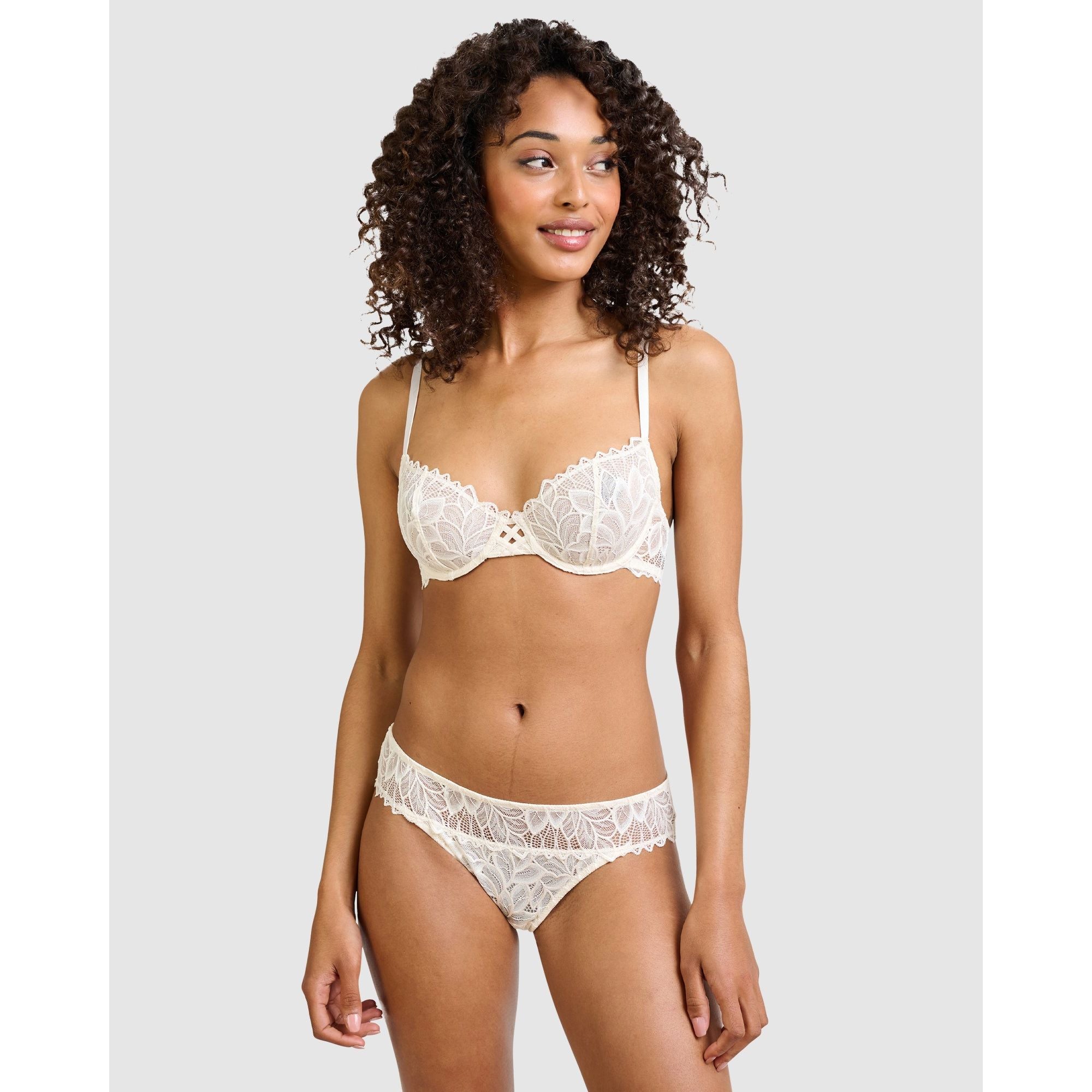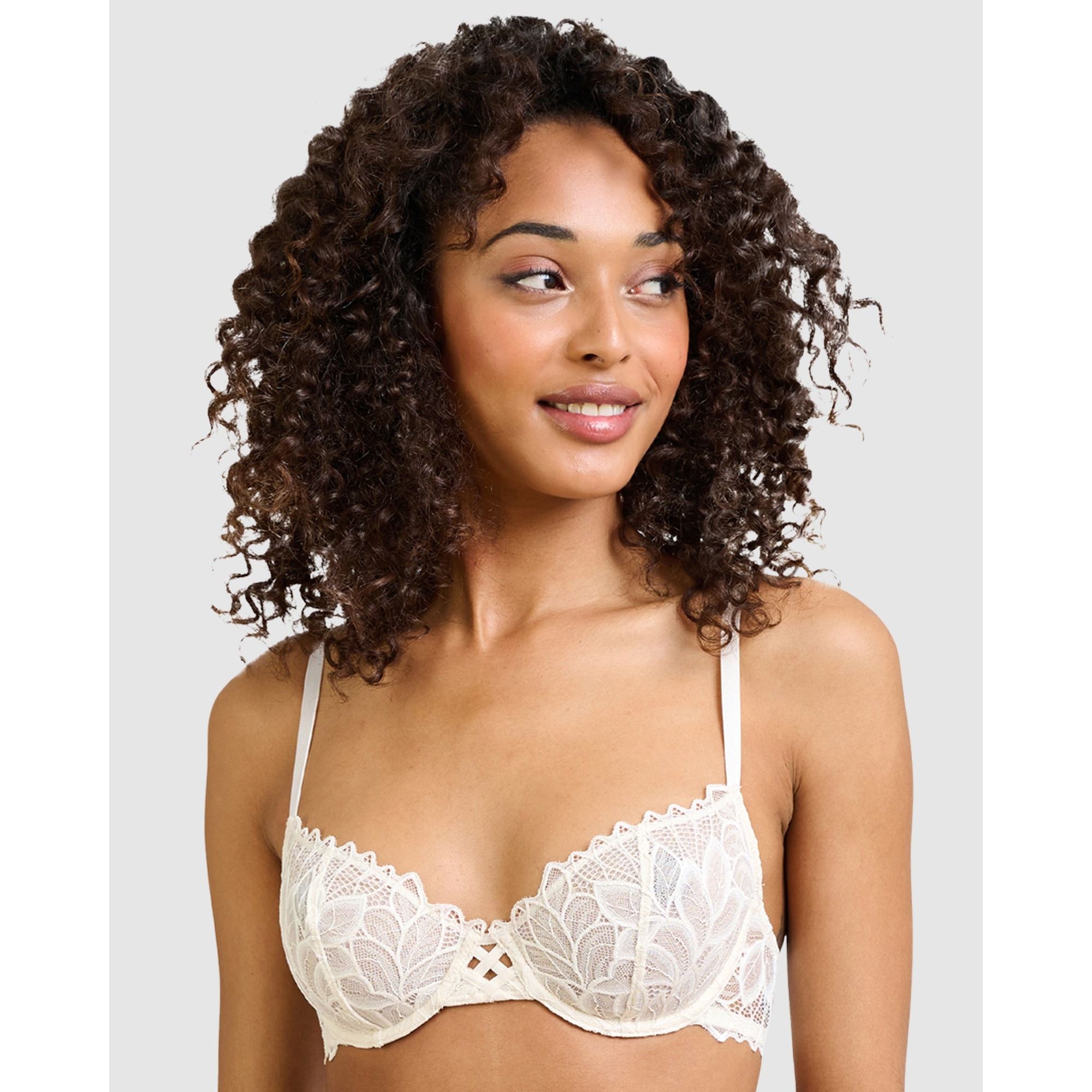 Elegant and feminine, this sheer lace bra features a leafy pattern that creates a scalloped edge along the neckline, interrupted by a chic cut-out detail at the centre front. The classic balconette bra shape is uplifting and works well under most necklines, for a statement design you don't need to save for special occasions.