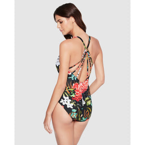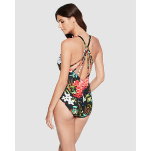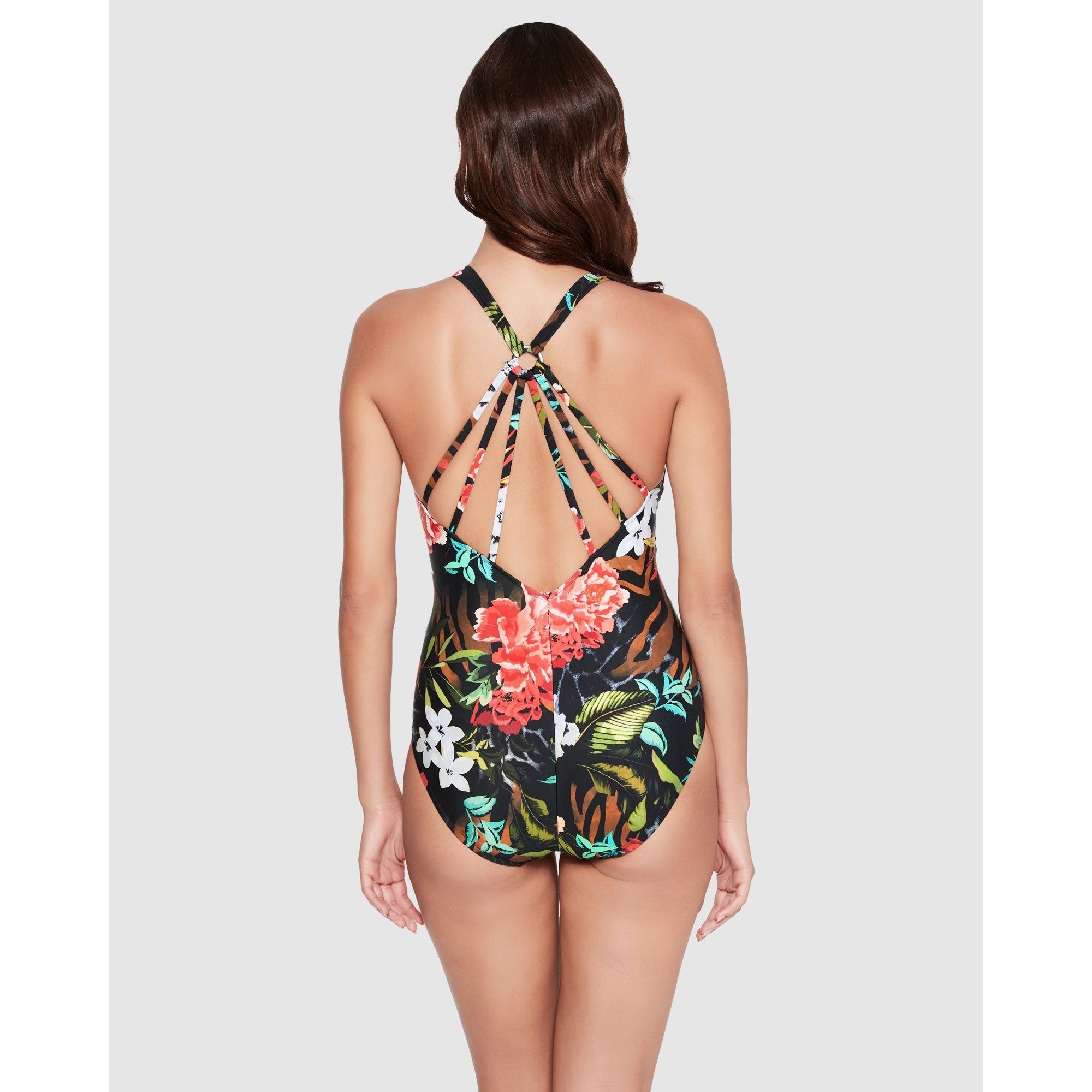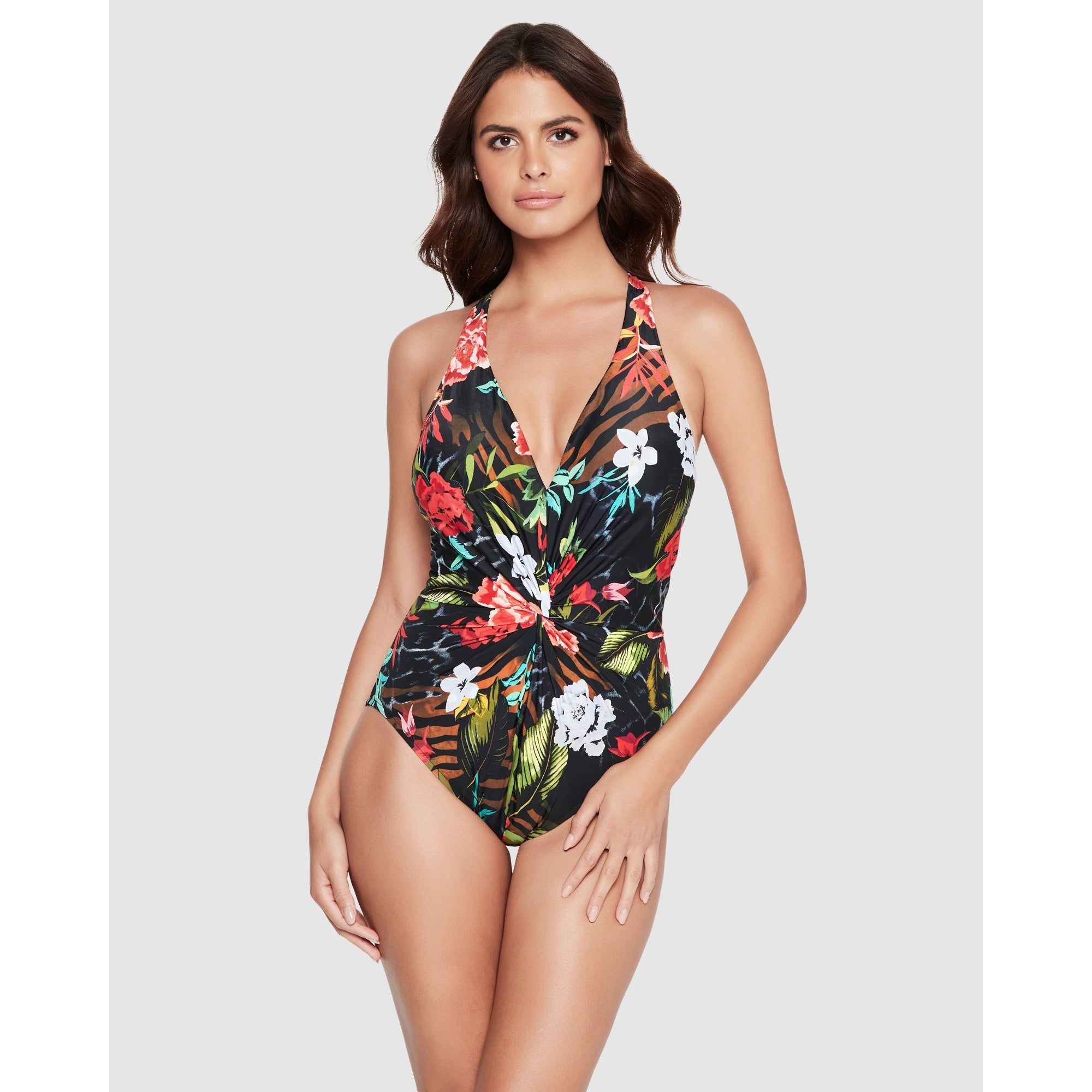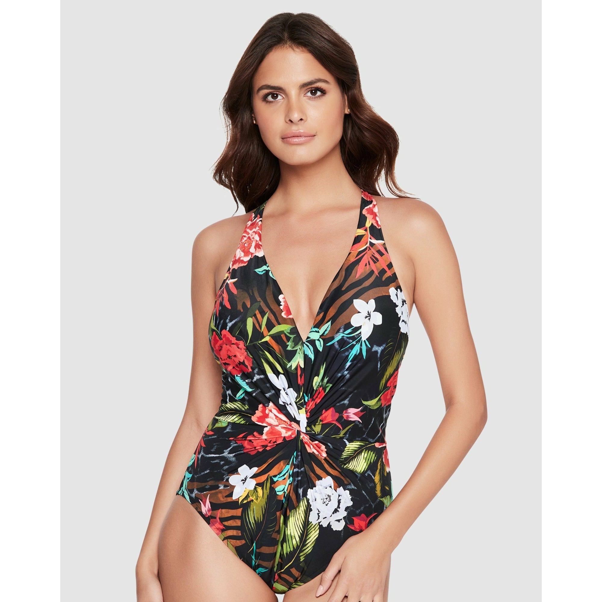 Get instant curves in this incredibly waist-flattering swimsuit, which features a chic knot detail on the front to draw the eye inwards at the waistline. Made from smoothing, slimming fabric, it's a halter swimsuit with a strappy back design, and has removable padding plus an exposed elastic underband to deliver comfortable, wirefree bust support.