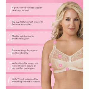 As stylish as it is comfortable, this full figure bra with embroidery has unlined, 4-part cups with side slings that lift and support the bust while narrowing your silhouette. A tall powernet band with flexible boning at the sides boosts the support of this wireless bra even further, while the U-shaped back ensures the straps stay perfectly put on your shoulders.