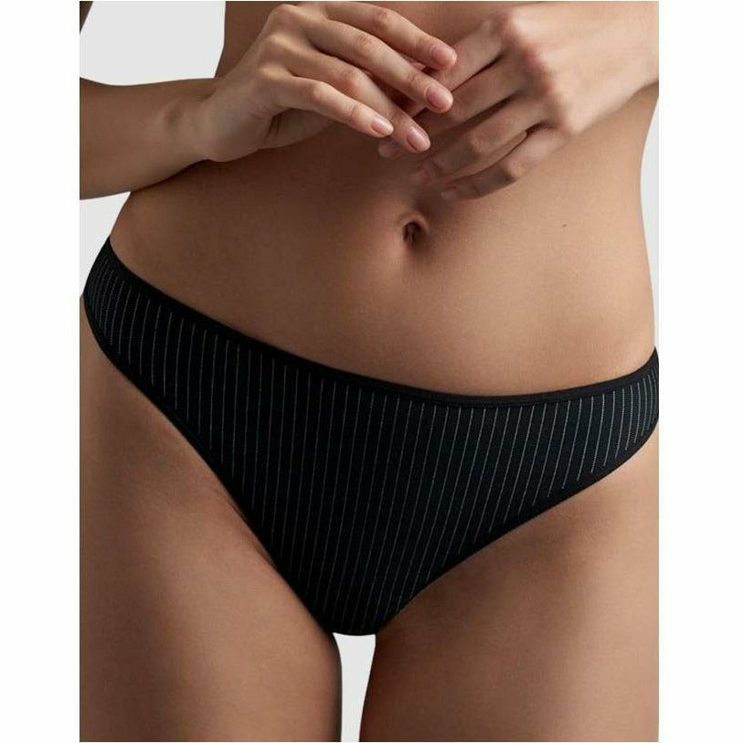 Unleash your inner CEO with the suit-inspired Gloria 4cm Thong by Marlies Dekkers. Made from pinstripe fabric, it features a stylish cut-out back with elastic and faux leather detailing that's reminiscent of menswear suspenders.