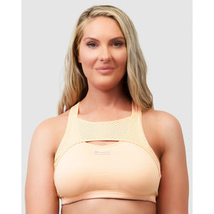High impact support meets a stylish look in this Champion X Shock Absorber sports bra, which significantly reduces bounce by up to 65.2%. A double-layered but still very breathable sports bra, it has moulded, padded cups plus a mesh panel across the upper bust to further boost support.