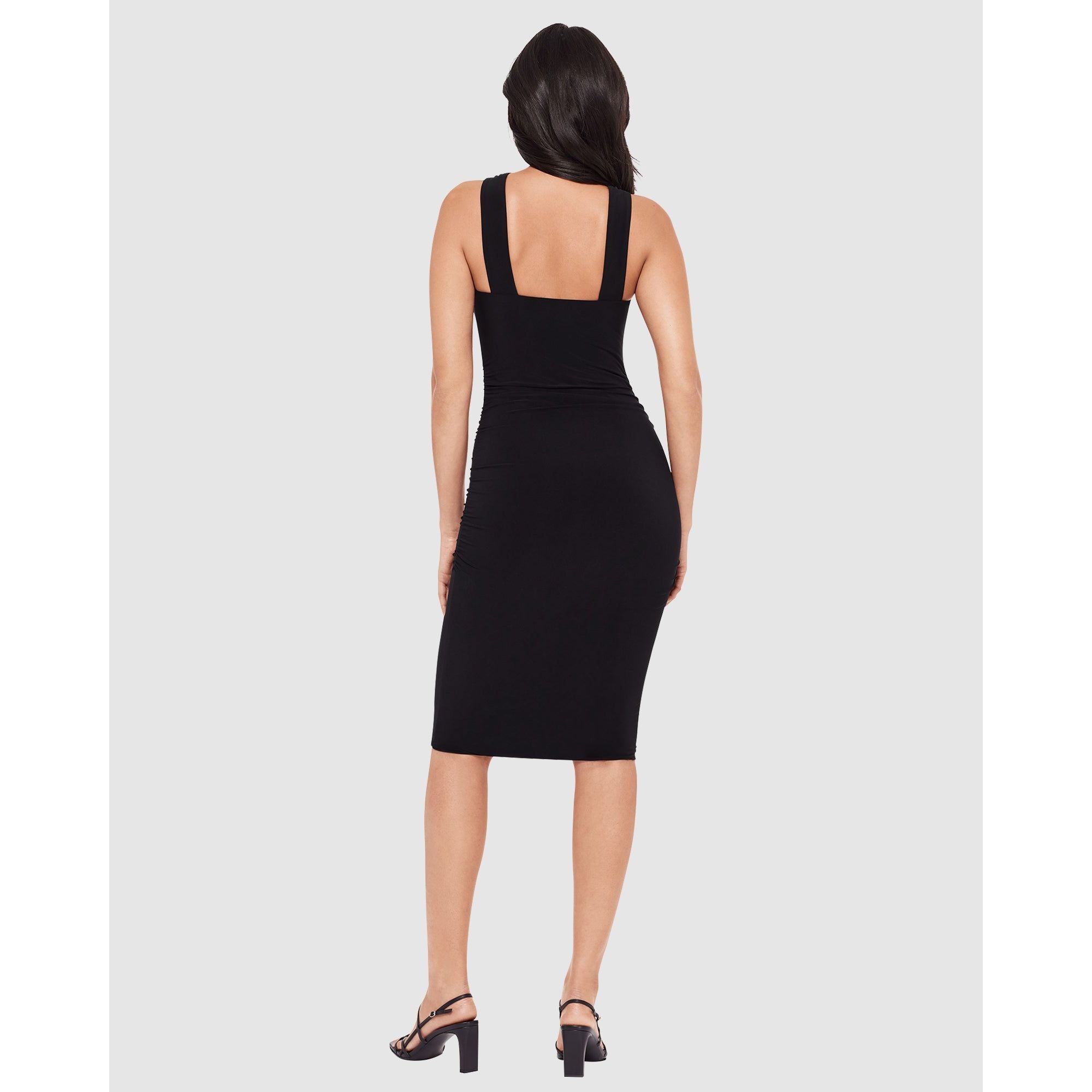 Make an entrance in this sculpting bodycon dress, designed with a unique halter-look notched neckline that bares your shoulders, plus a hidden Miratex® 360° Shaping Net layer that smooths and shapes from top to bottom. This stylish shapewear dress also features a built-in shelf bra with removable cups, so you can wear it with or without a separate bra.