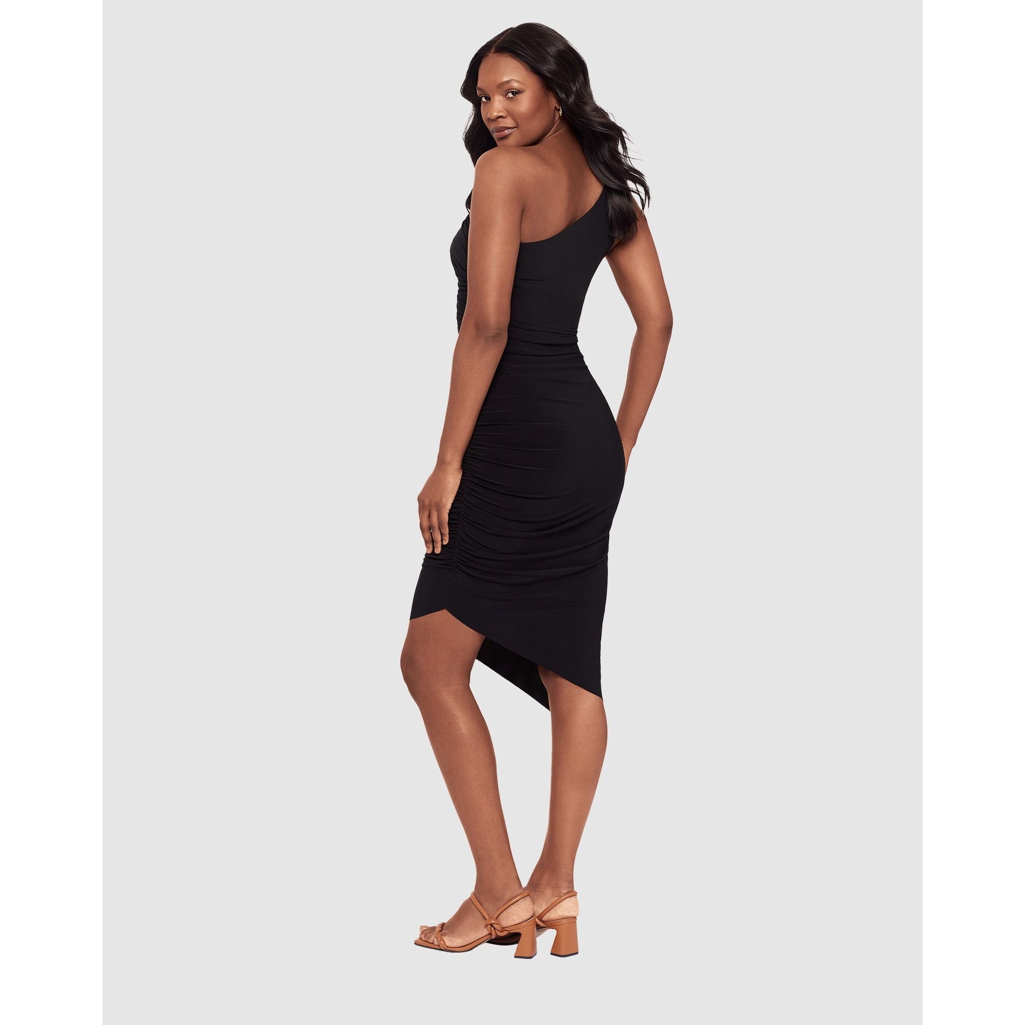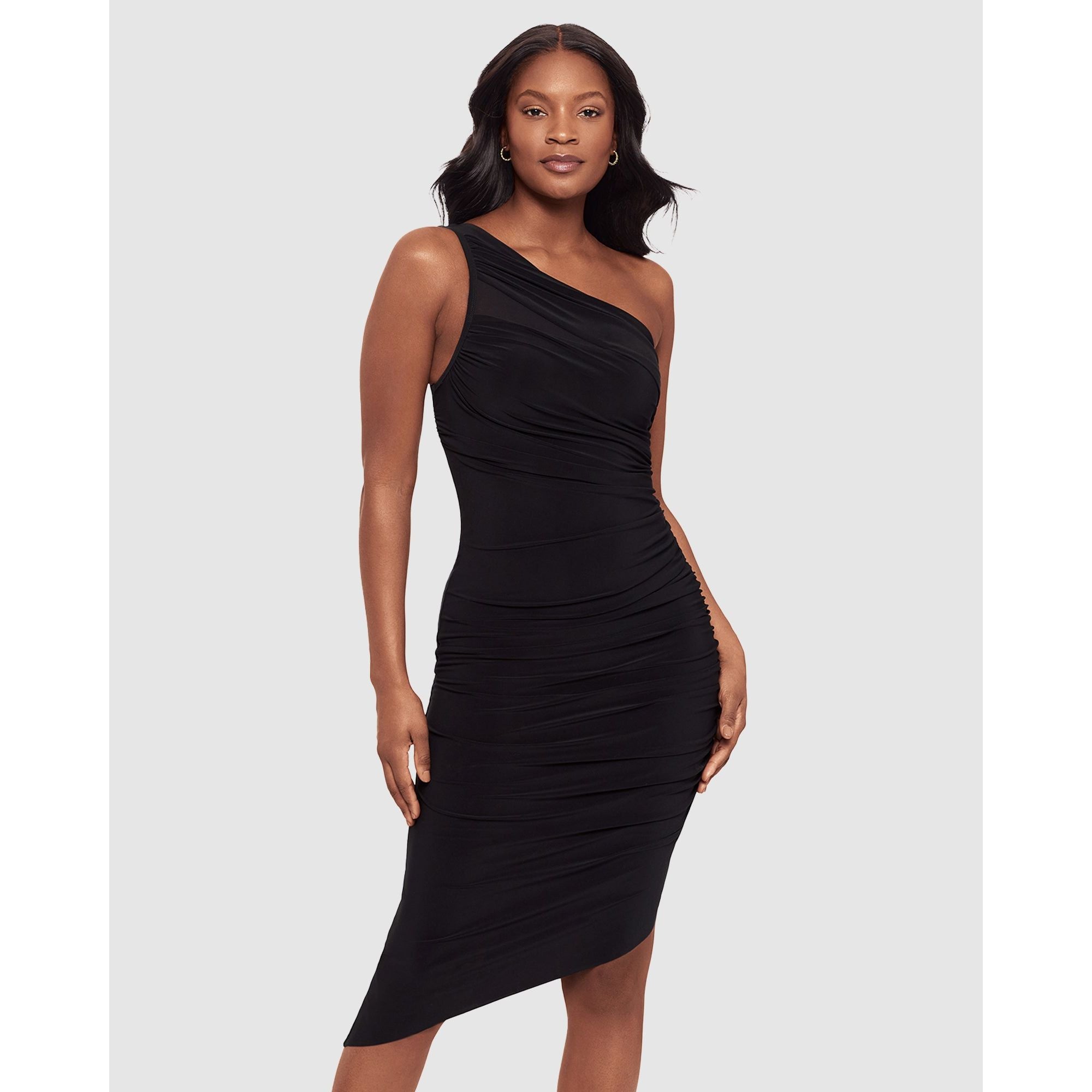 Perfectly balanced between effortless ease and curve-sculpting drama, this one shoulder, asymmetric hem dress is crafted from MiraMatte Jersey 360° shaping fabric that's shirred in all the right places for a cinched hourglass look the moment you slip it on. Design details include a mesh panel at the shoulder and a built-in shelf bra for fabulous bra-free support.