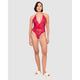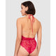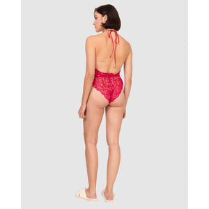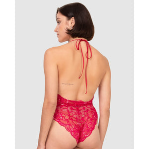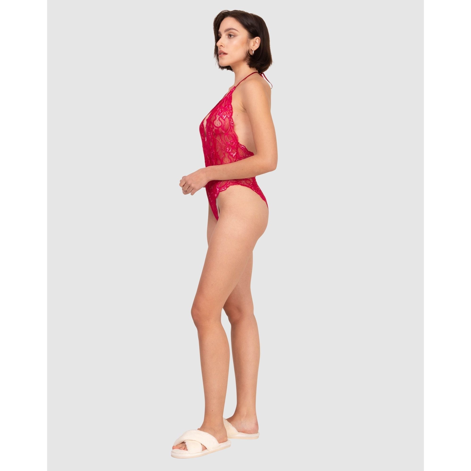 Turn up the heat in this sexy bodysuit, made from all-over stretch lace and designed with a plunging V neck front, low back, and ultra-high leg cut that flatters all figures. It's also a halter bodysuit secured by thin satin ties behind the neck, allowing you to easily adjust the fit and support level.