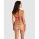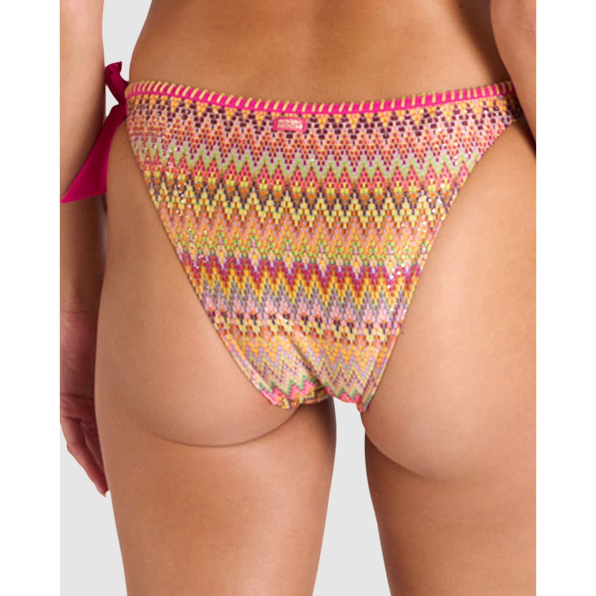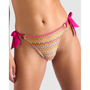 Full of vibrant colour and with a hint of shine, this fun side tie bikini bottom has a chevron print and is trimmed with contrast stitching along the waistline. The side ties are attached via bamboo ring details, and the cheeky-cut back is finished with a Banana Moon logo detail.