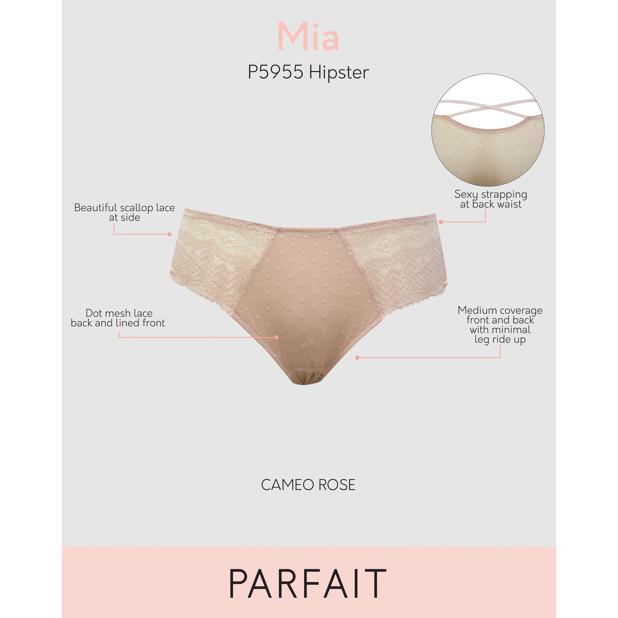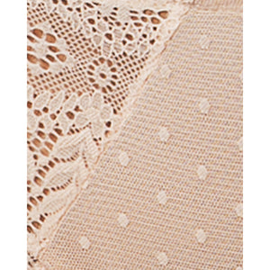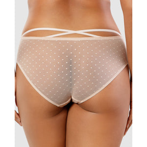 Perfect to pair with both the Mia Dot and Mia Lace ranges by Parfait, this hipster brief is made from a combination of sheer dotted mesh and sheer lace, with a lining at the centre front. Offering medium coverage and minimal ride up, it's great for everyday wear but sexy too thanks to the criss-cross strap detail at the back of the waist.