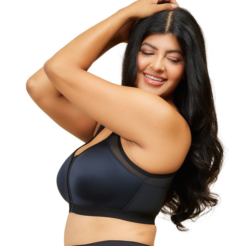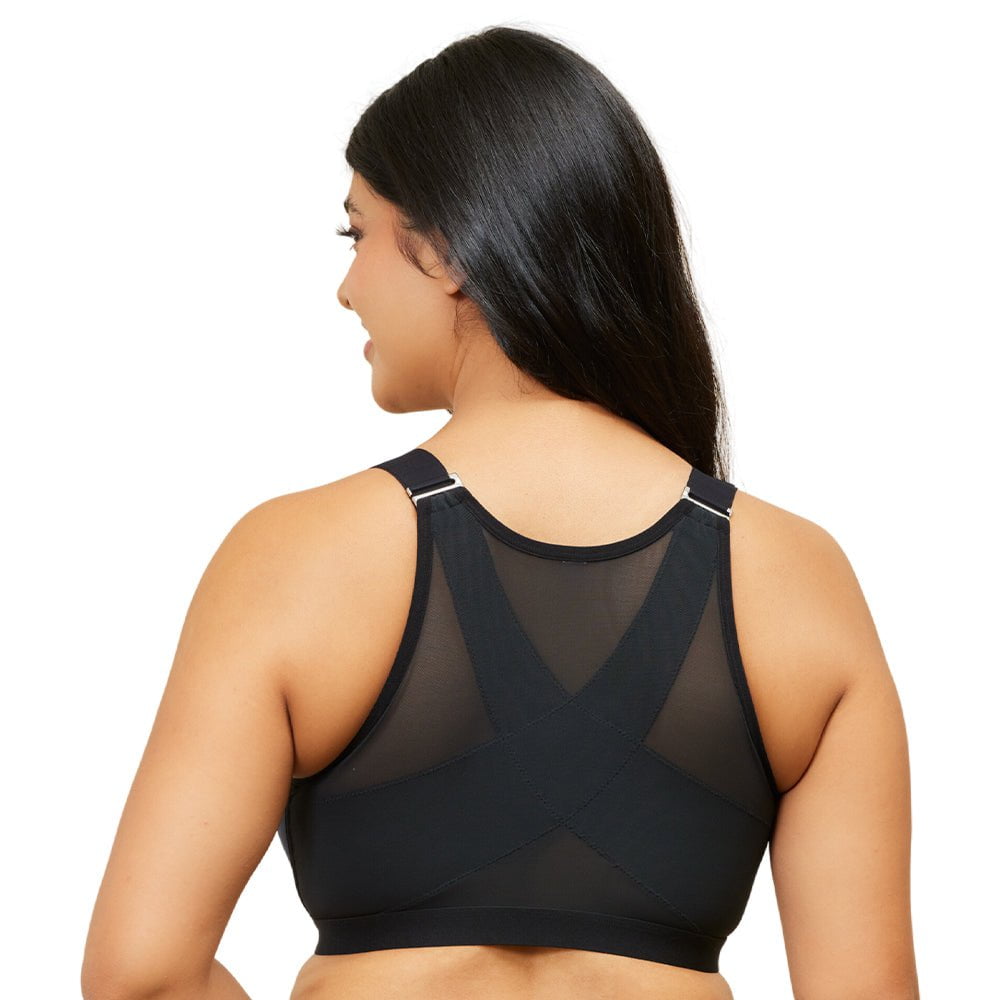 Get 360° support and smoothing in this wireless plus size bra, which functions as both a back smoothing bra and a posture support bra thanks to the powerful criss-cross mesh panels at the back. Despite the fantastic support, this front open bra feels light and breathable thanks to the moulded spacer-foam cups, for easygoing everyday comfort you can rely on.
