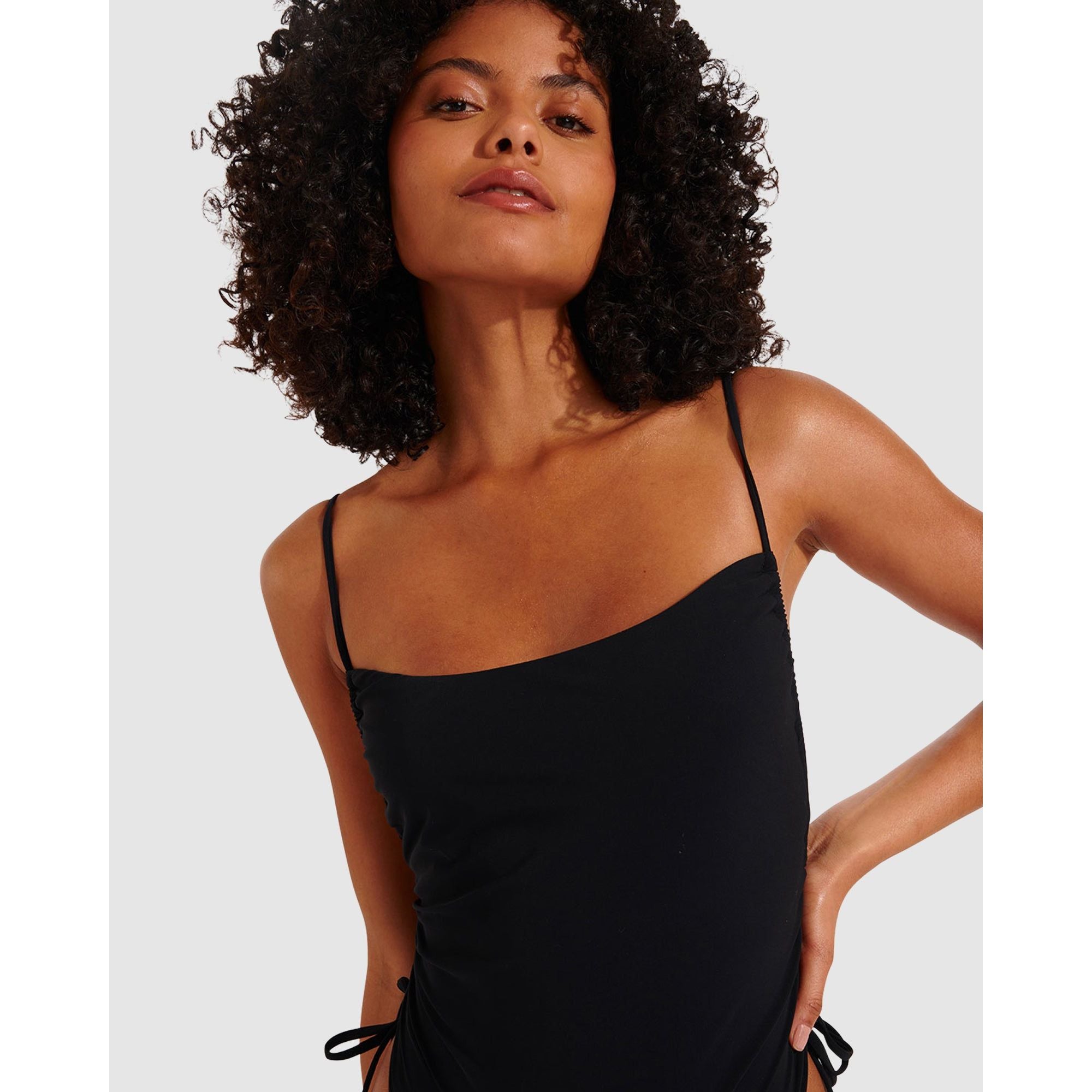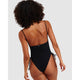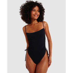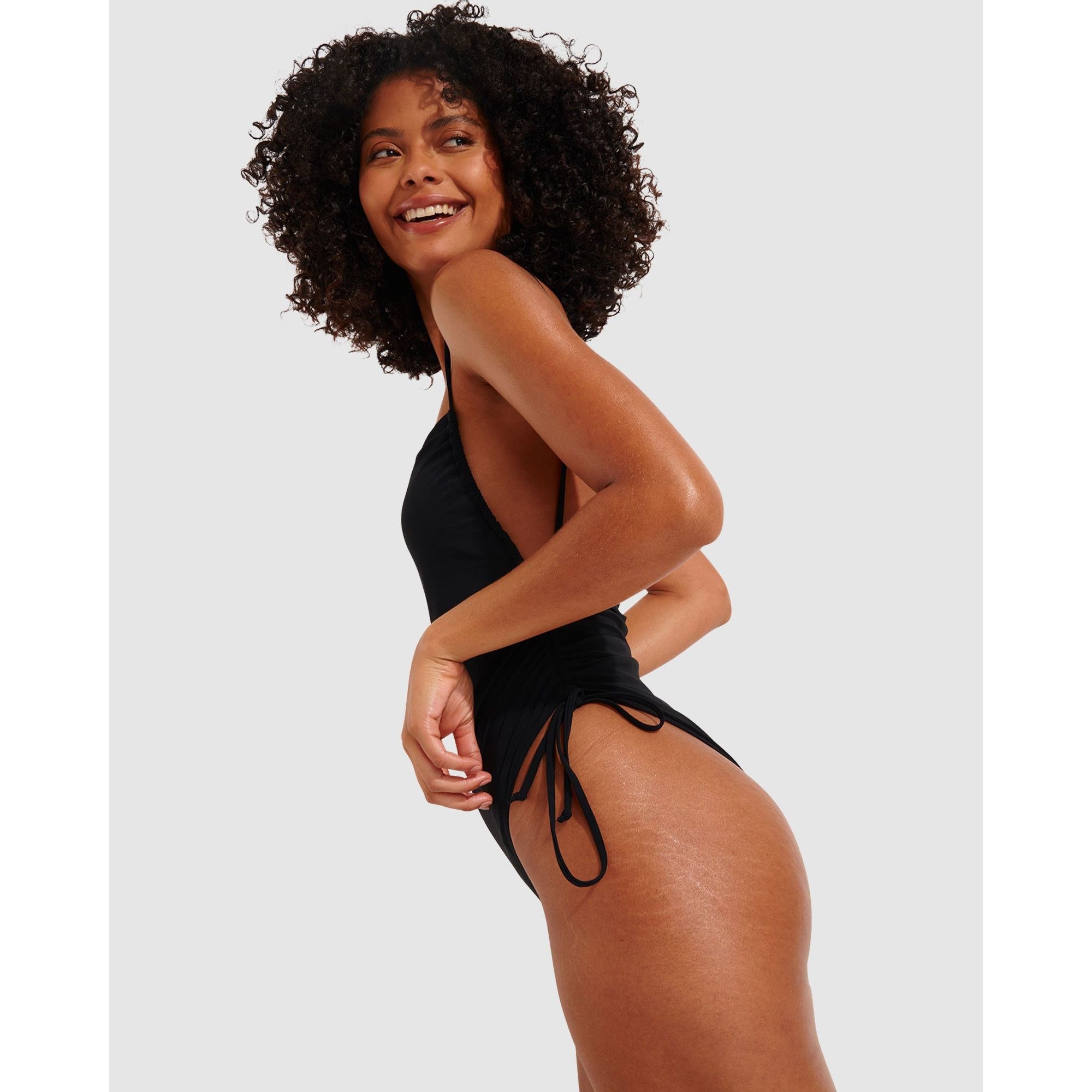 Go for modern, laid-back cool at the beach in this minimalist swimsuit, with its high-cut leg line and low back shape. Adjust the narrow straps using the ties at either side, which also control just how much hip curve you want to flaunt!