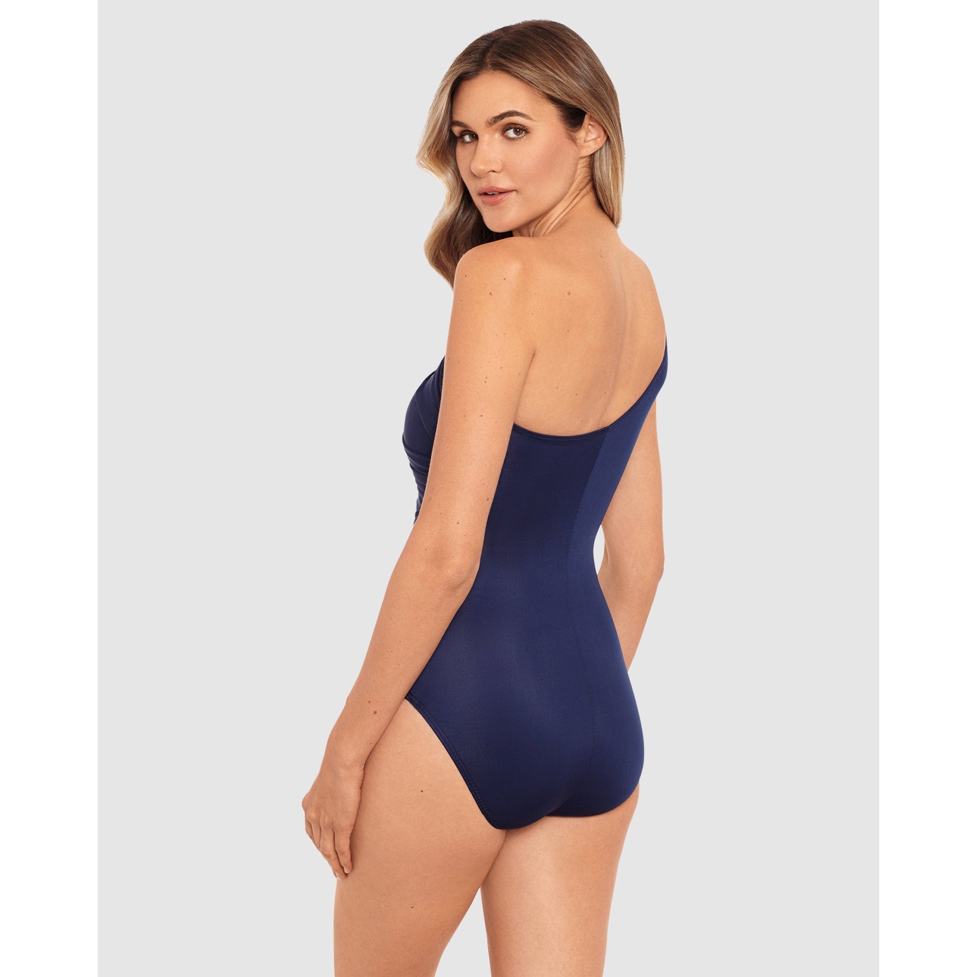 Feel fabulous at the beach in this one shoulder swimsuit with built-in shaping. Miraclesuit's Miratex fabric provides all-over control without the need for bulky lining panels, for as slim and sleek a silhouette as possible. Asymmetric panels of mesh and shirred fabric also help to create the illusion of hourglass curves. This control swimsuit also includes a hidden wireless shelf bra, for comfortable support and bust coverage.