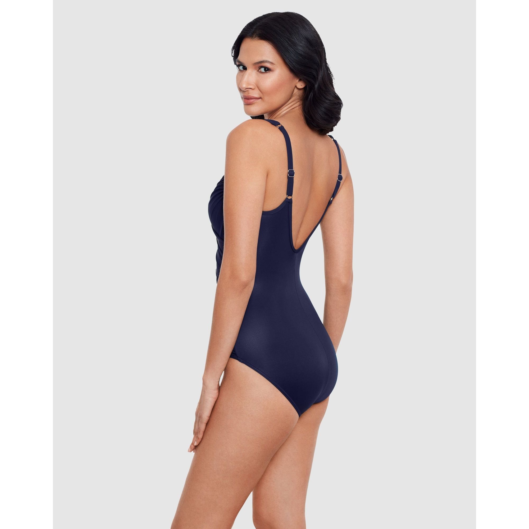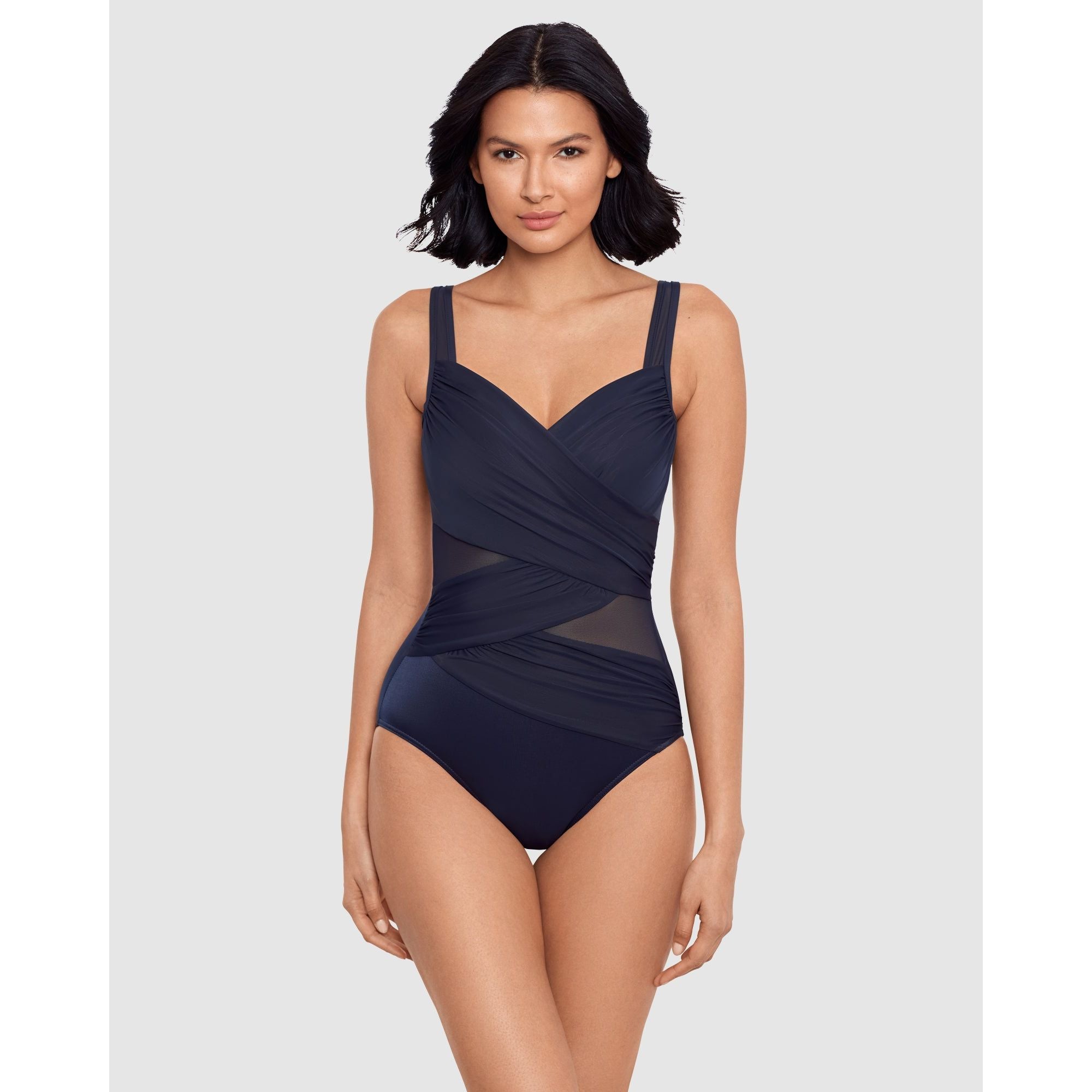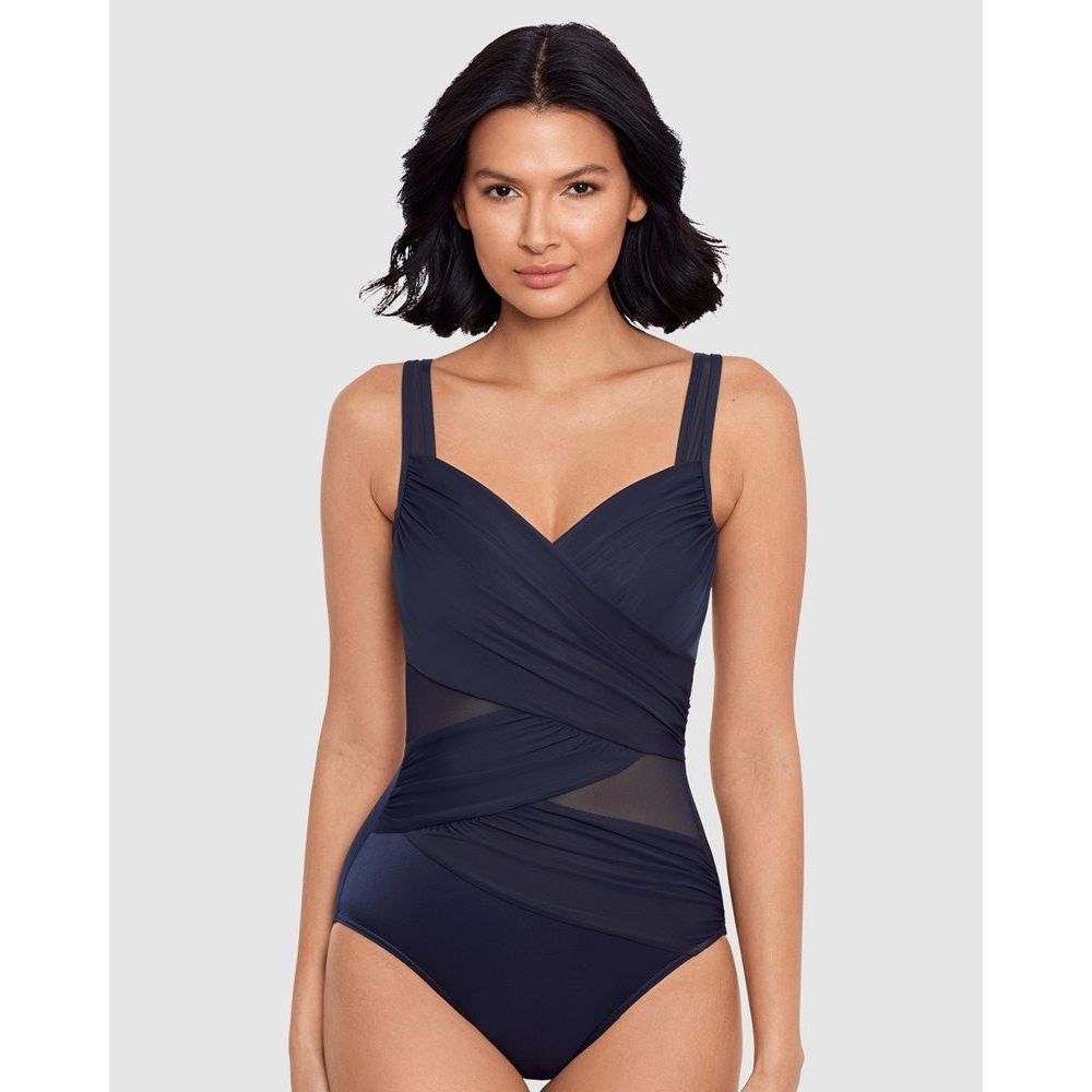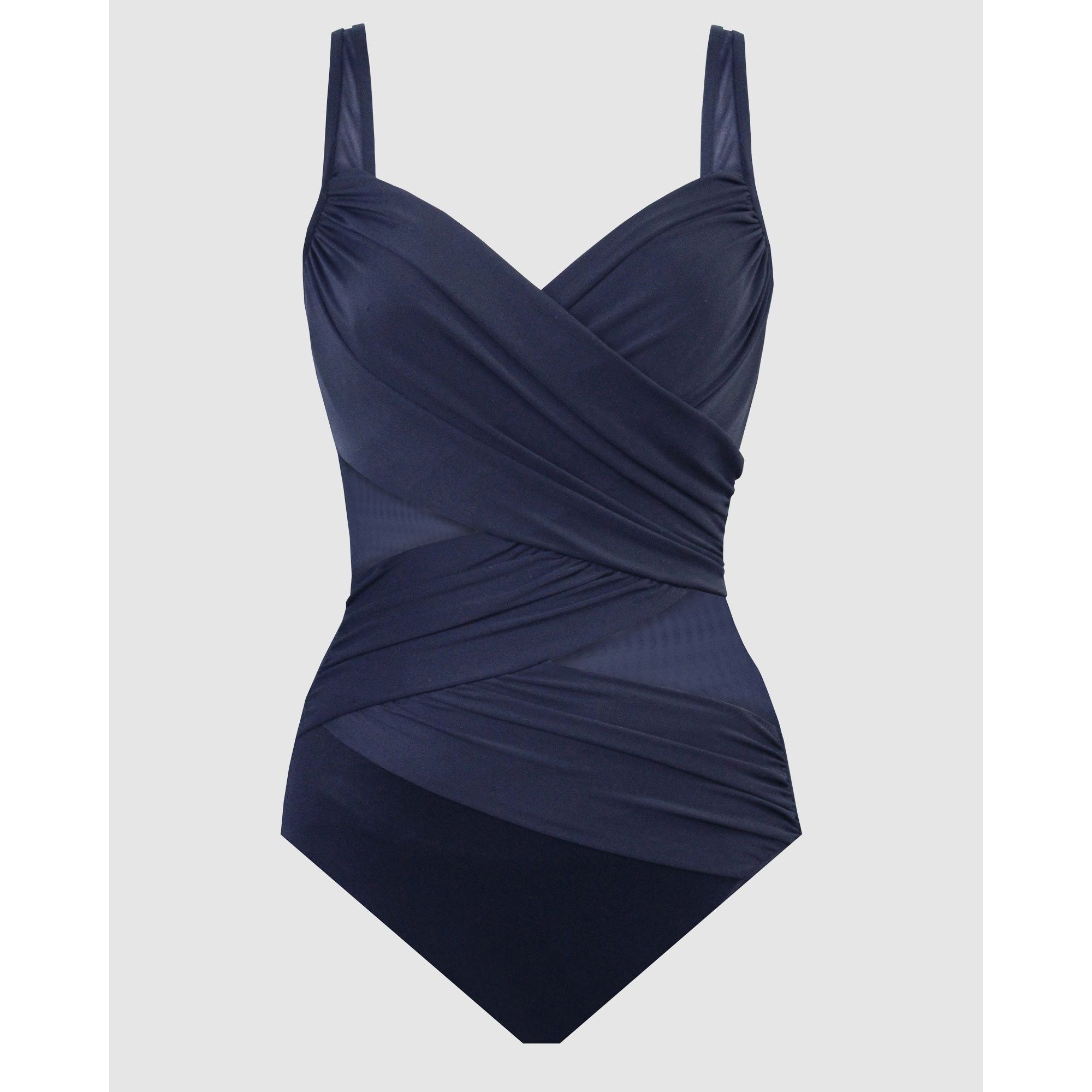 Slip into an hourglassier new you with this stylish tummy control swimsuit, which uses a combination of clever draping, illusion mesh panelling and shaping Miratex® fabric (with 3x the control of regular swimwear fabric!) to smooth, slim and enhance your figure. It's an underwired swimsuit sized especially to fit a DD cup, and has adjustable straps to ensure a flawless fit.