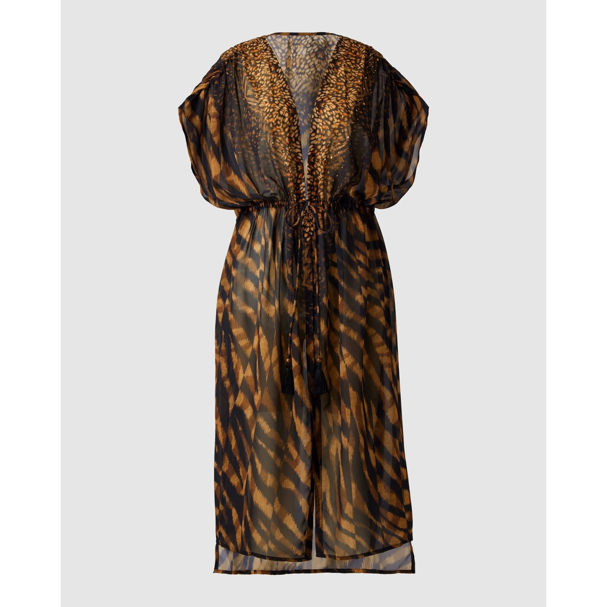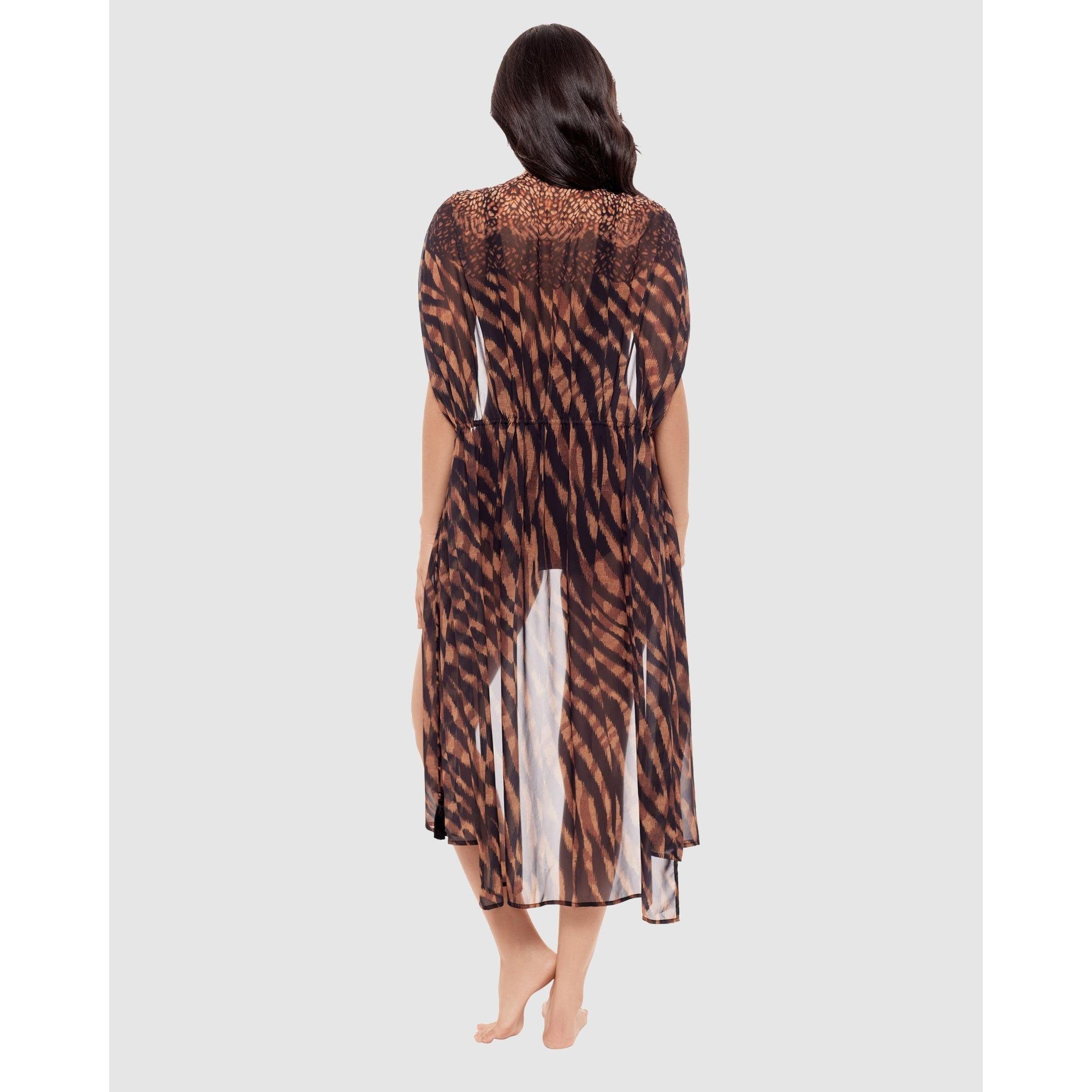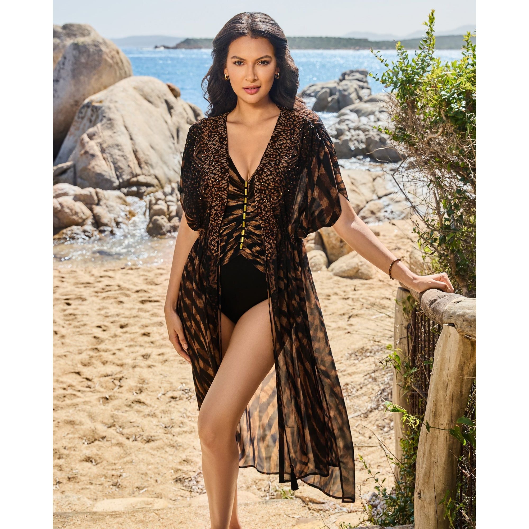 Perfect for pool parties, resorts, or just looking fabulous at the beach, this swim cover up is as comfortable as it is chic thanks to the easy, open-fronted fit which ties at the waist. Scattered crystals around the neckline and the beaded tassel ends on the waist ties both add a luxury vibe to this sheer beach robe - pair it with your favourite little black swimsuit, or wear it with the matching swimwear from the same collection.